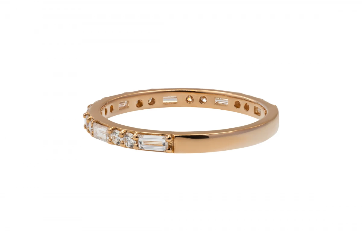 This elegant 18ct rose gold wedding band features a dazzling combination of baguette and round brilliant cut diamonds, offering a total carat weight of 0.66ct.