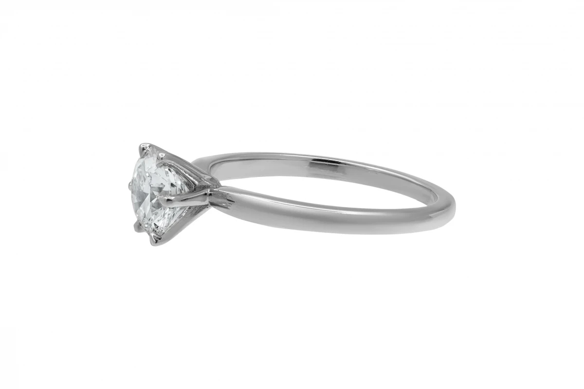 Graded F colour and VS1 clarity, the diamond offers superb brilliance and fire. This elegant solitaire design, in size L and weighing 3.1g, is a perfect symbol of love and commitment.