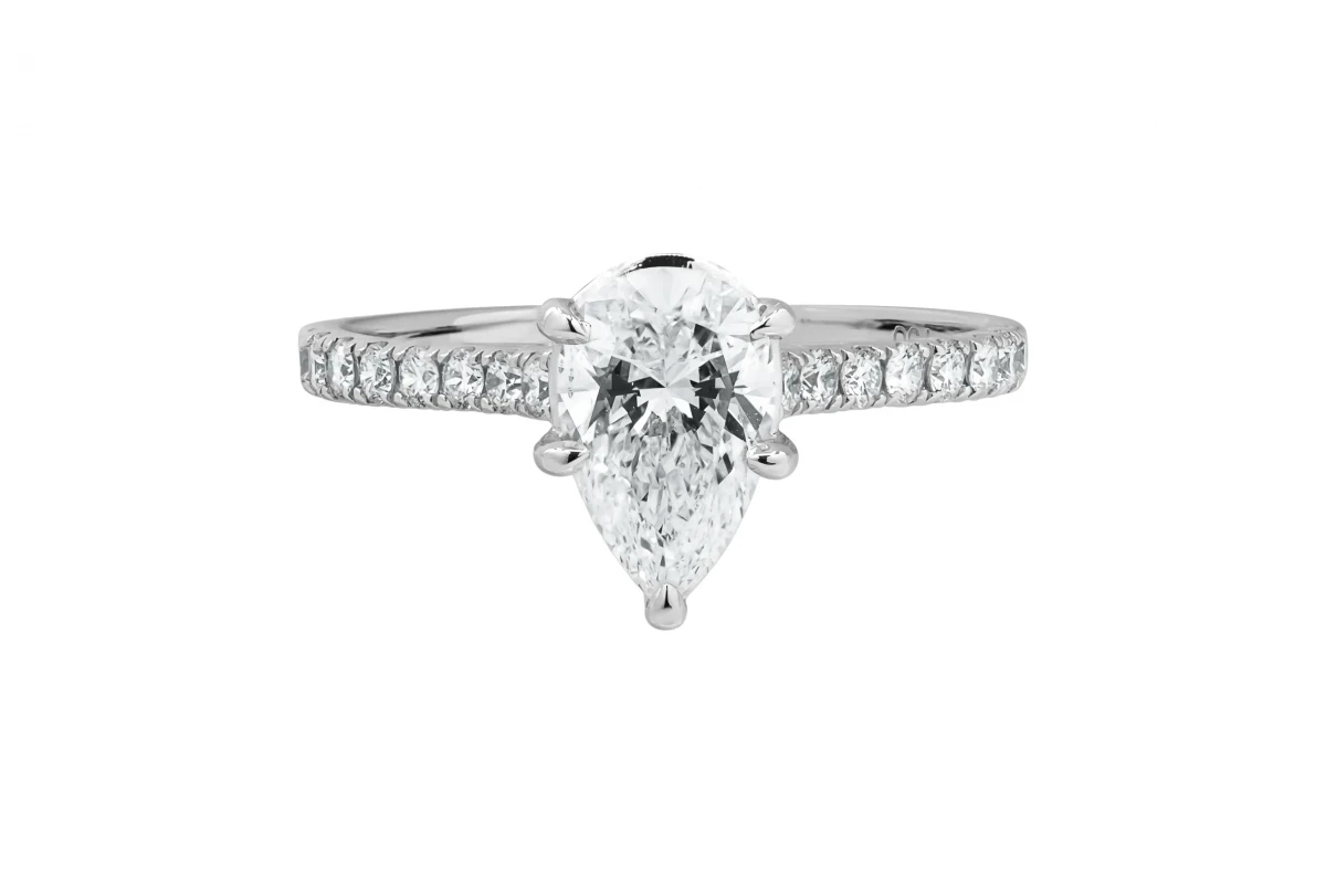 This elegant 18ct white gold engagement ring showcases a stunning 1.01ct pear-shaped lab-grown diamond as the centrepiece, enhanced by a delicate 0.15ct hidden halo mount for added sparkle.