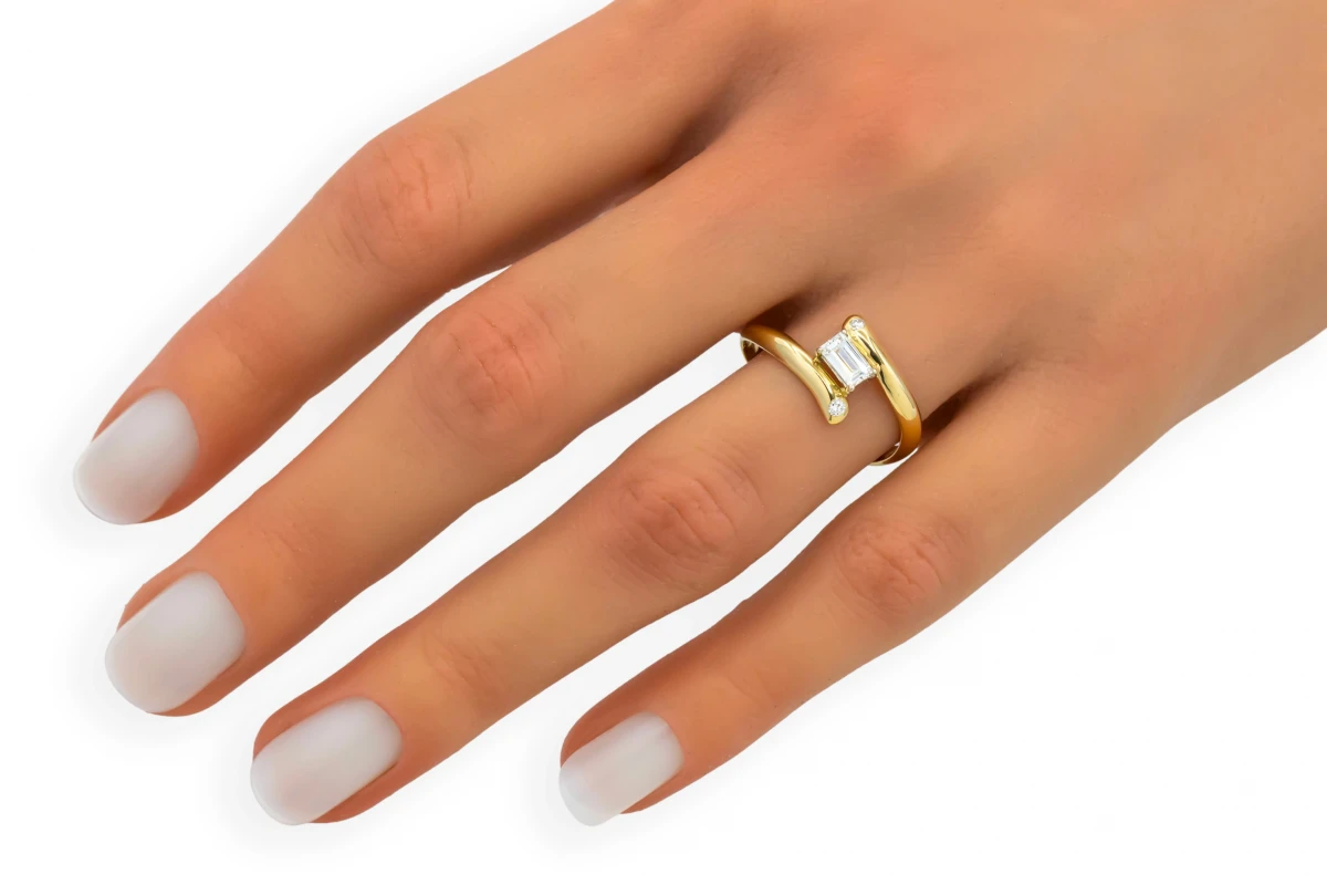 This sophisticated 14ct yellow gold diamond ring showcases a combination of emerald cut and round brilliant cut diamonds totalling 0.48ct.