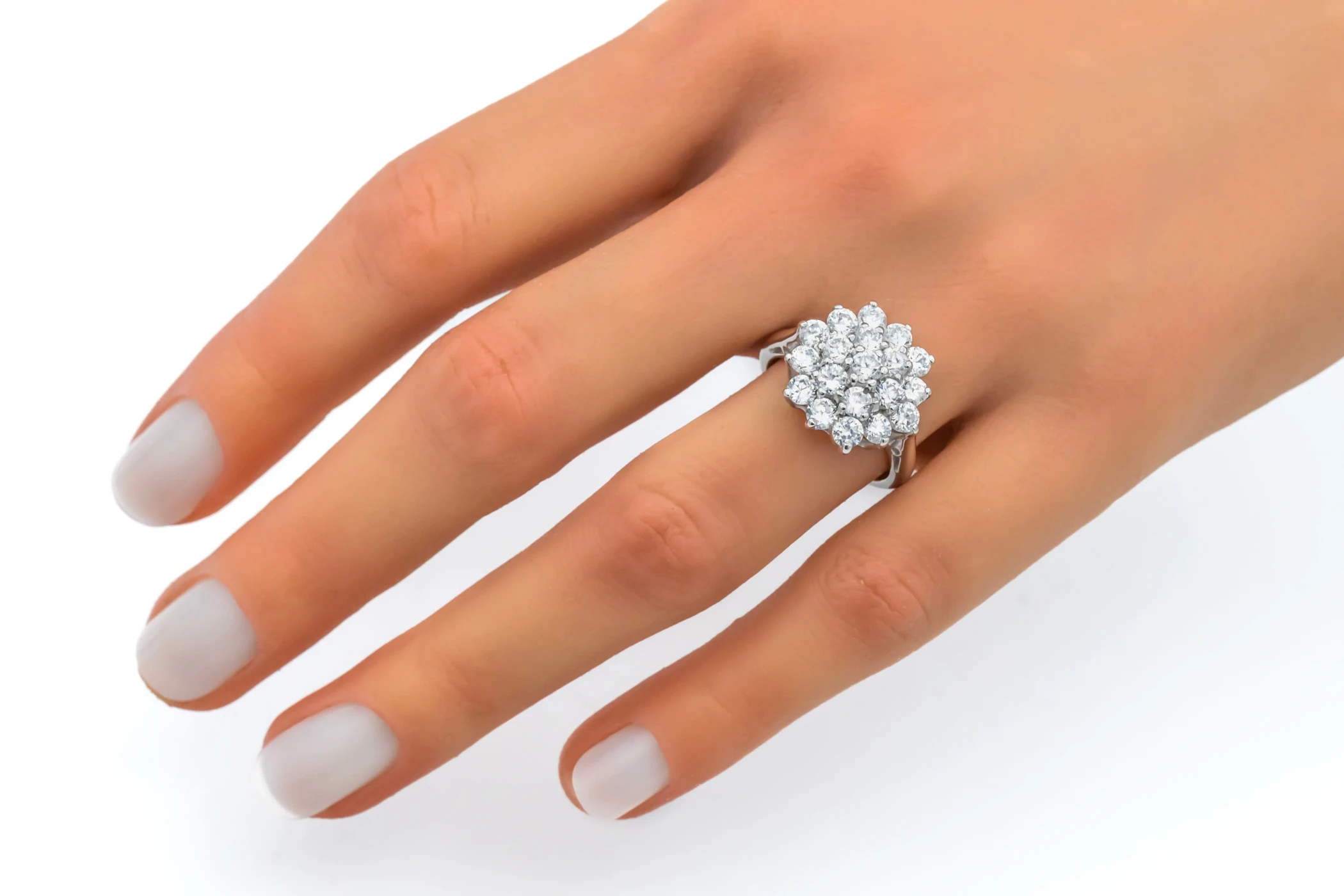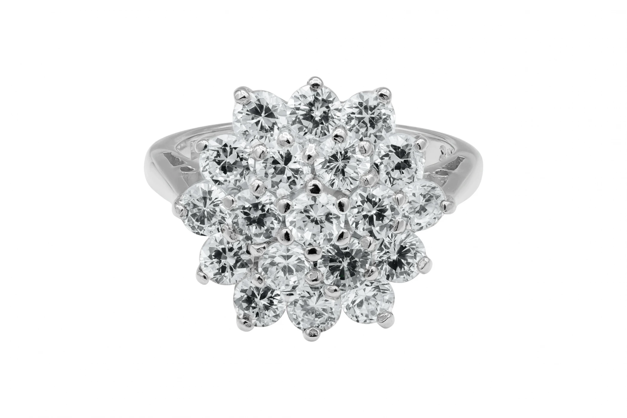 This impressive 9ct white gold diamond ring is designed in a striking cluster style set over three levels, showcasing 19 individually claw-set diamonds with a total weight of 1.17ct.