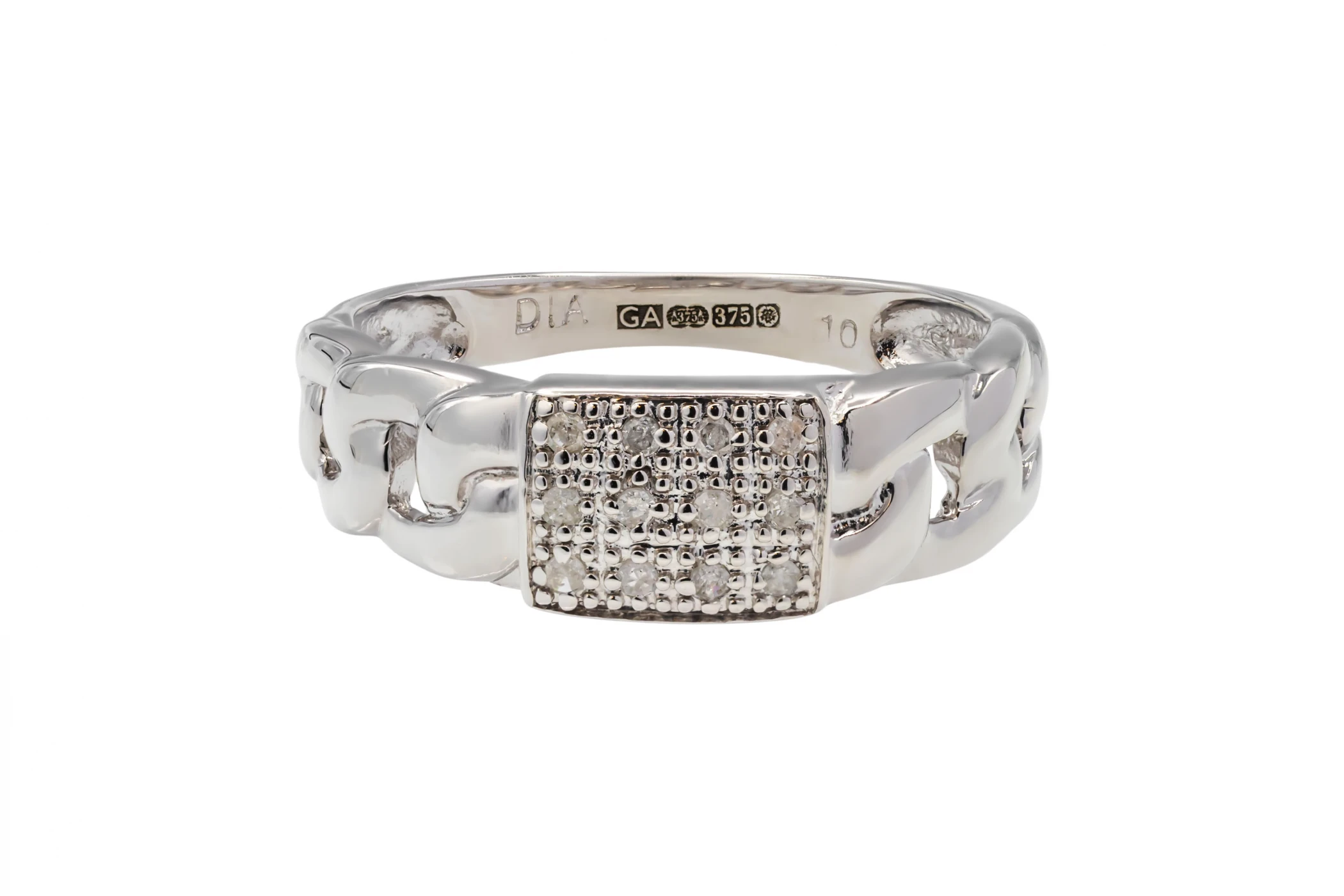 This stylish 9ct white gold men’s ring is crafted in a bold ID design and set with 0.10ct of round brilliant cut diamonds.