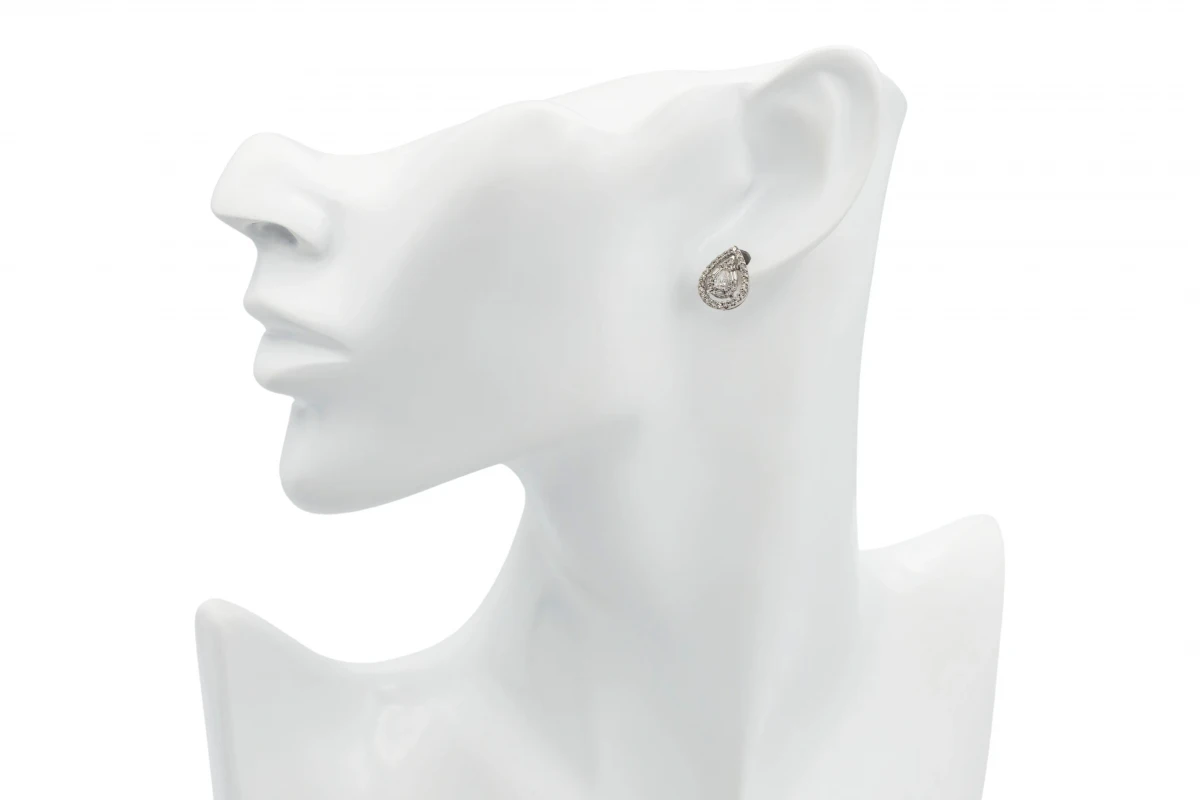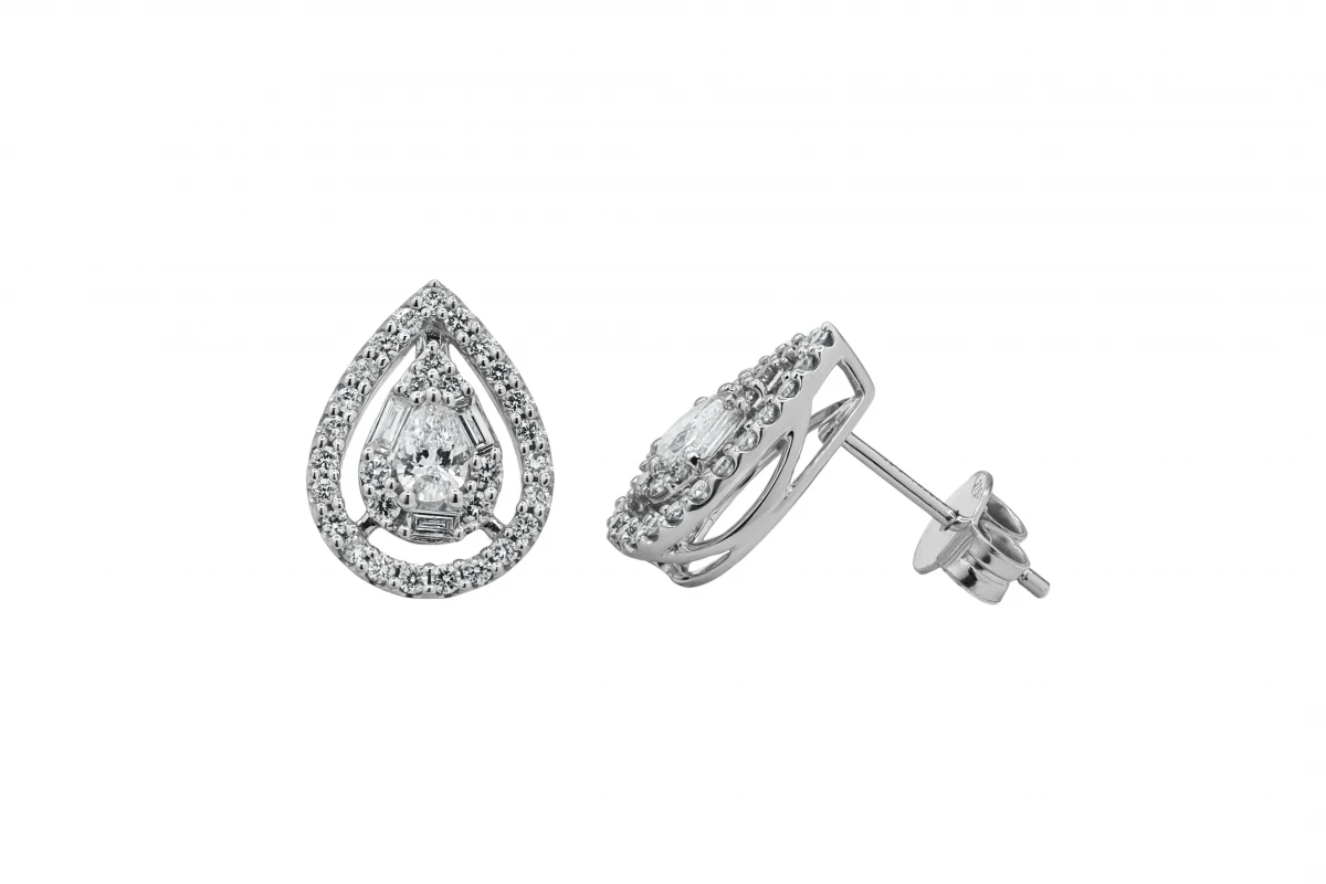 These elegant 9ct white gold diamond stud earrings, showcase a combination of pear, emerald, and round cut diamonds.