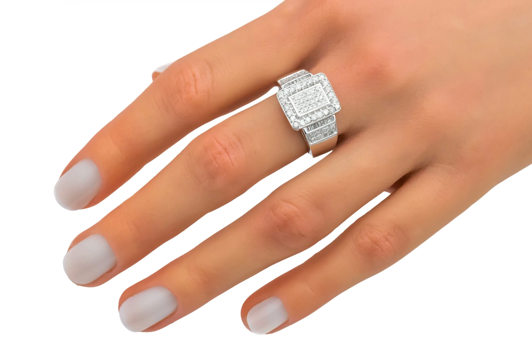 This bold yet refined 9ct white gold ring is set with 0.95ct of round brilliant cut diamonds, graded H colour with SI clarity for exceptional sparkle and presence.