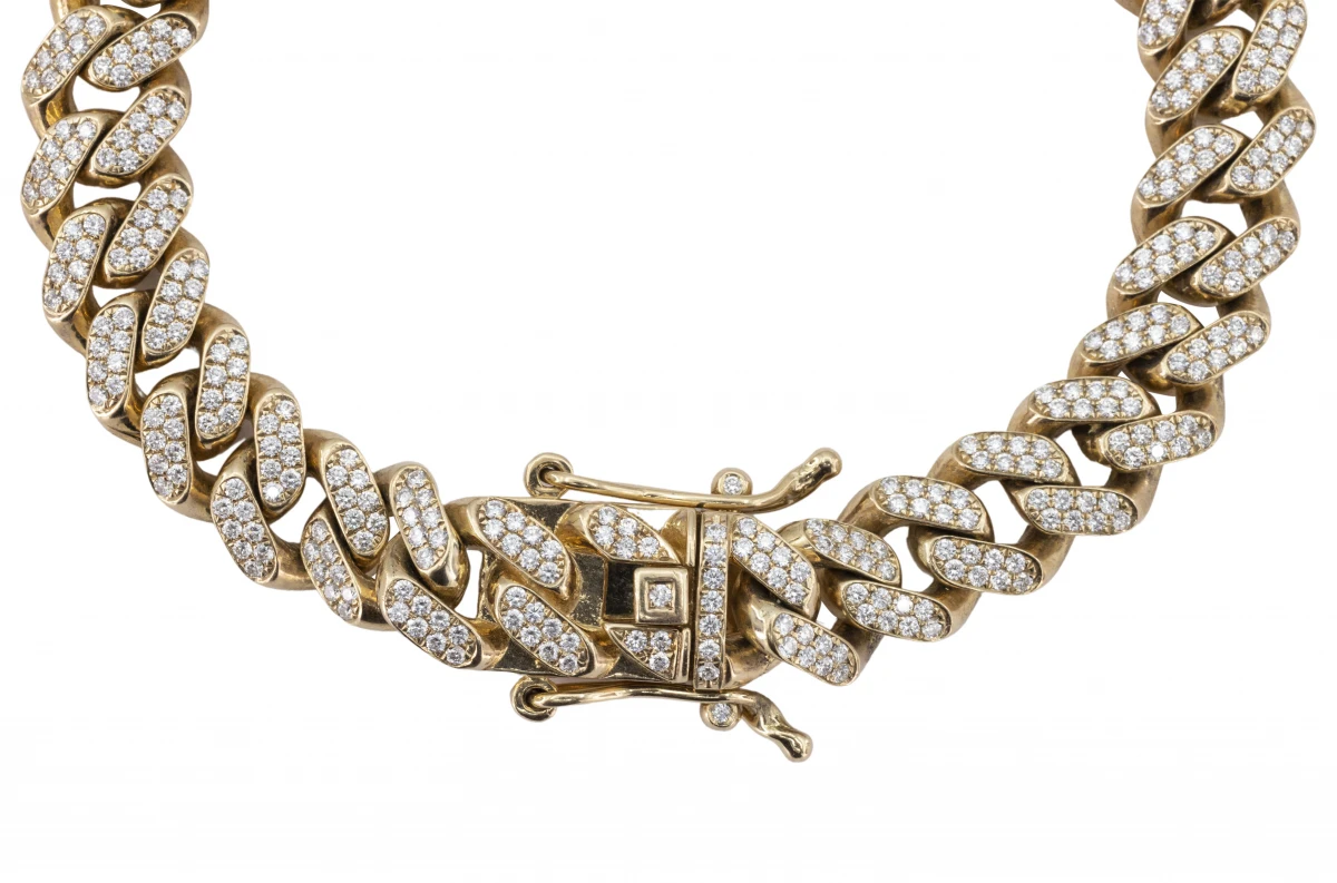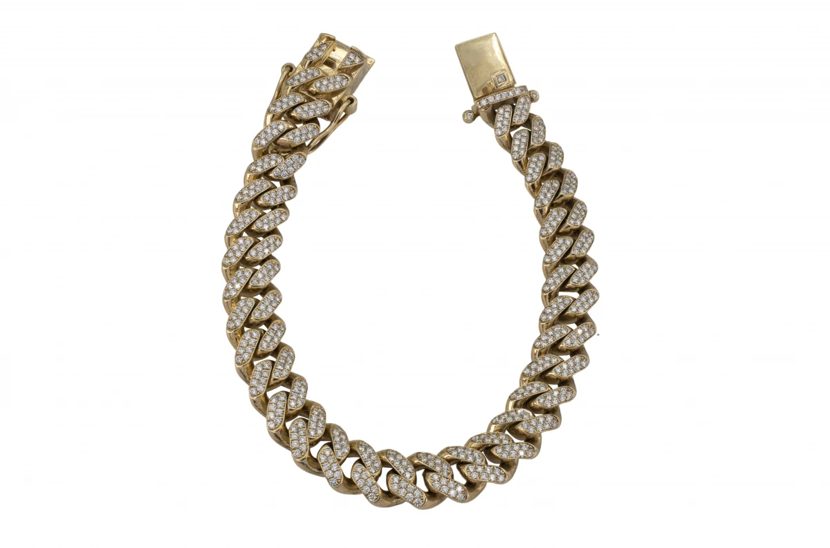 This 9ct yellow gold Cuban bracelet features 4.4ct VS diamonds and weighs 62.5g.10mm