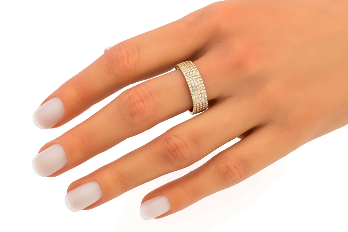 This bold and timeless ring is crafted in 9ct yellow gold, featuring a wide 6mm band set with shimmering cubic zirconia stones.
