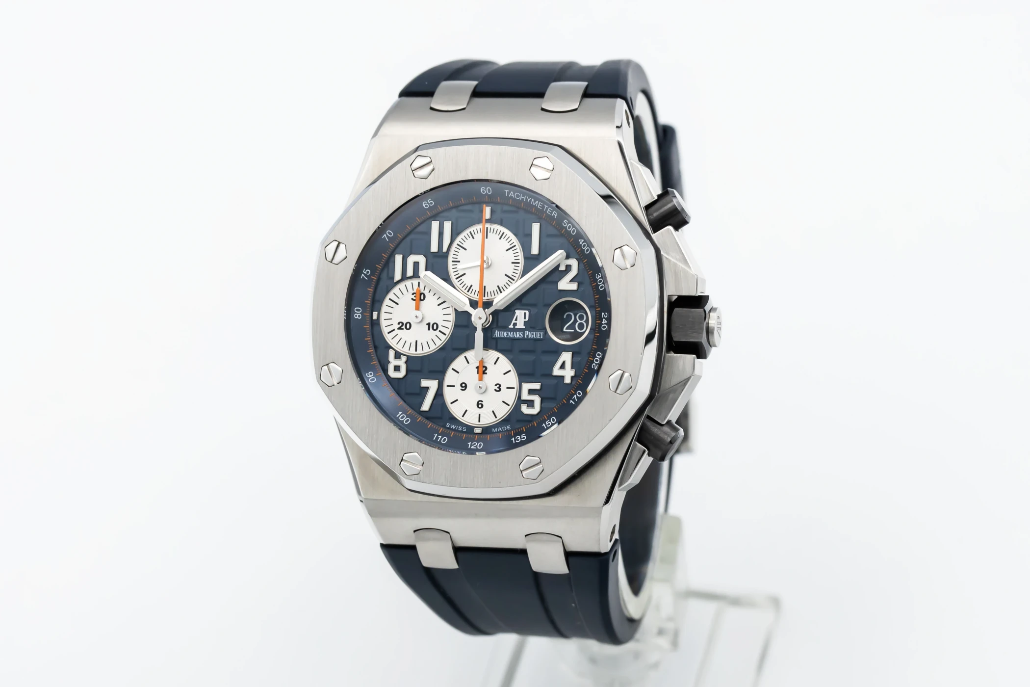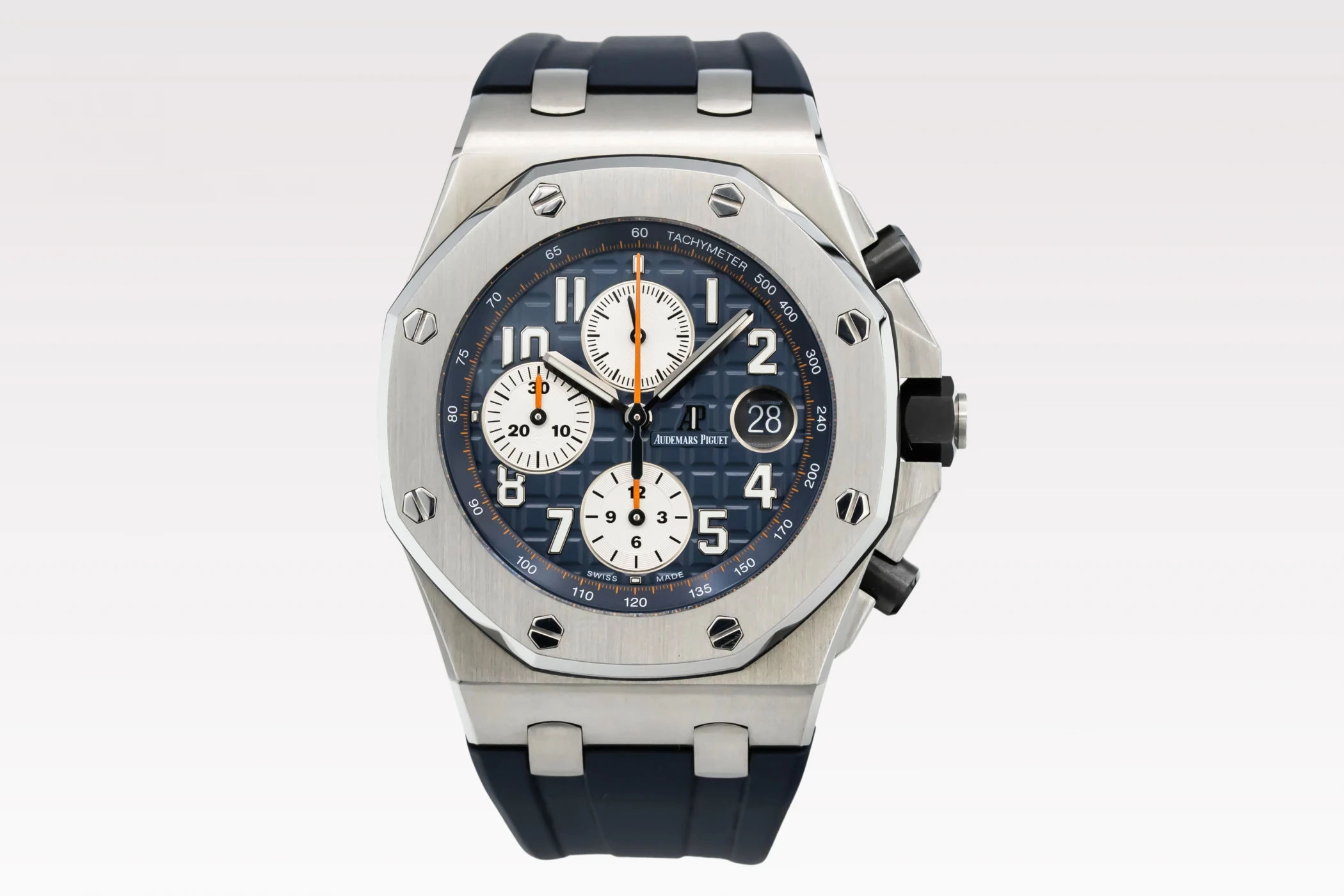 This 2018 Audemars Piguet Royal Oak Offshore features a 42mm blue 'mega Tapisserie' dial with arabic numerals and a blue rubber bracelet. It is also fitted with a smooth stainless steel bezel.