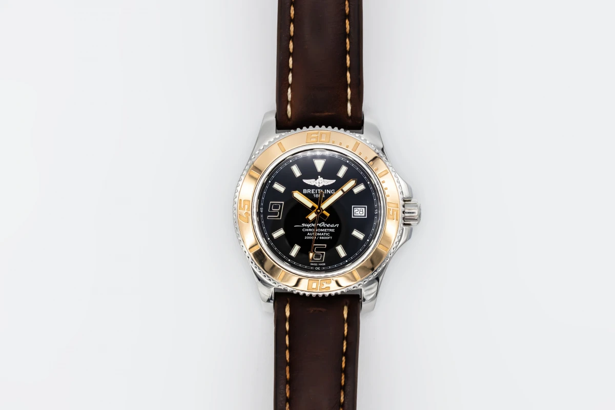This circa 2013 Breitling Superocean 44mm features a black dial with baton markers and a brown leather bracelet. It also features a 18ct rose gold bezel.