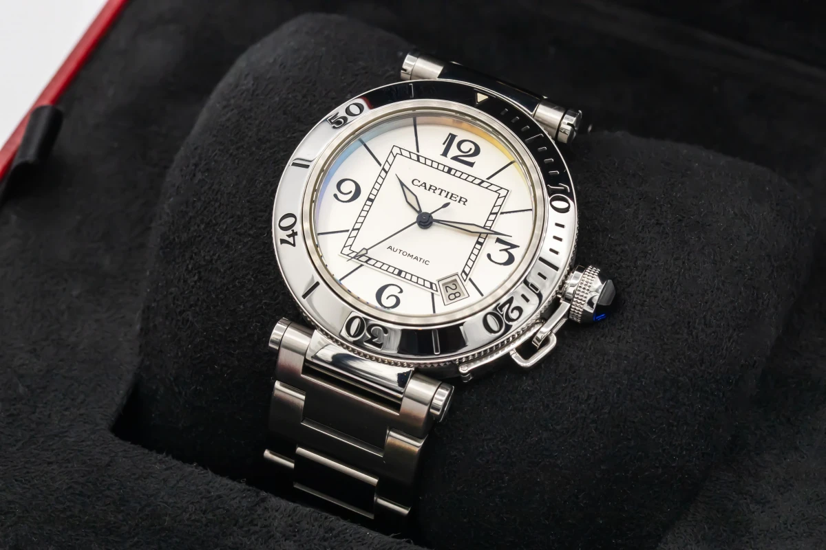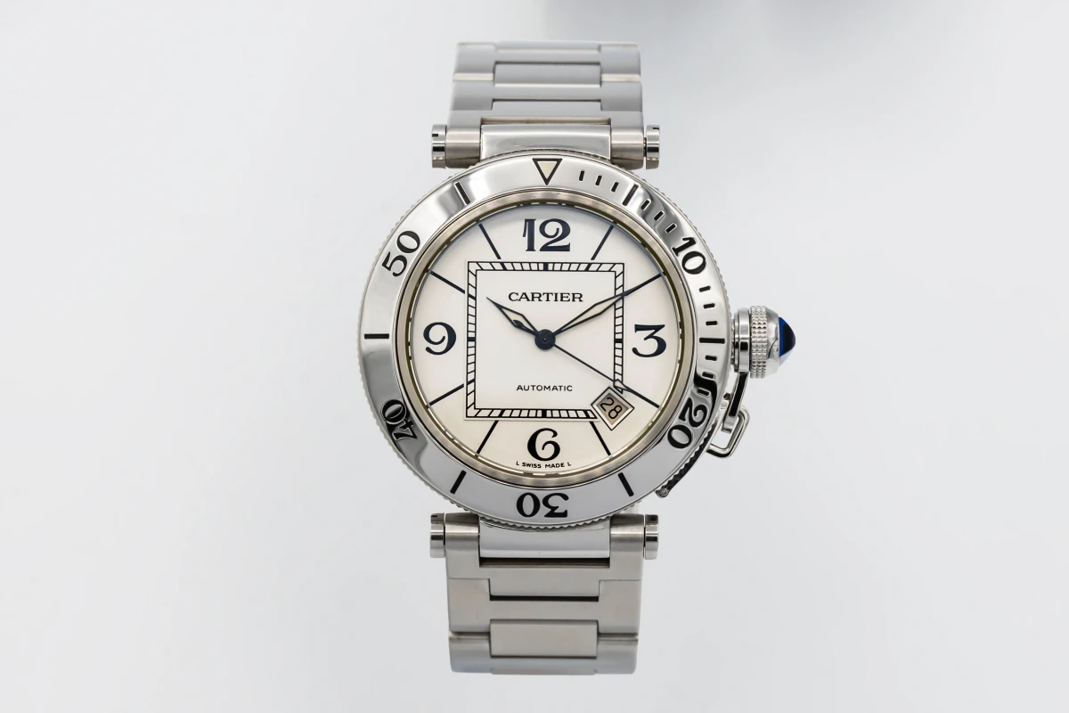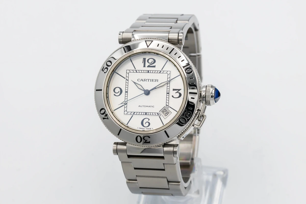 This circa 2010 Cartier Pasha Seatimer 40mm features a silver dial with arabic numerals and a stainless steel bracelet. It also features a stainless steel unidirectional rotating bezel.