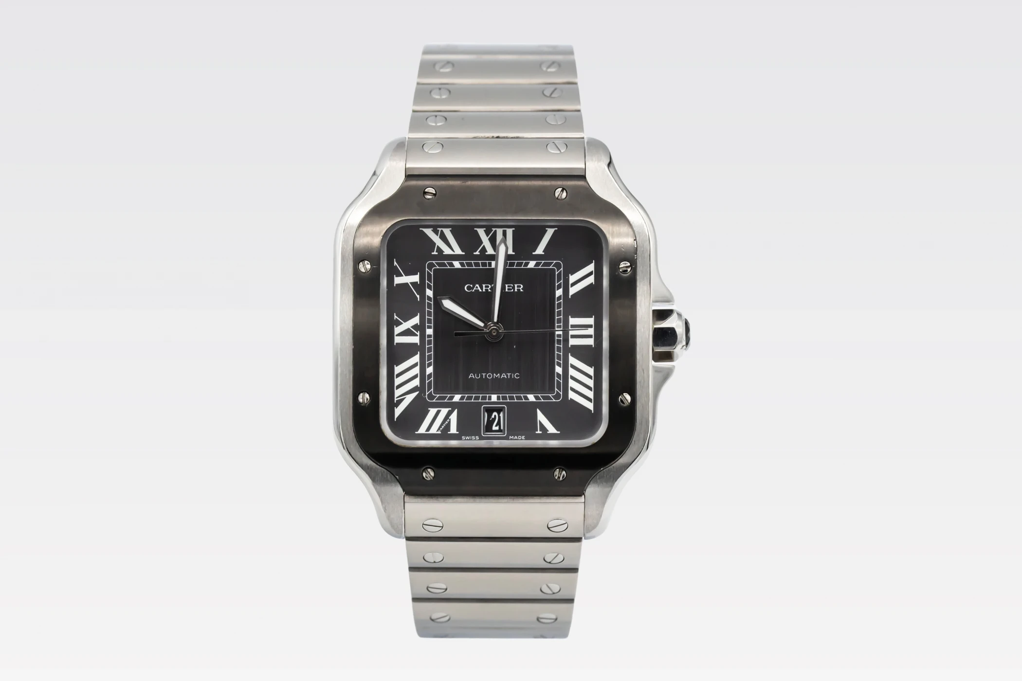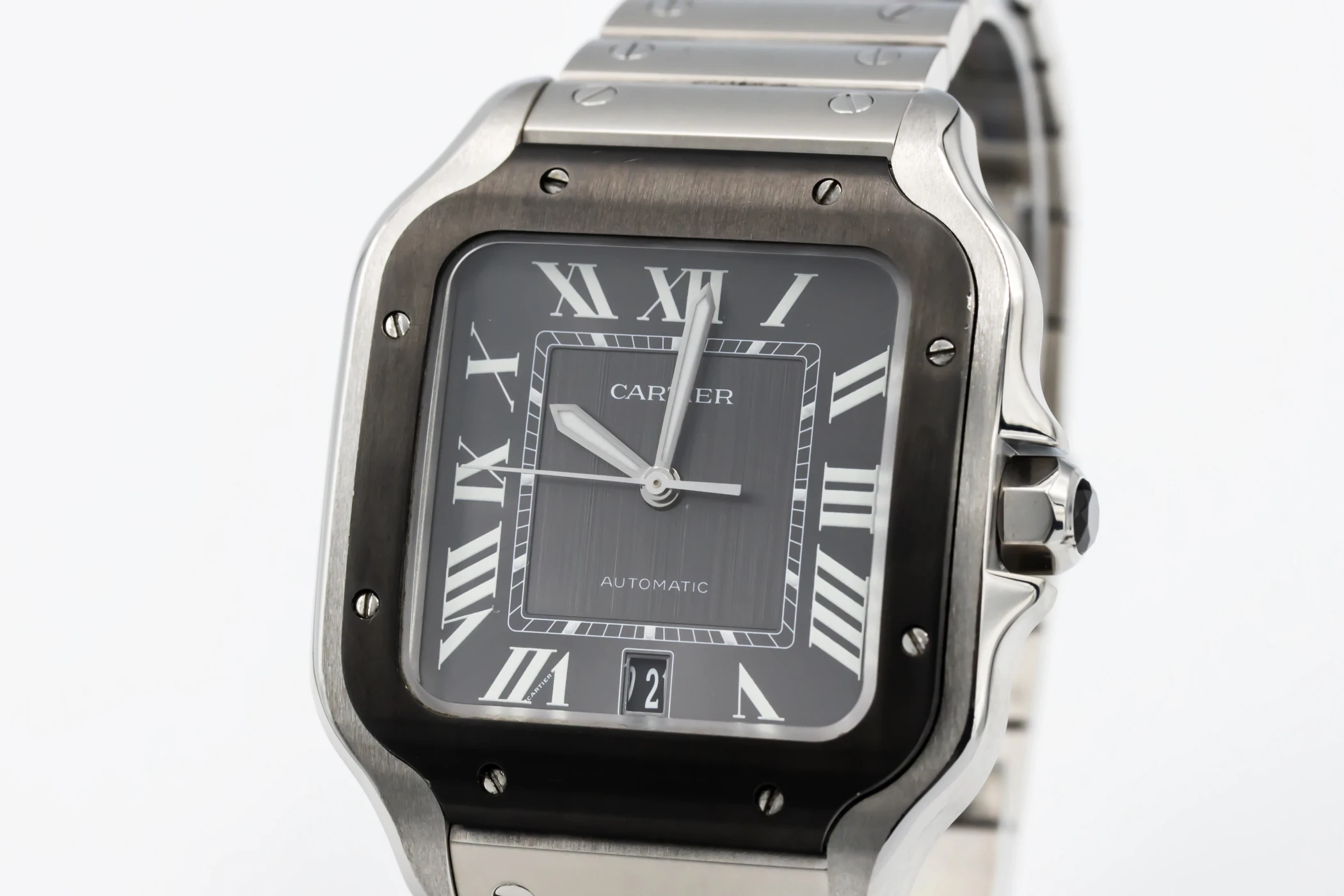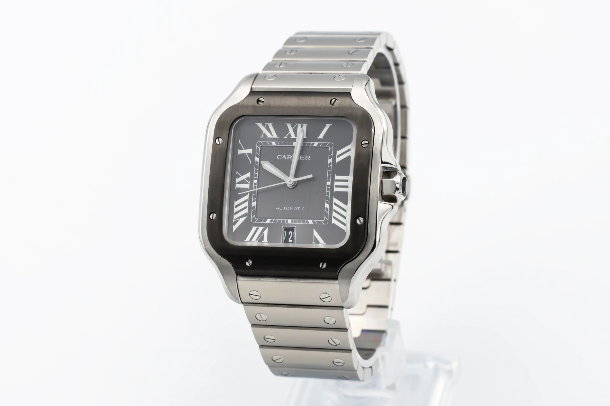 This 2022 Cartier De Santos 40mm features a grey dial with roman numeral markers and an automatic self-winding movement. It also features a stainless steel bracelet and a smooth stainless steel bezel.