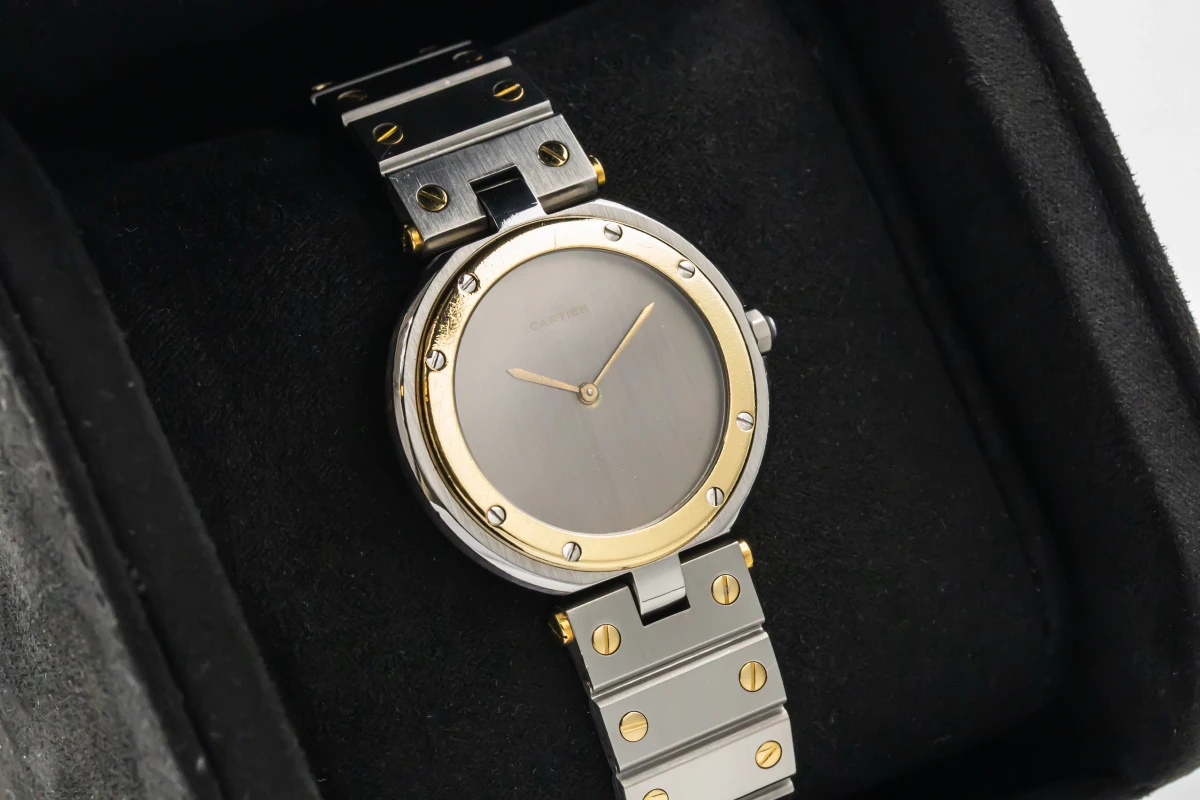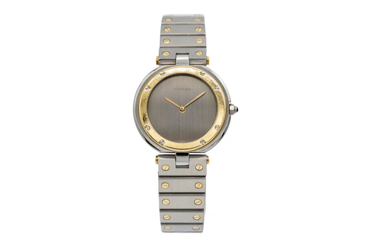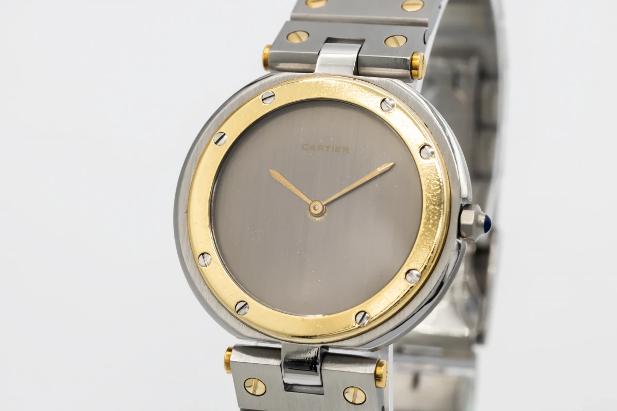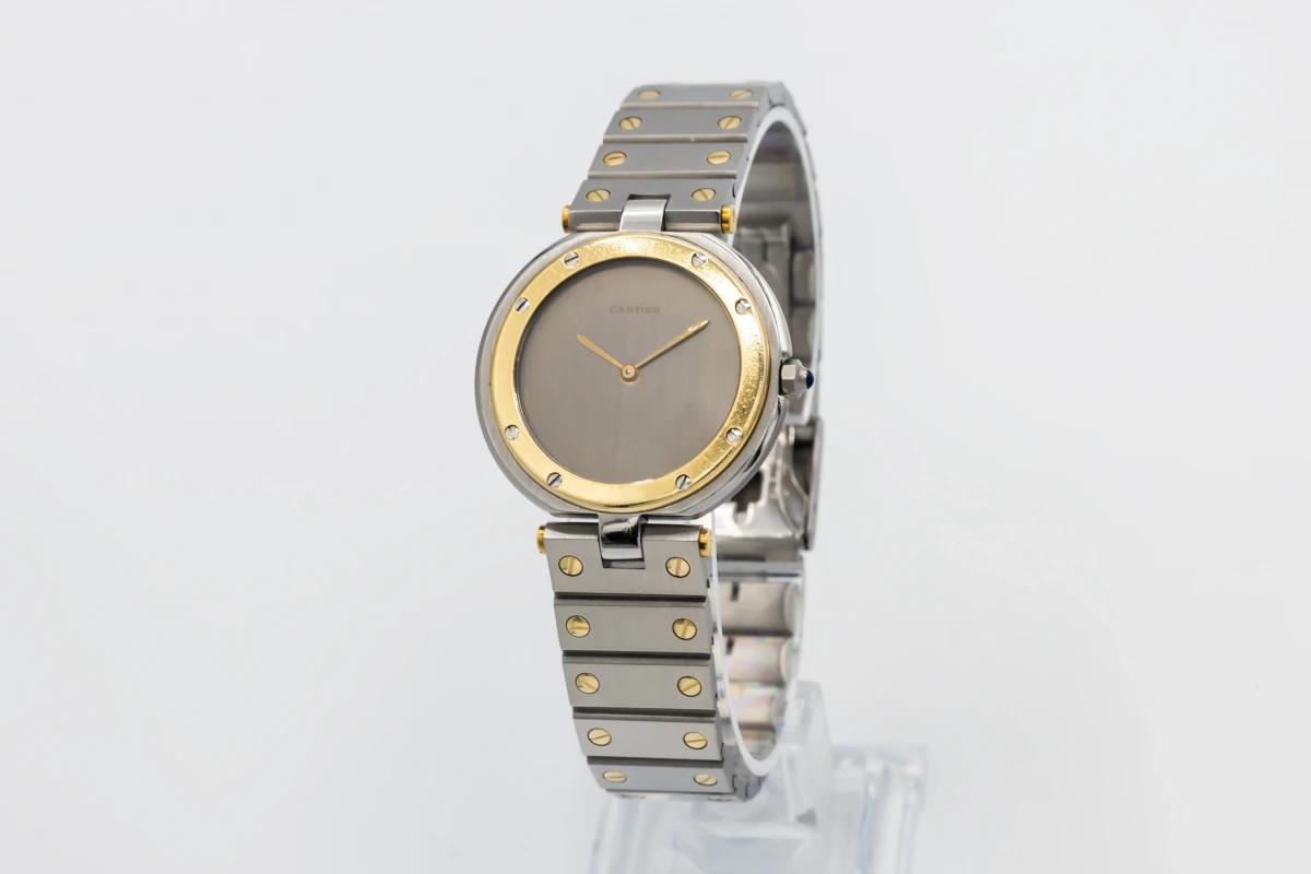 This circa 1990s Cartier Santos Vendome 27mm features a grey 'ghost' dial and a stainless steel and 18ct yellow gold bracelet. It also features a 18ct yellow gold bezel.
