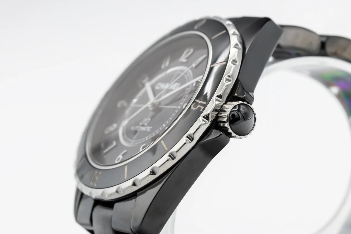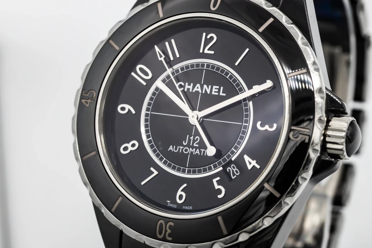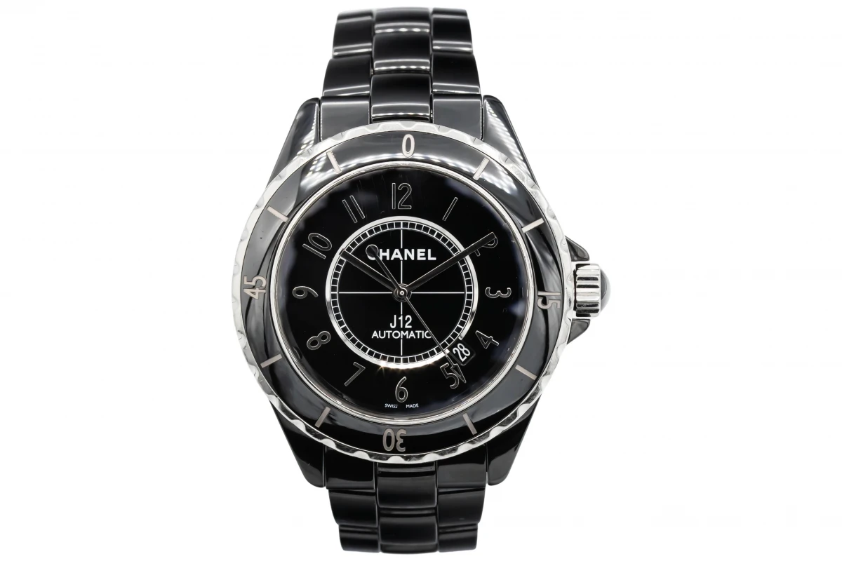 This circa 2006 Chanel J12 38mm features a black dial with arabic numerals and a black ceramic bracelet. It also features a black ceramic bezel.