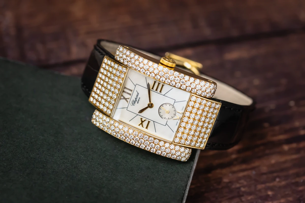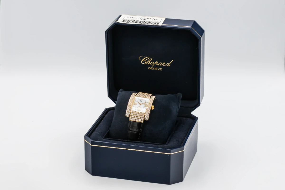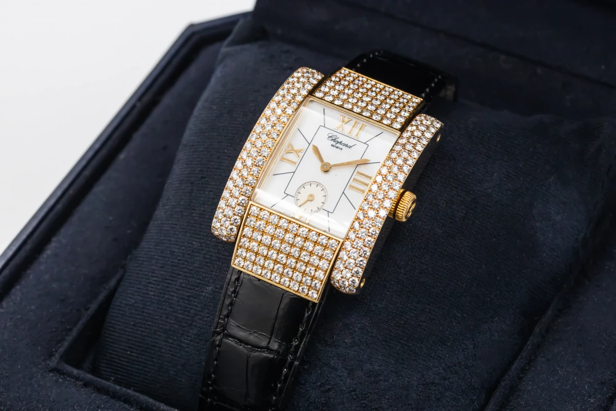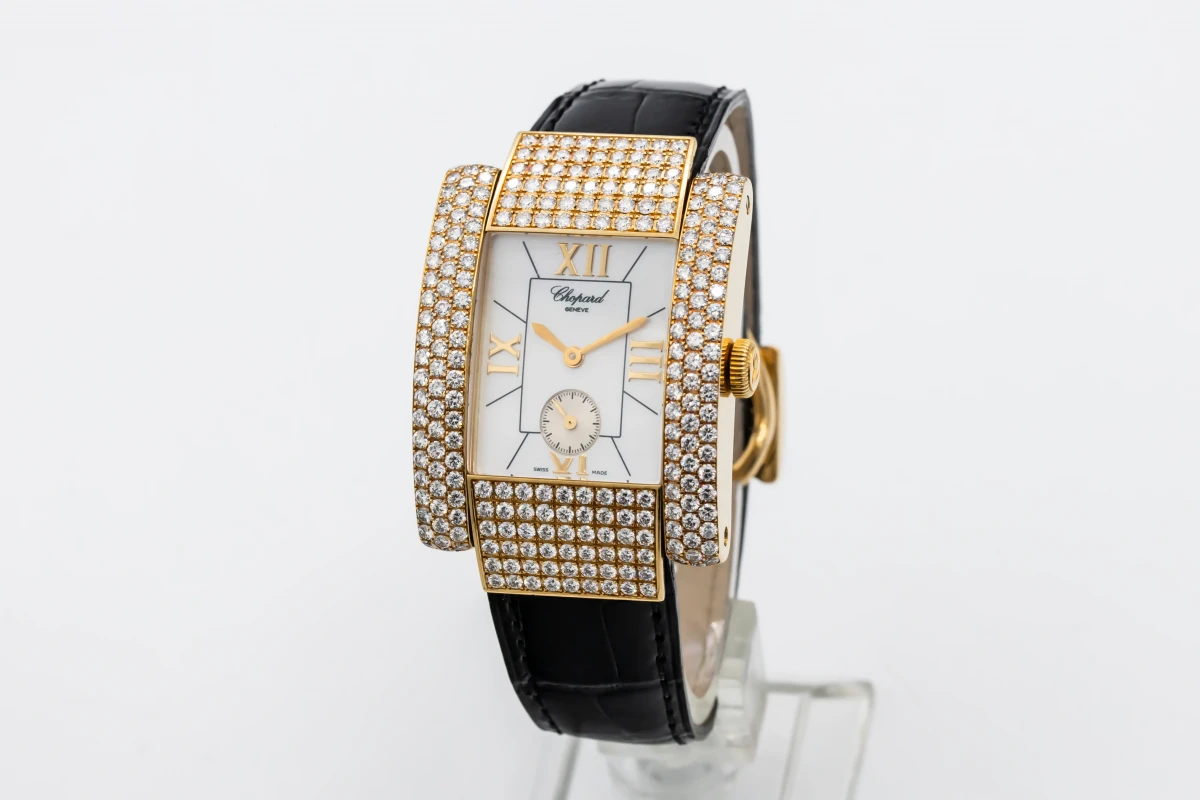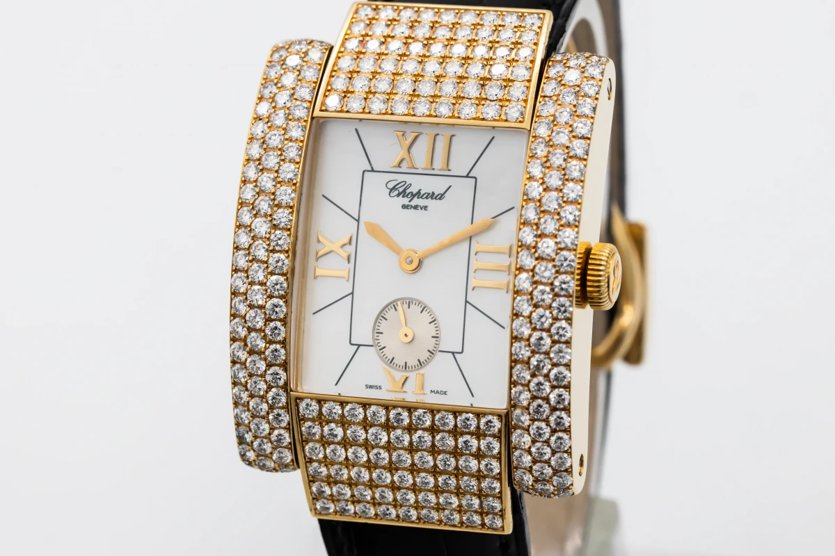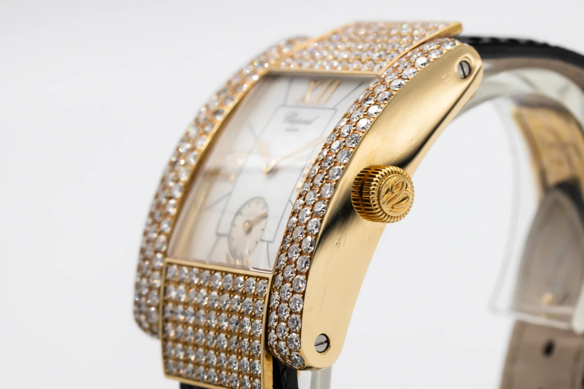 This circa 2008 Chopard La Strada 32mm features a mother of pearl dial with 18ct yellow gold roman numerals and a black leather bracelet. It also features a 18ct yellow gold factory diamond encrusted bezel.