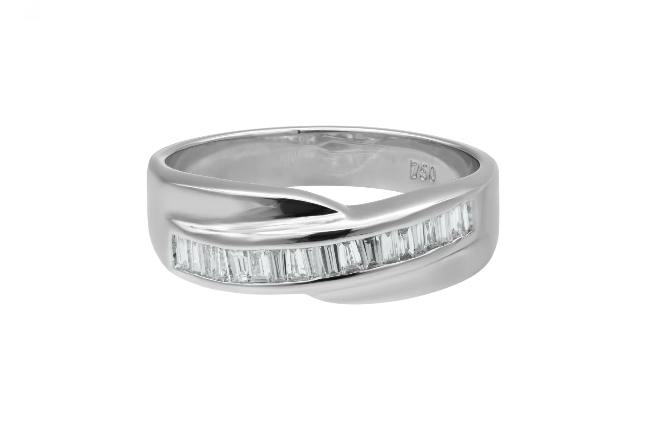 This refined 18ct white gold ring is channel set with 0.38ct of baguette cut diamonds, graded G colour with SI clarity. The sleek channel setting enhances the clean lines of the baguette diamonds, offering understated elegance and brilliance.