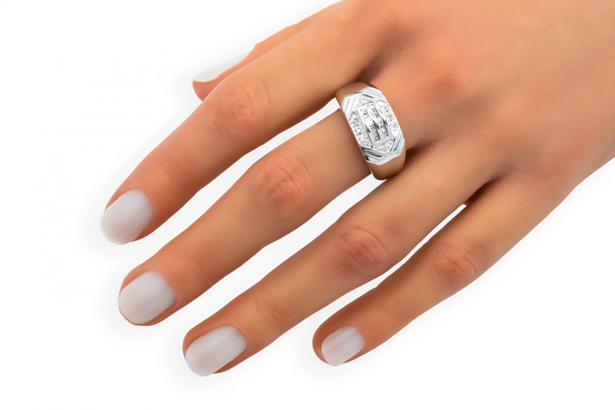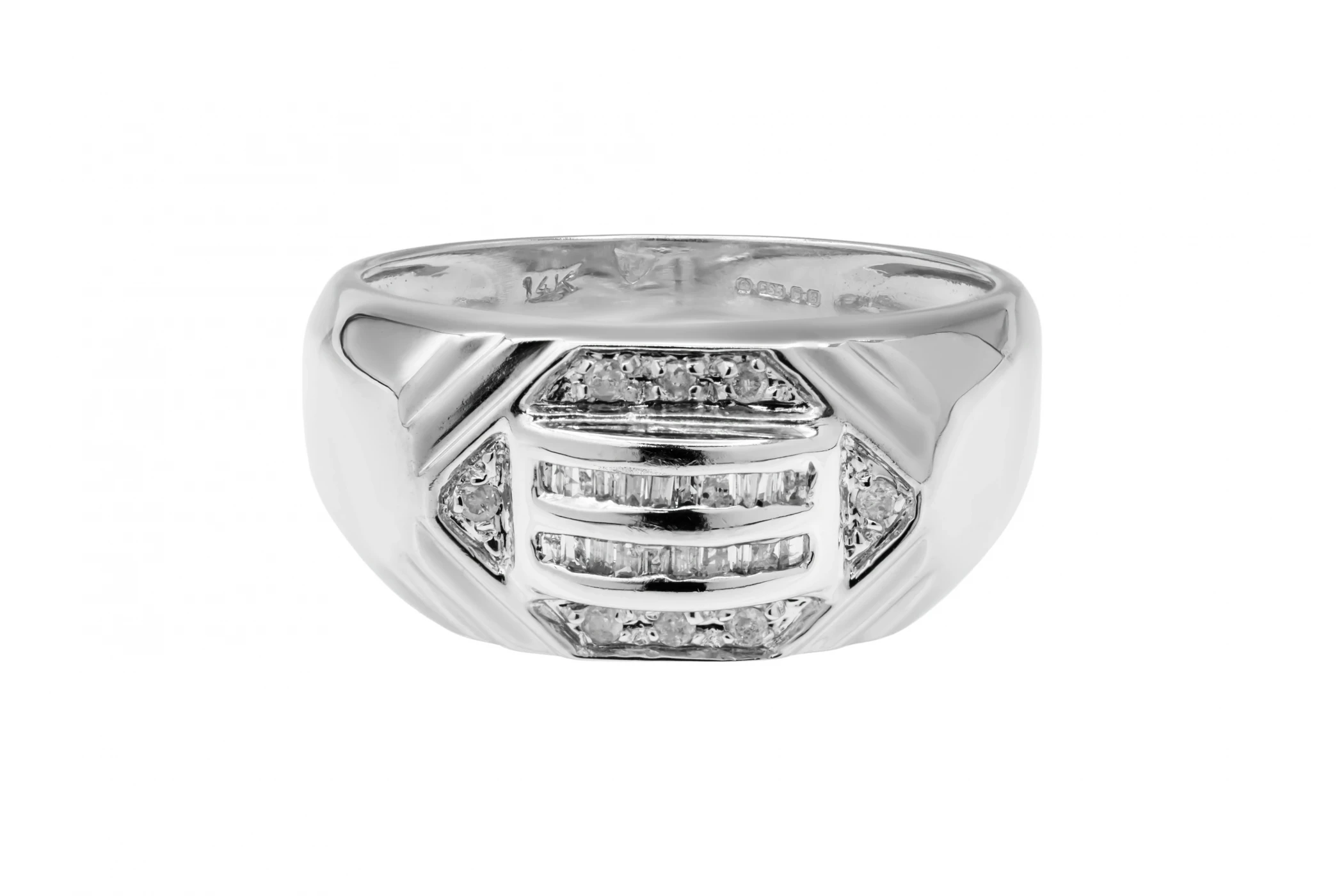 This bold 14ct white gold men’s ring features a double row of baguette cut diamonds totalling 0.23ct.