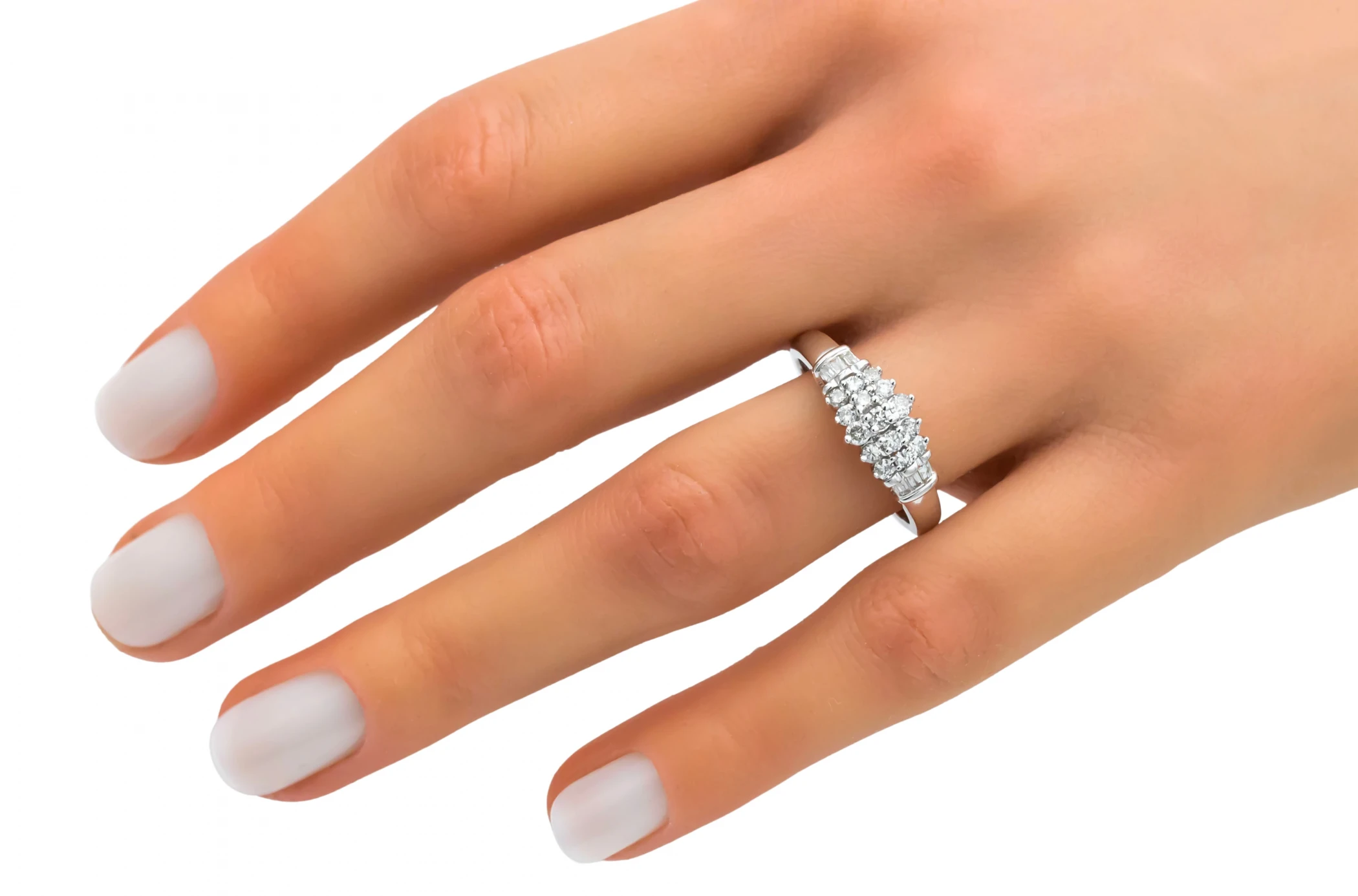 This sophisticated 14ct white gold cluster ring features a striking combination of brilliant round and baguette cut diamonds totalling 0.50ct. Graded G colour with SI clarity, the diamonds are beautifully arranged to maximise sparkle and depth.