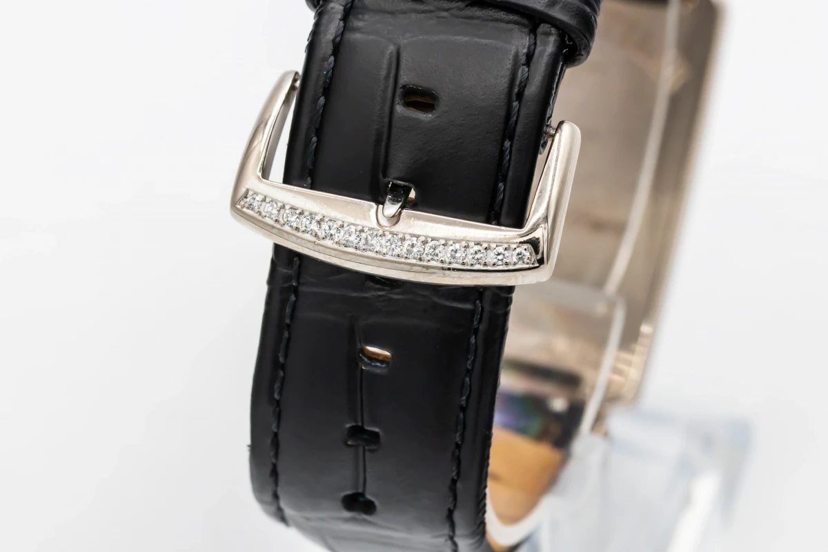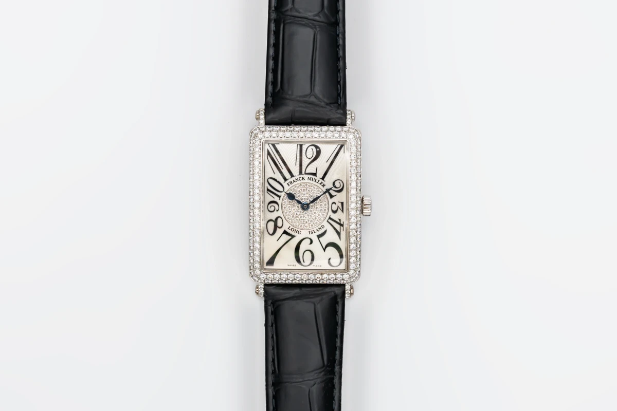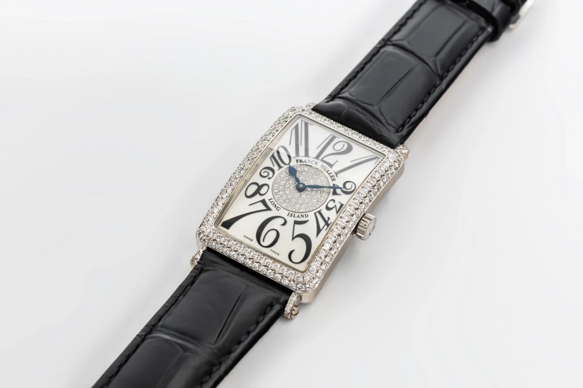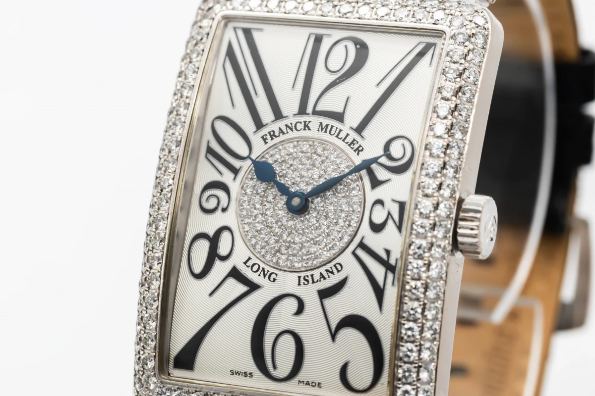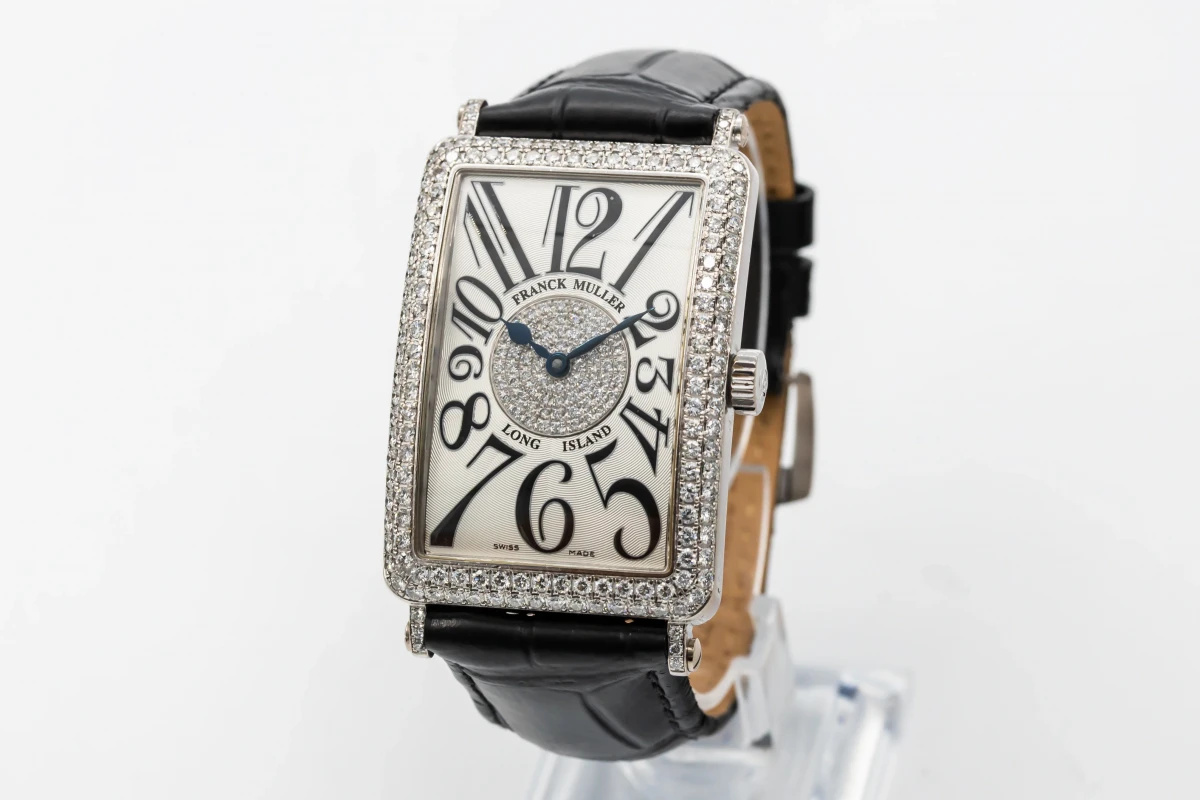 This 2004 Franck Muller Long Island 30x42mm features a silver dial with arabic numerals and a black leather strap. It also features a 18ct white gold factory diamond bezel.