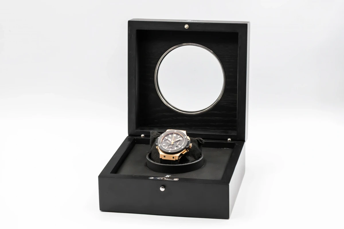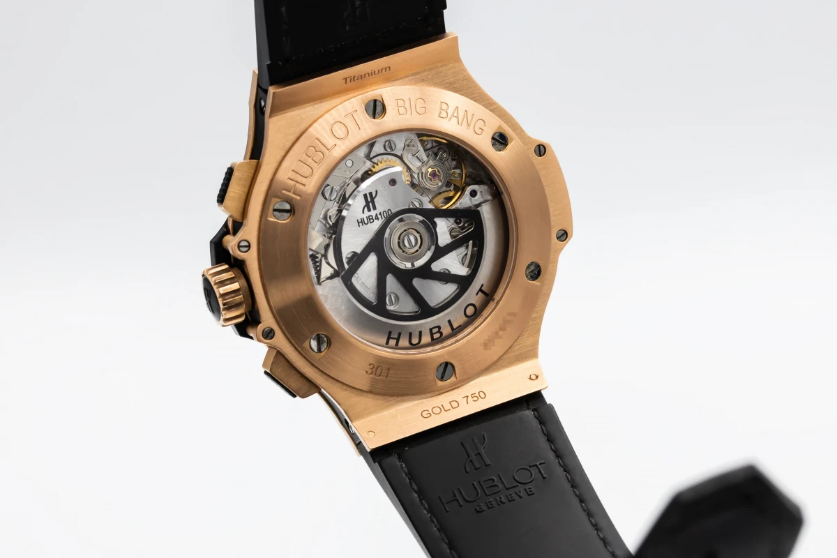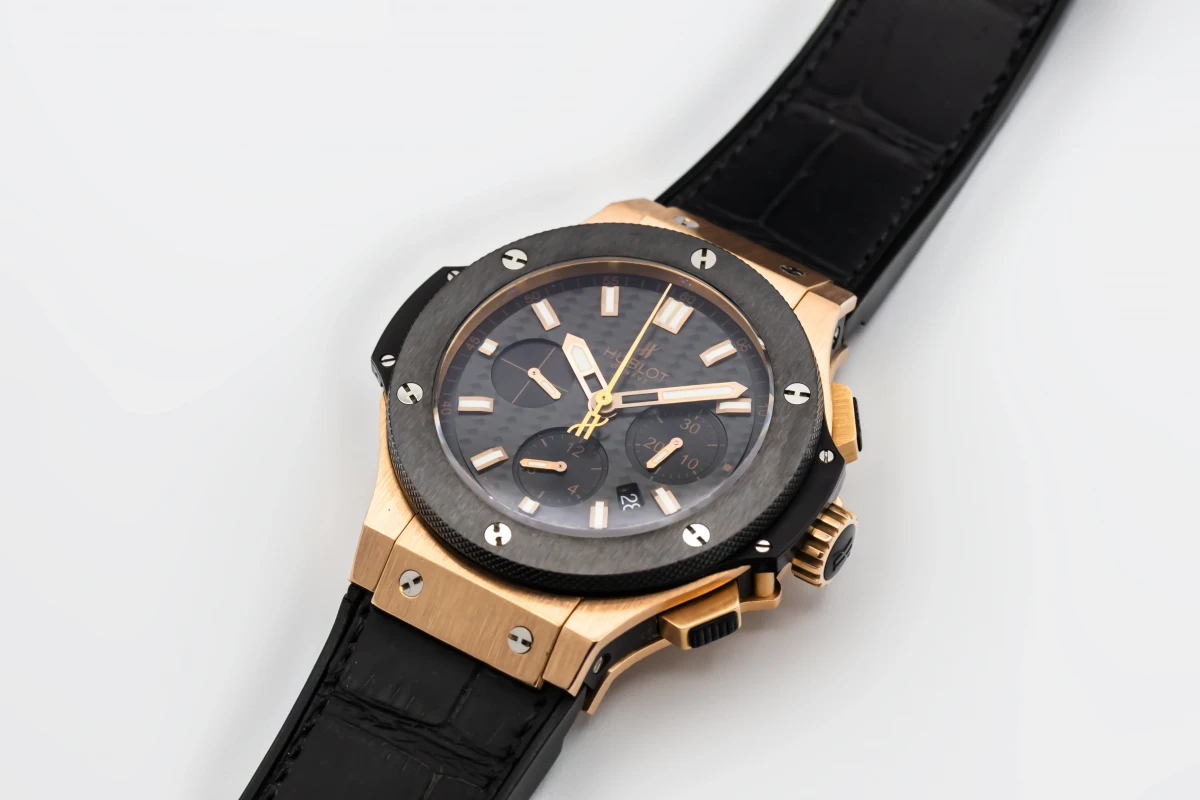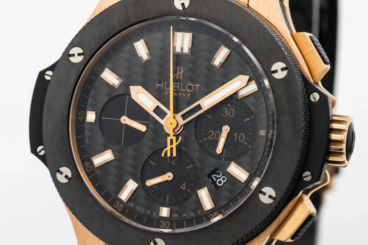 This circa 2015 Hublot Big Bang features a 44mm black carbon dial with baton markers and a black structured rubber strap. It is also fitted with a rose gold bezel with 6 H-shaped titanium screws.