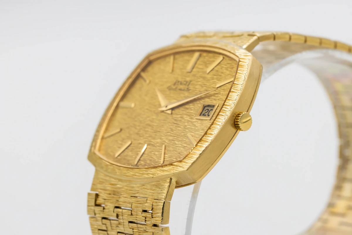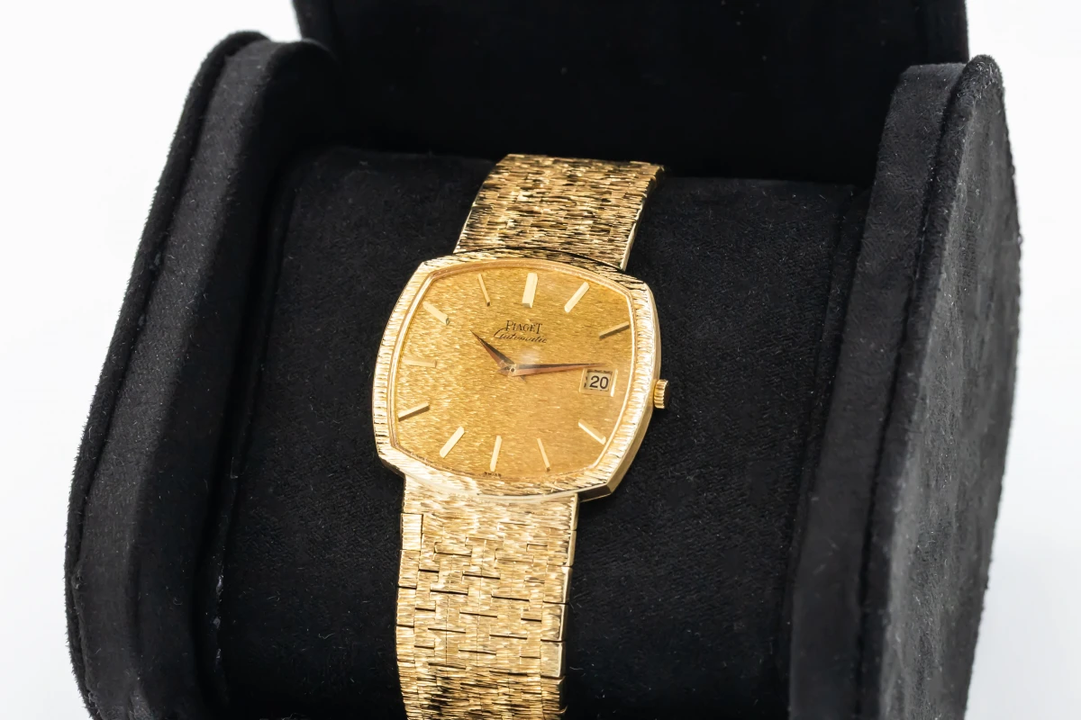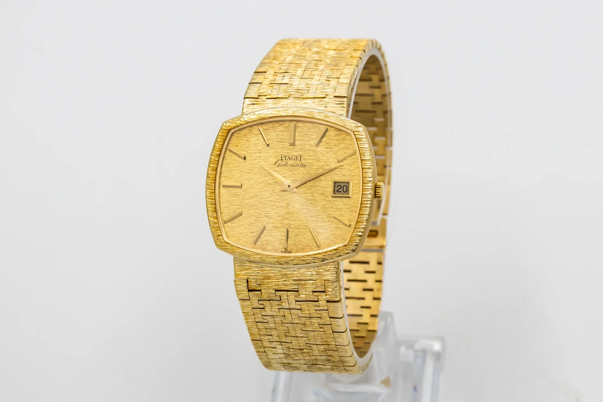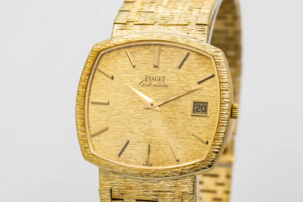 This Piaget Automatic Date 33mm features a champagne dial with 18ct yellow gold baton markers, it also features an 18ct yellow gold bezel and bracelet.