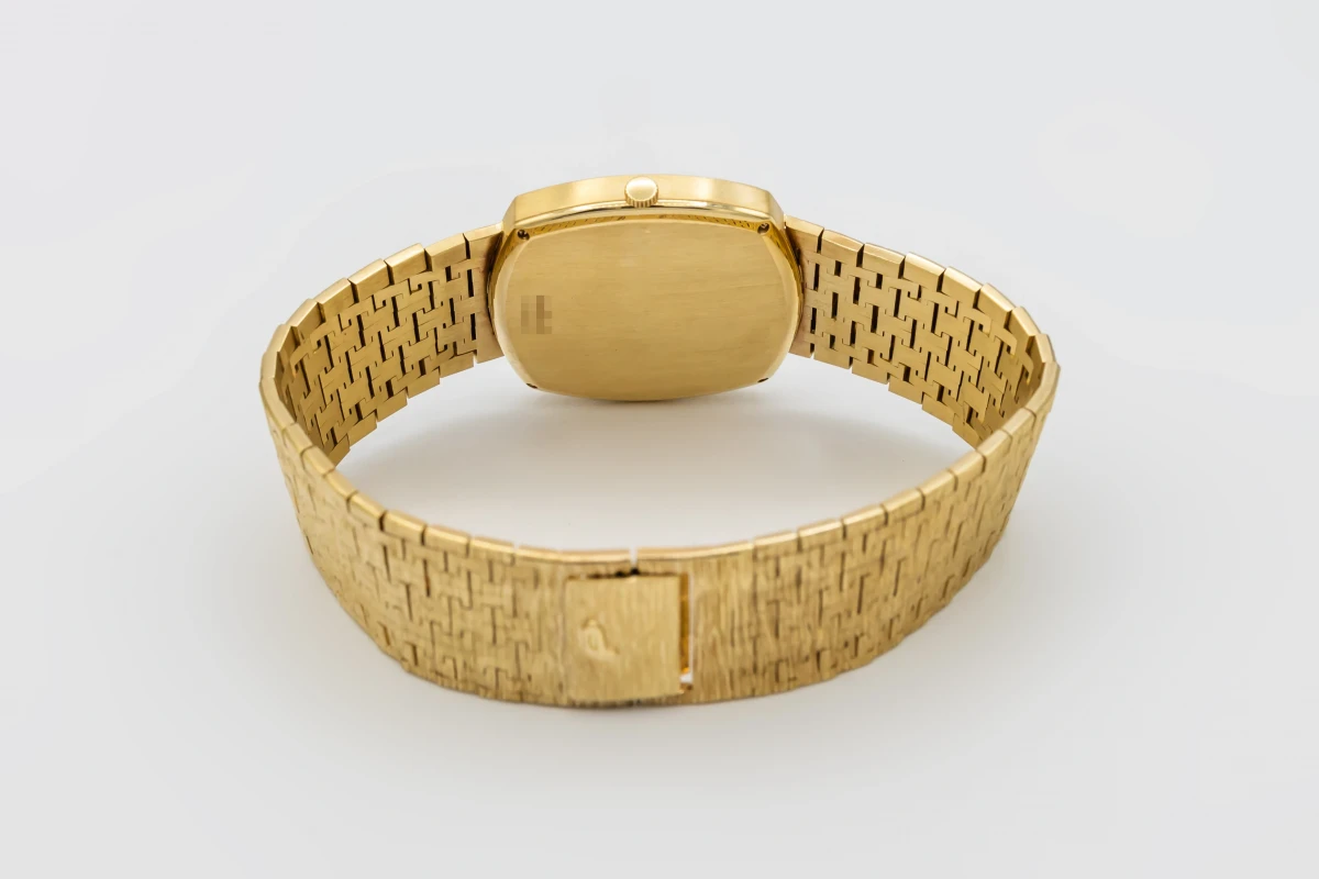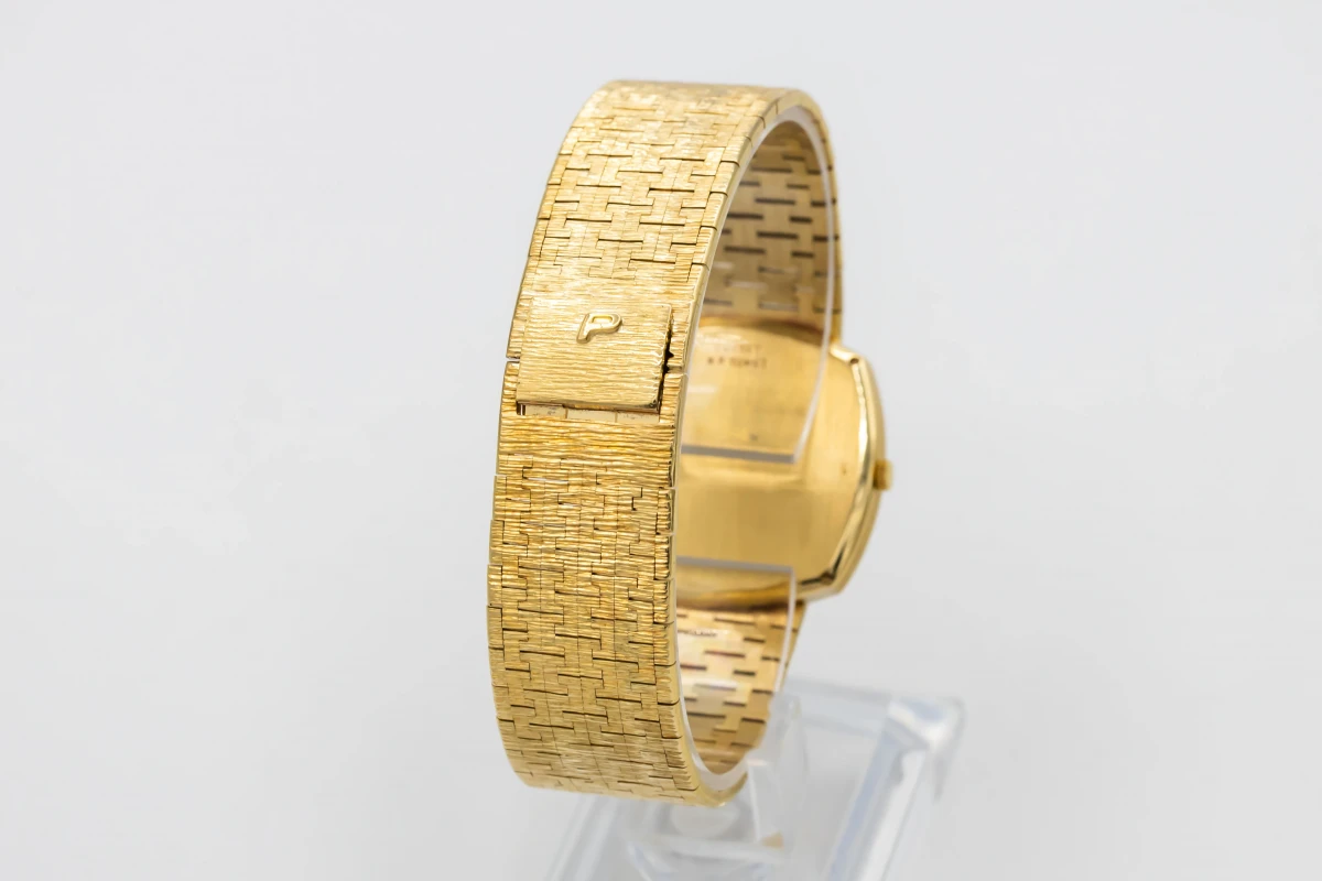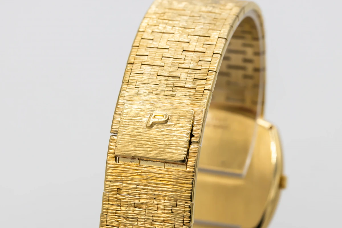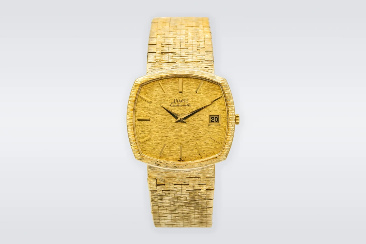 This Piaget Automatic Date 33mm features a champagne dial with 18ct yellow gold baton markers, it also features an 18ct yellow gold bezel and bracelet.