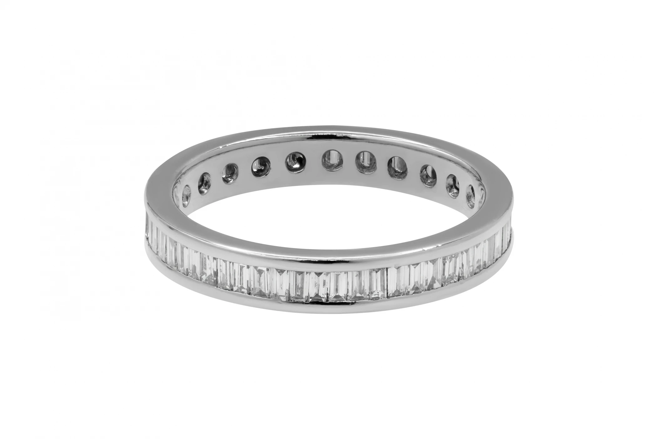 This timeless platinum eternity ring is set with 0.68ct of baguette cut diamonds, graded G colour with SI1 clarity for exceptional brilliance and style.