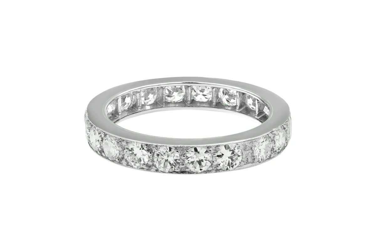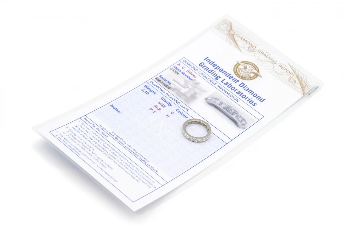 Celebrate everlasting elegance with this platinum eternity diamond ring, featuring a full circle of G colour, VS clarity round brilliant diamonds with a total weight of 2.10ct.