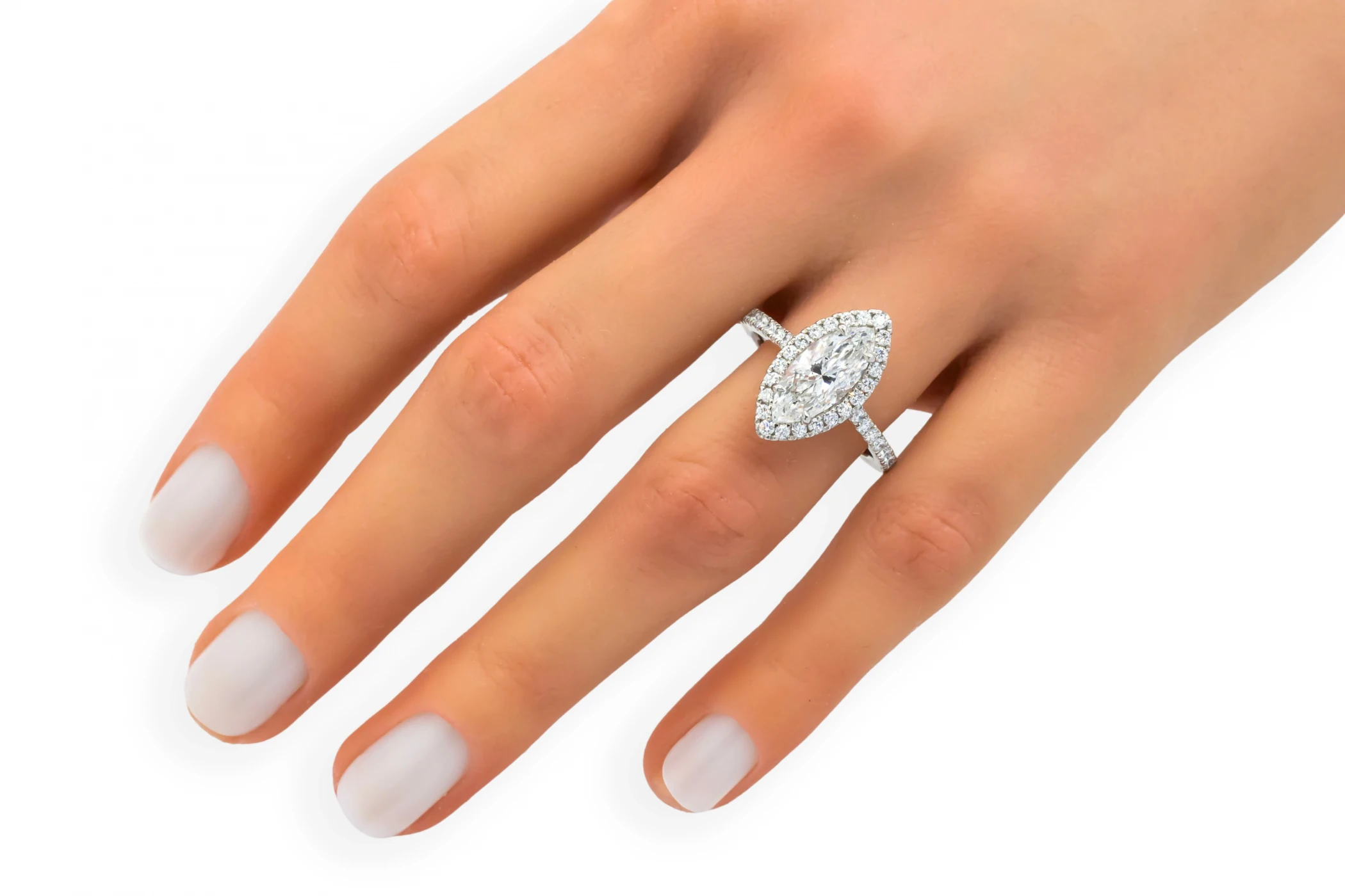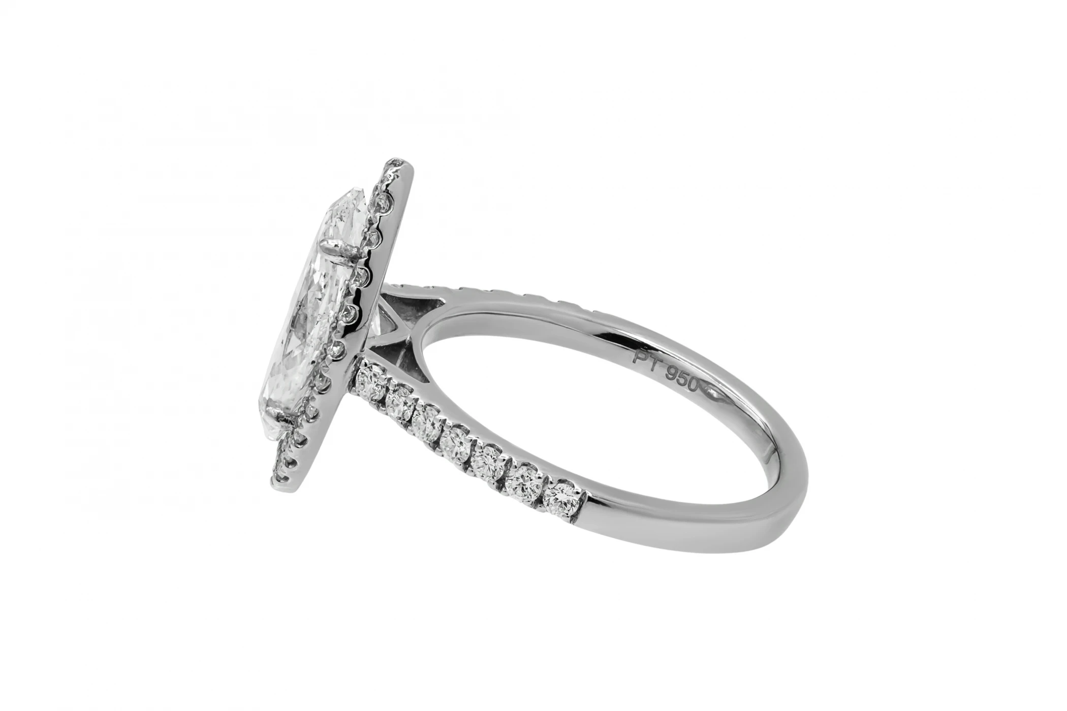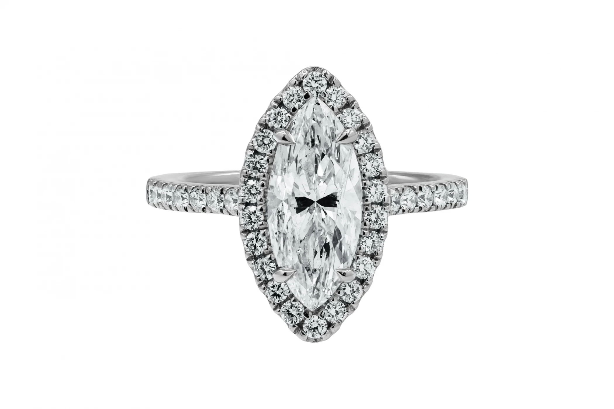 This exquisite platinum engagement ring features a stunning 2.17ct marquise cut centre diamond, graded E colour with I1 clarity and certified by GIA.