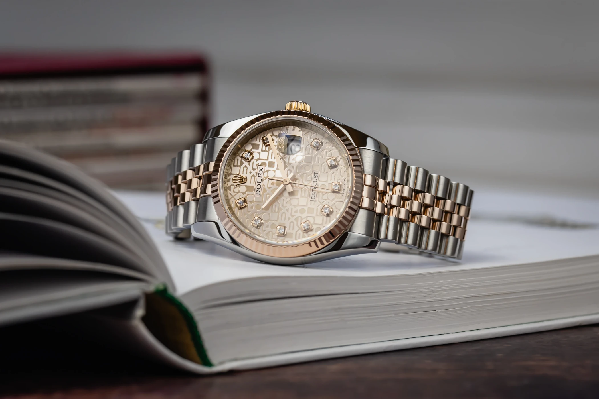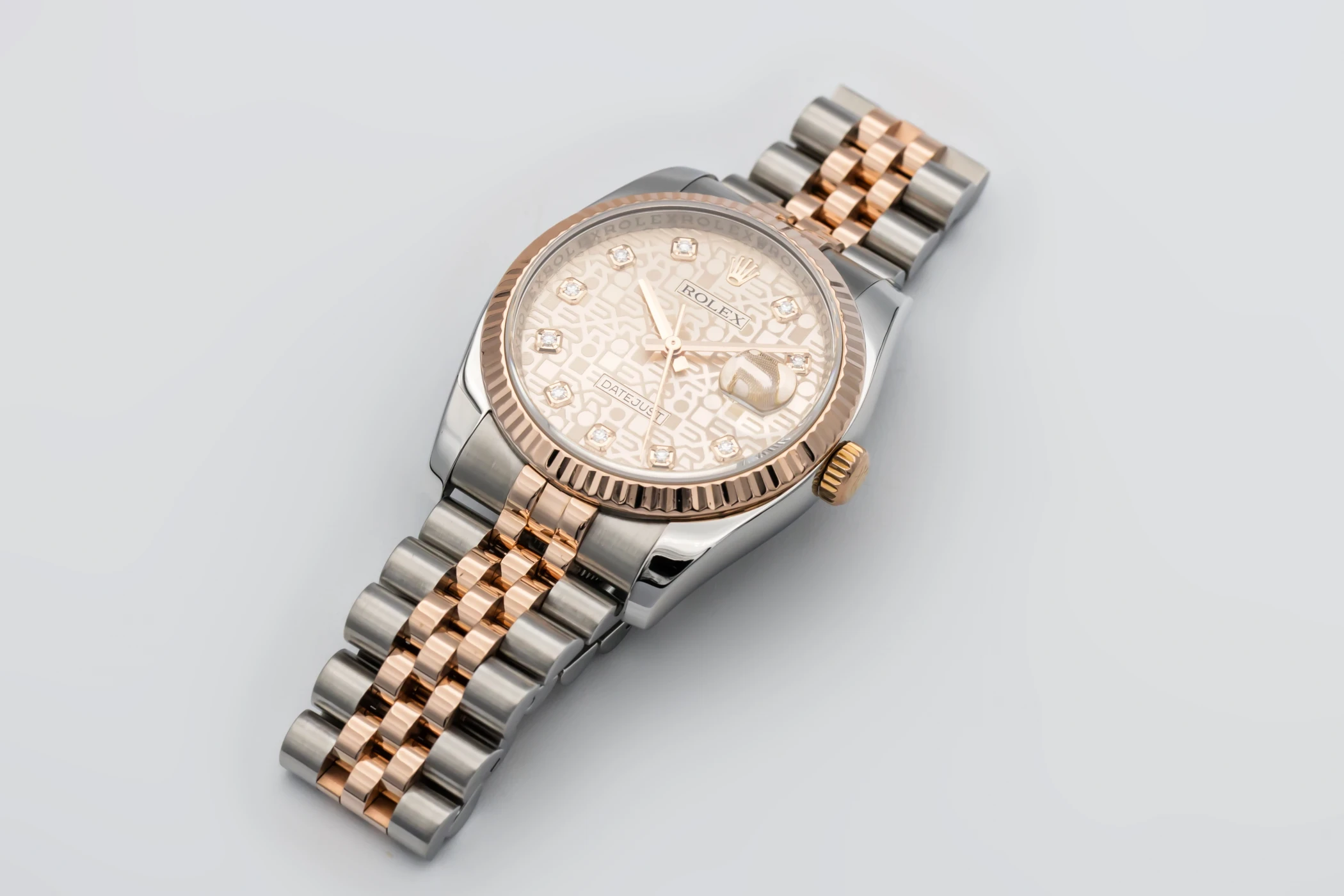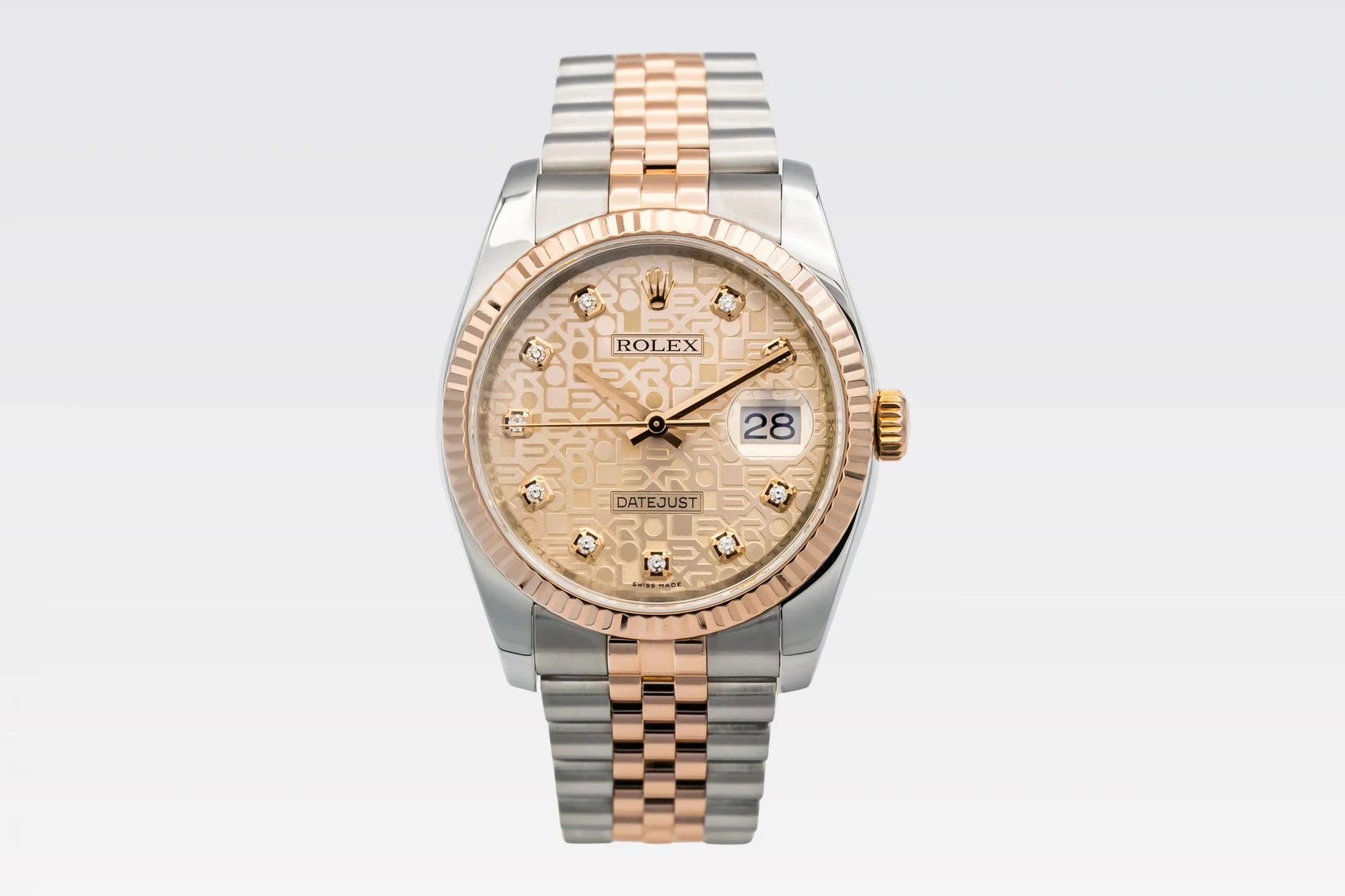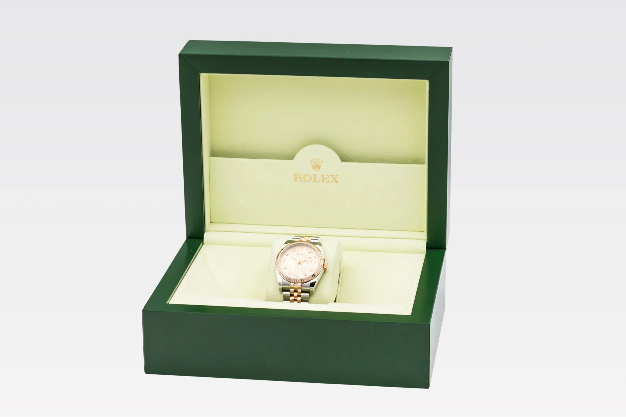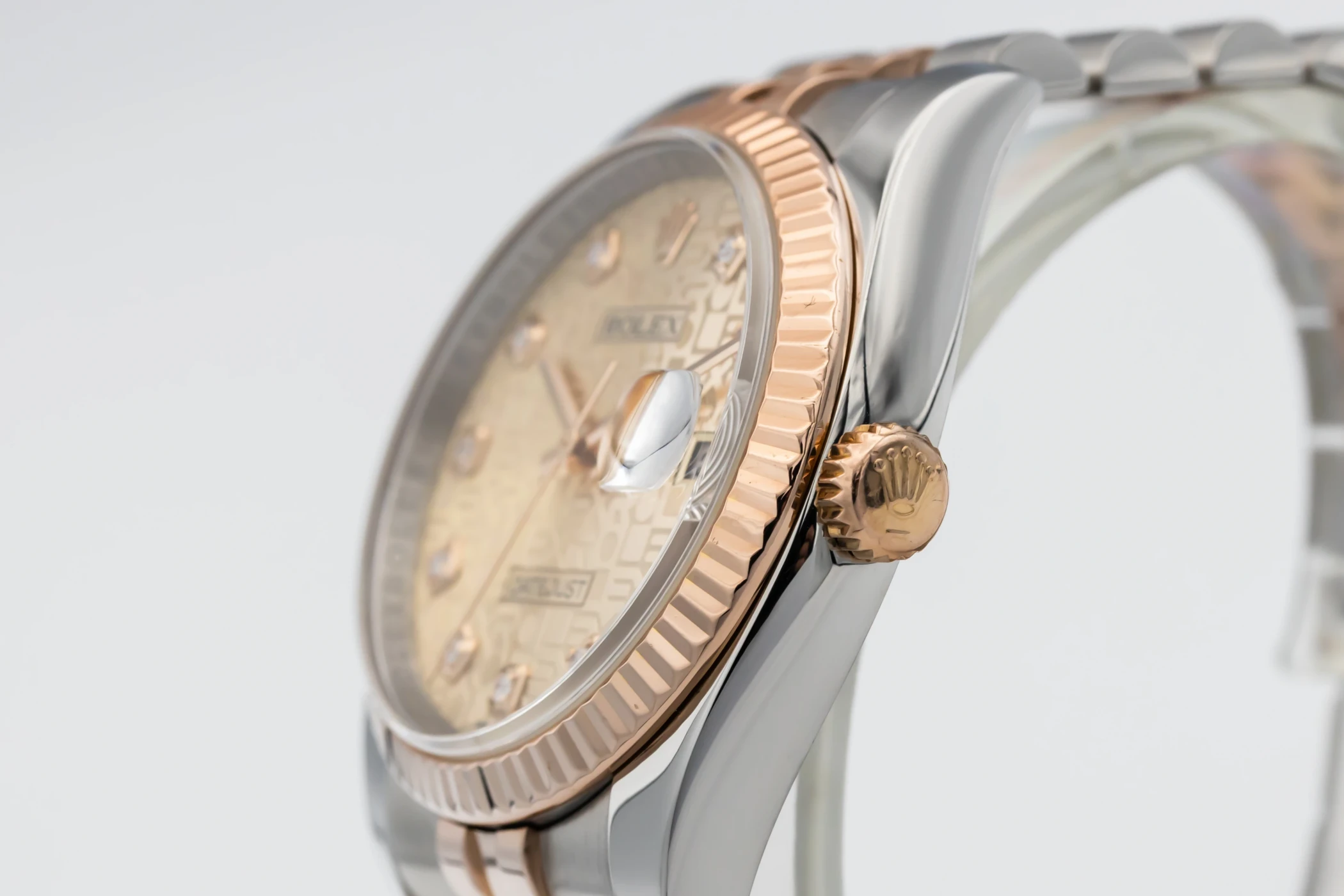 This 2005 Rolex DateJust 36mm features a sundust computerised dial with factory diamond markers and a stainless steel and 18ct rose gold jubilee bracelet. It fitted with a 18ct rose gold fluted bezel.