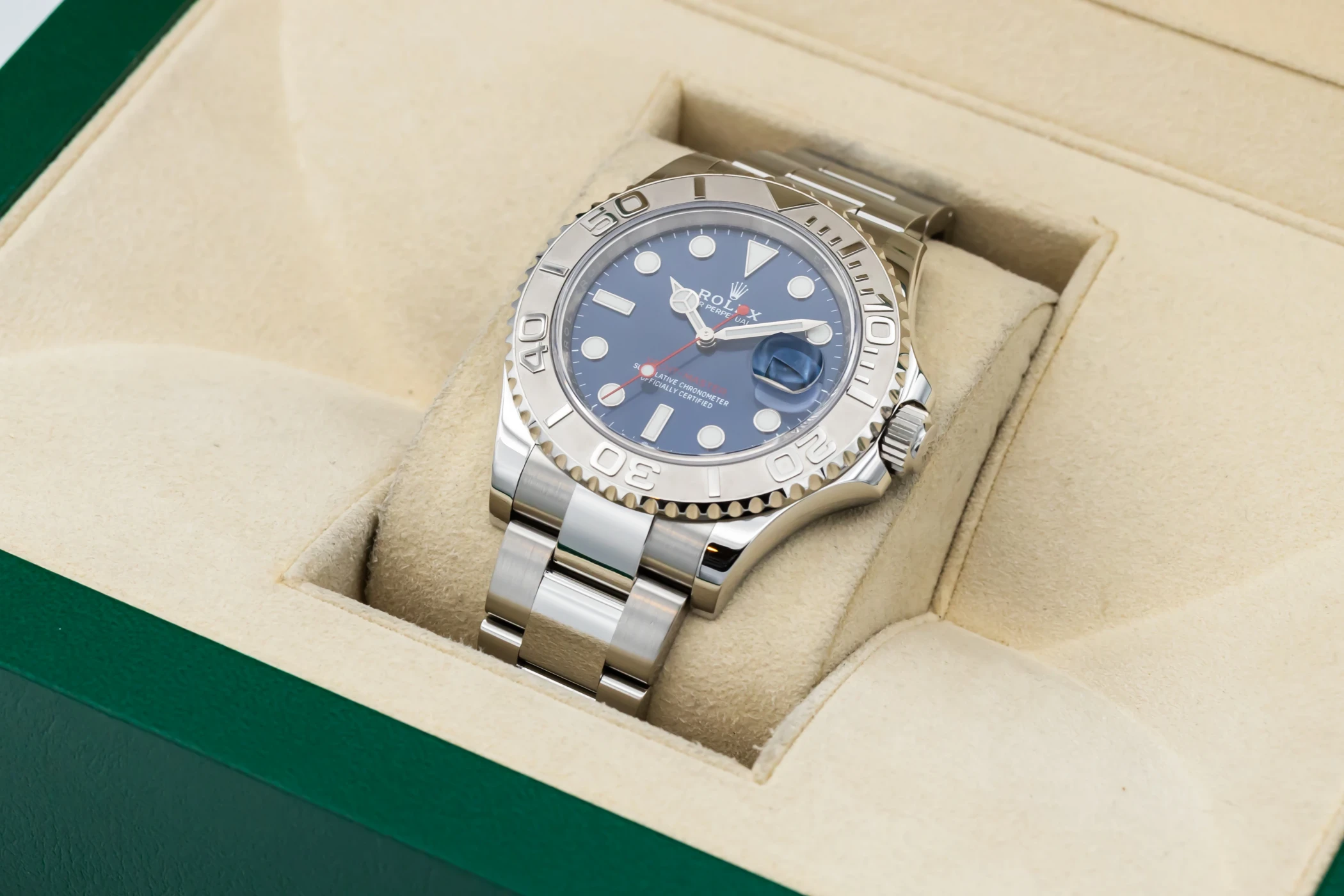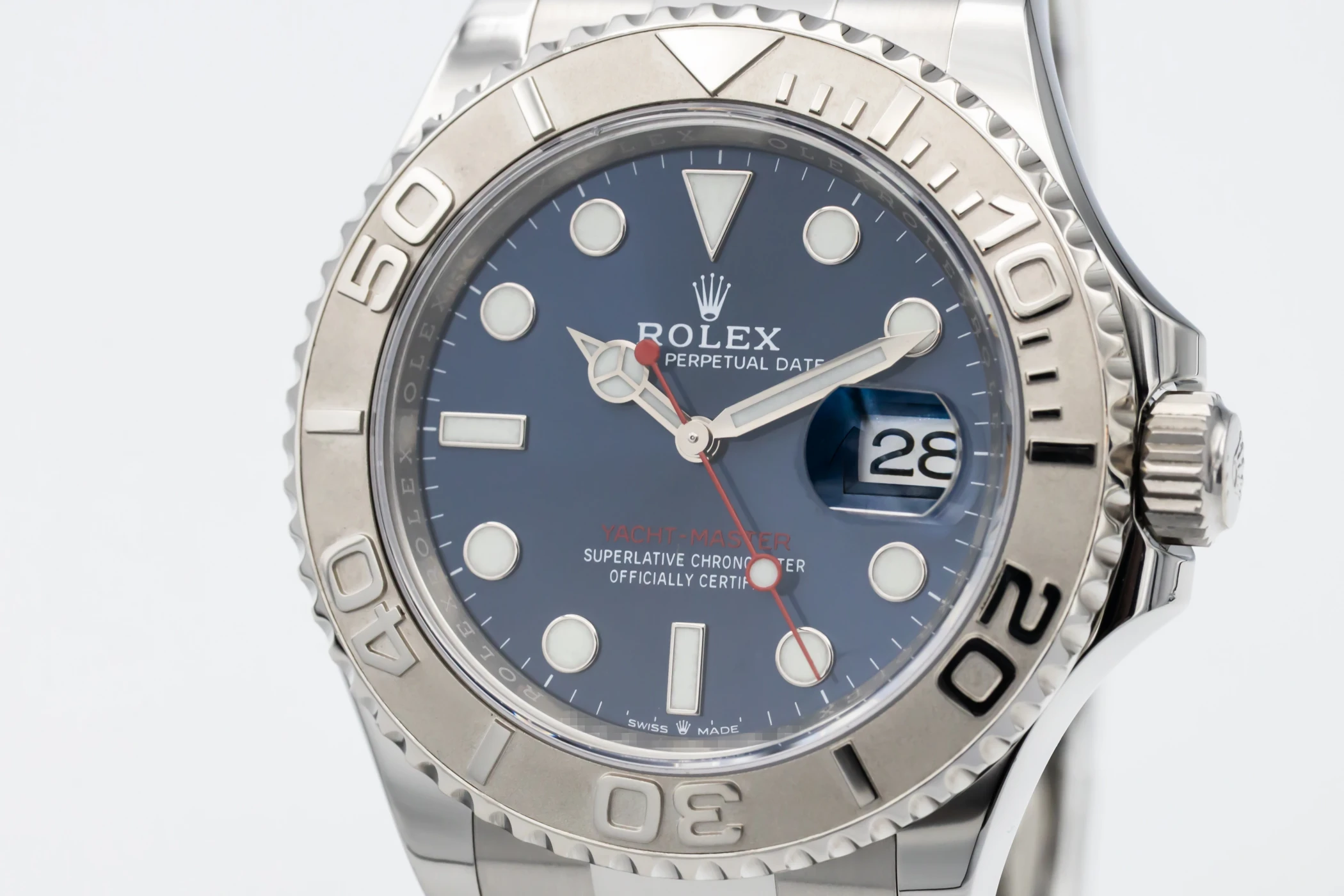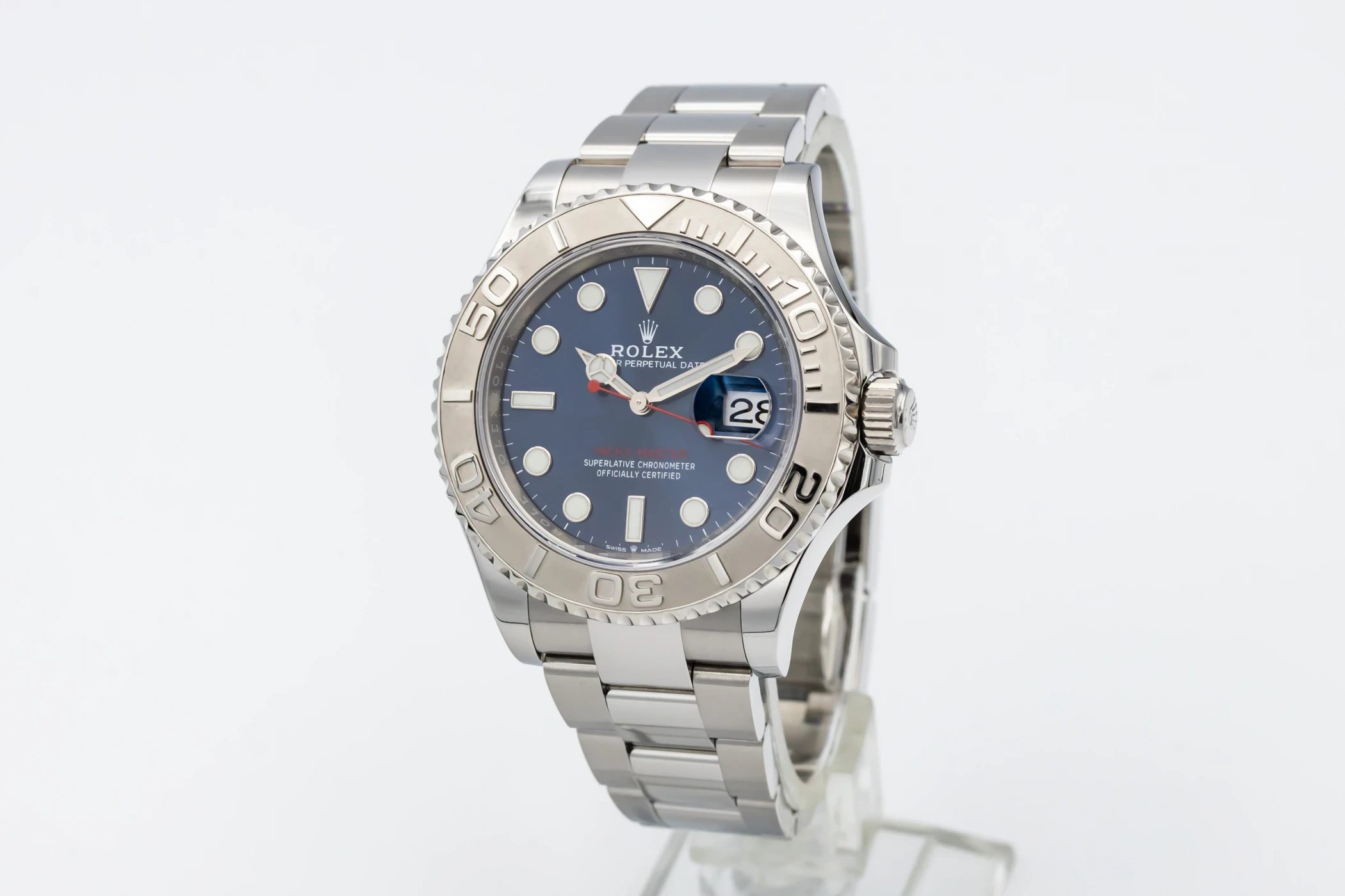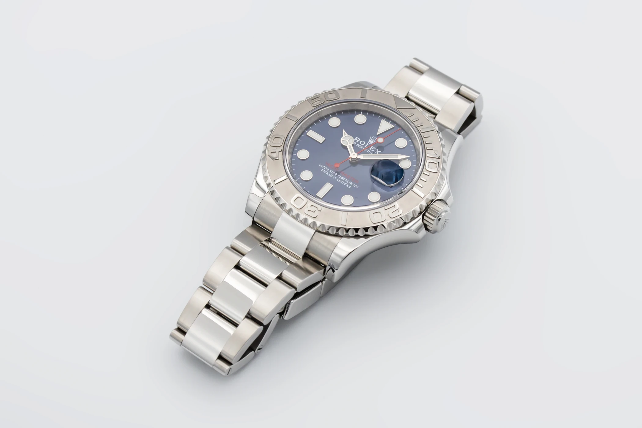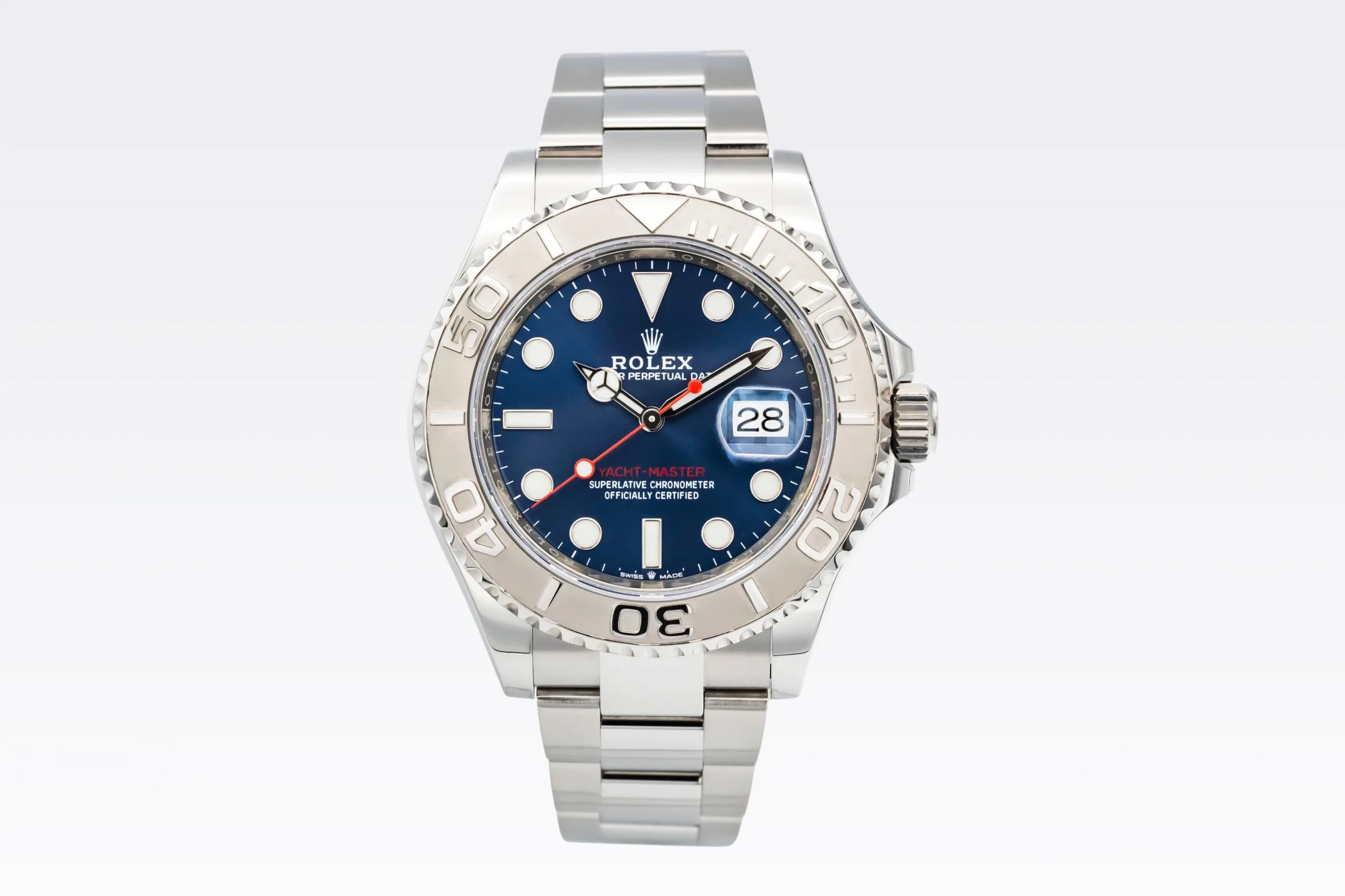 This 2021 Rolex Yacht-Master 40mm features a blue round index dial and a stainless steel oyster bracelet. It also features a platinum bidirectional rotatable bezel.