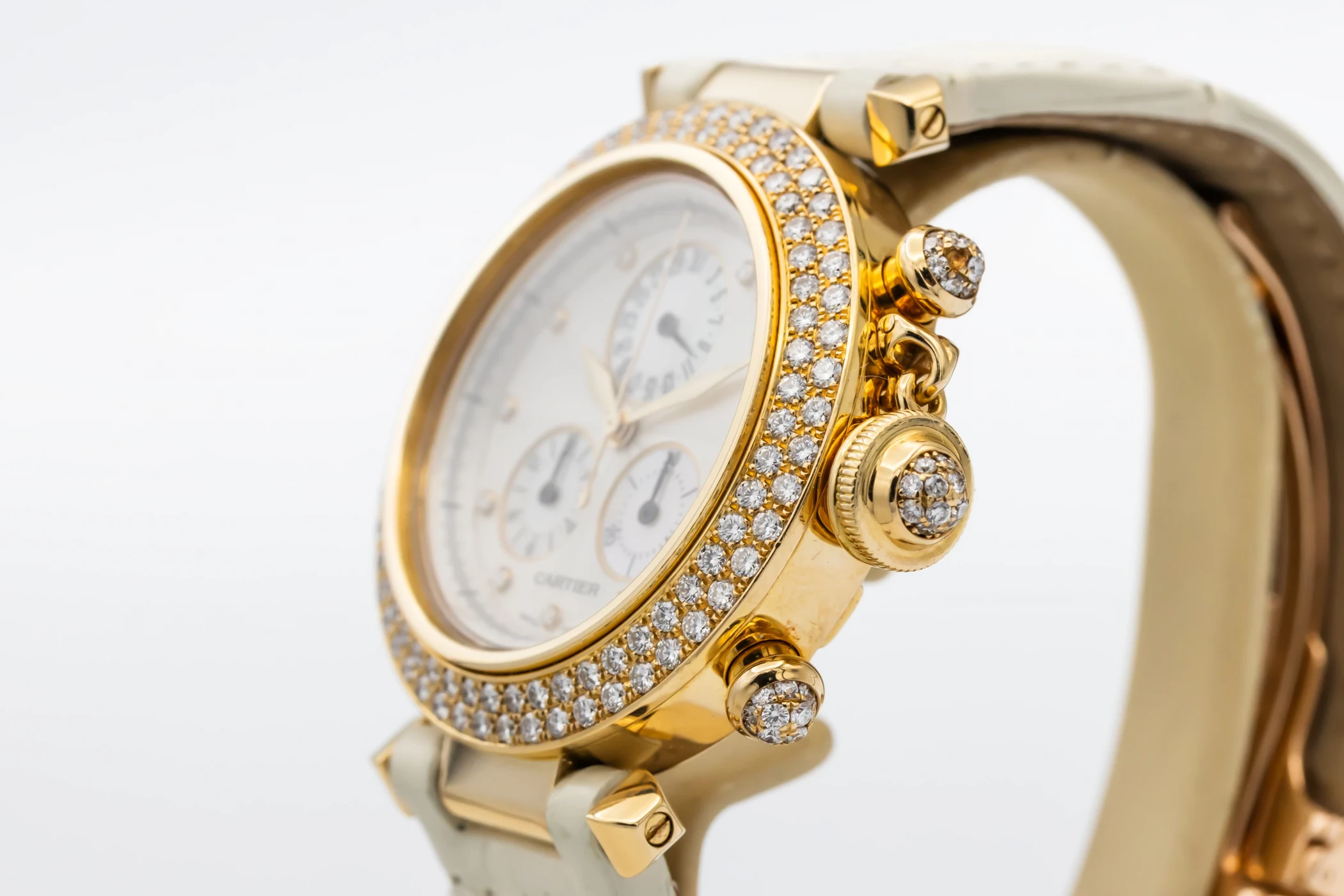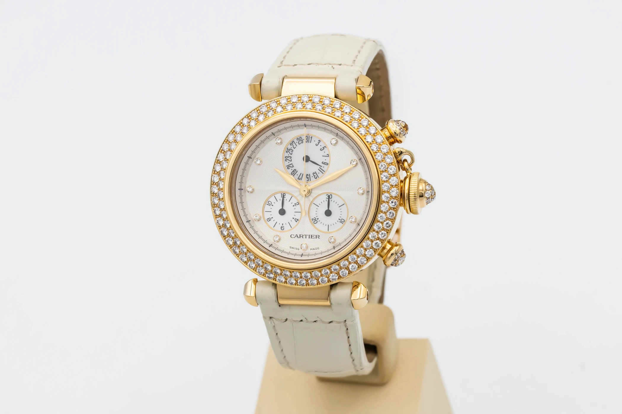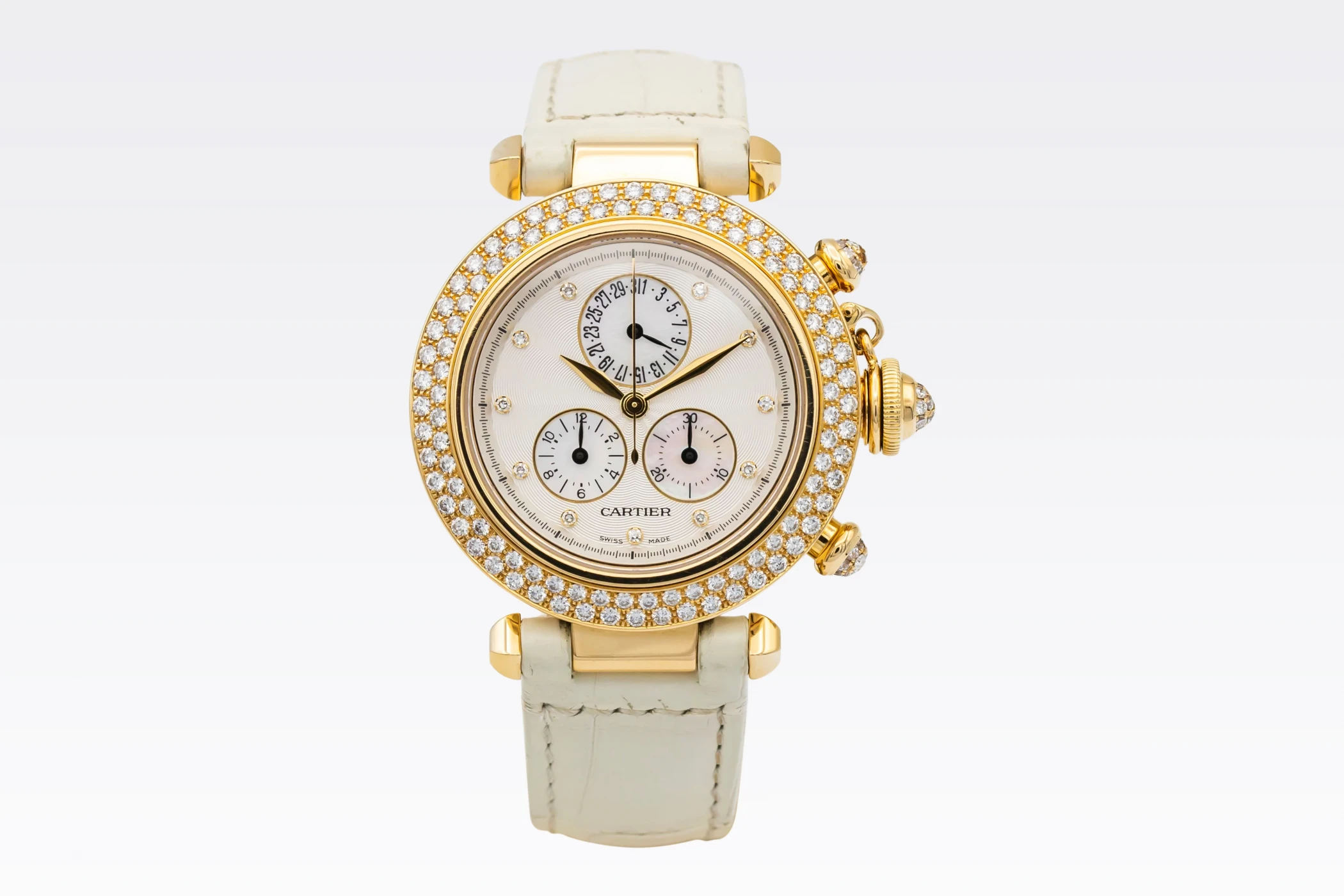 This circa 1990s Cartier Pasha Chrono 35mm features a silver diamond dial, 18ct yellow gold sword hands and three recessed chronograph sub-dials, creating a harmonious balance of functionality and refinement. Paired with a white leather strap and a diamond bezel to add a modern, feminine touch.