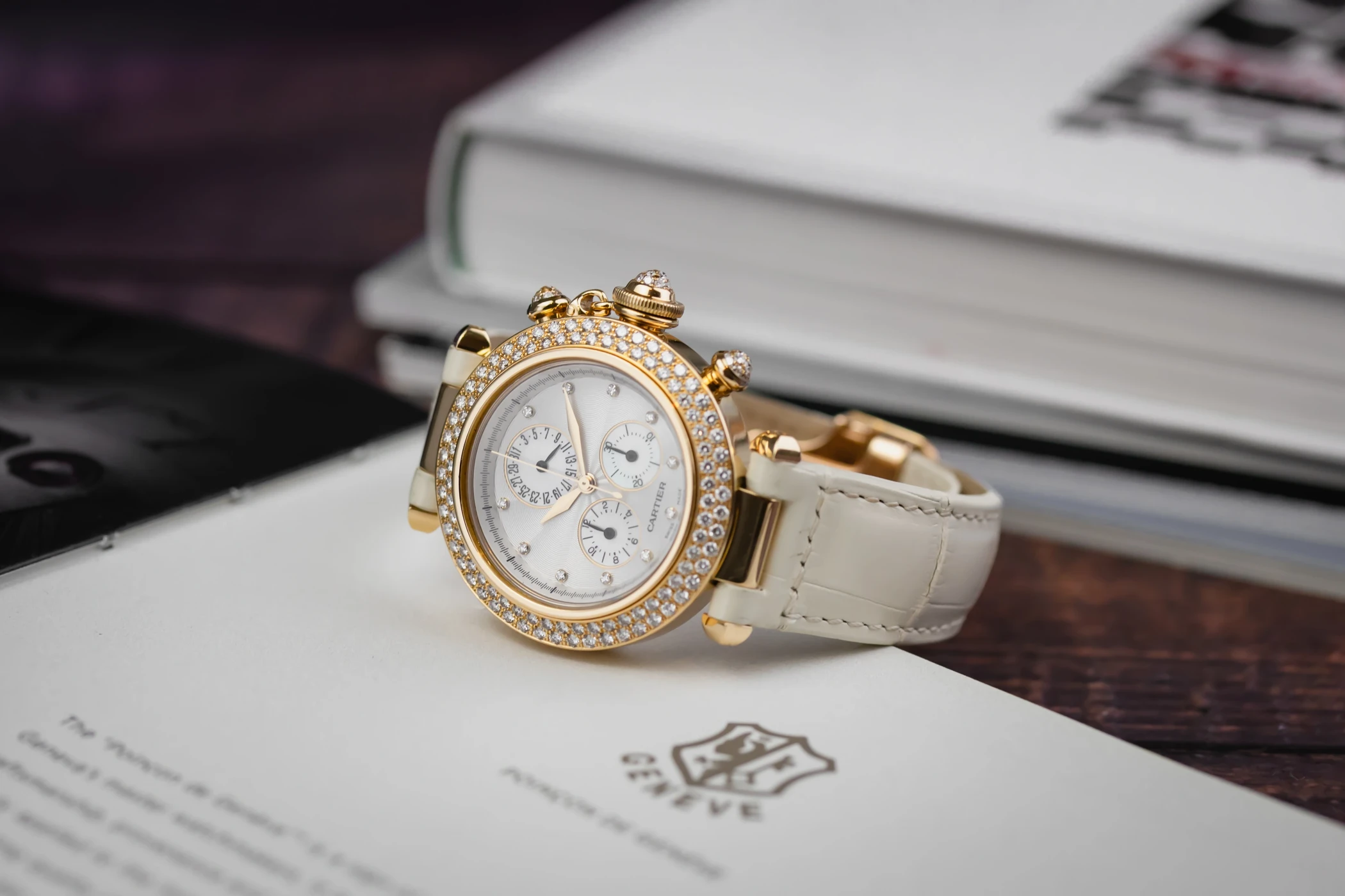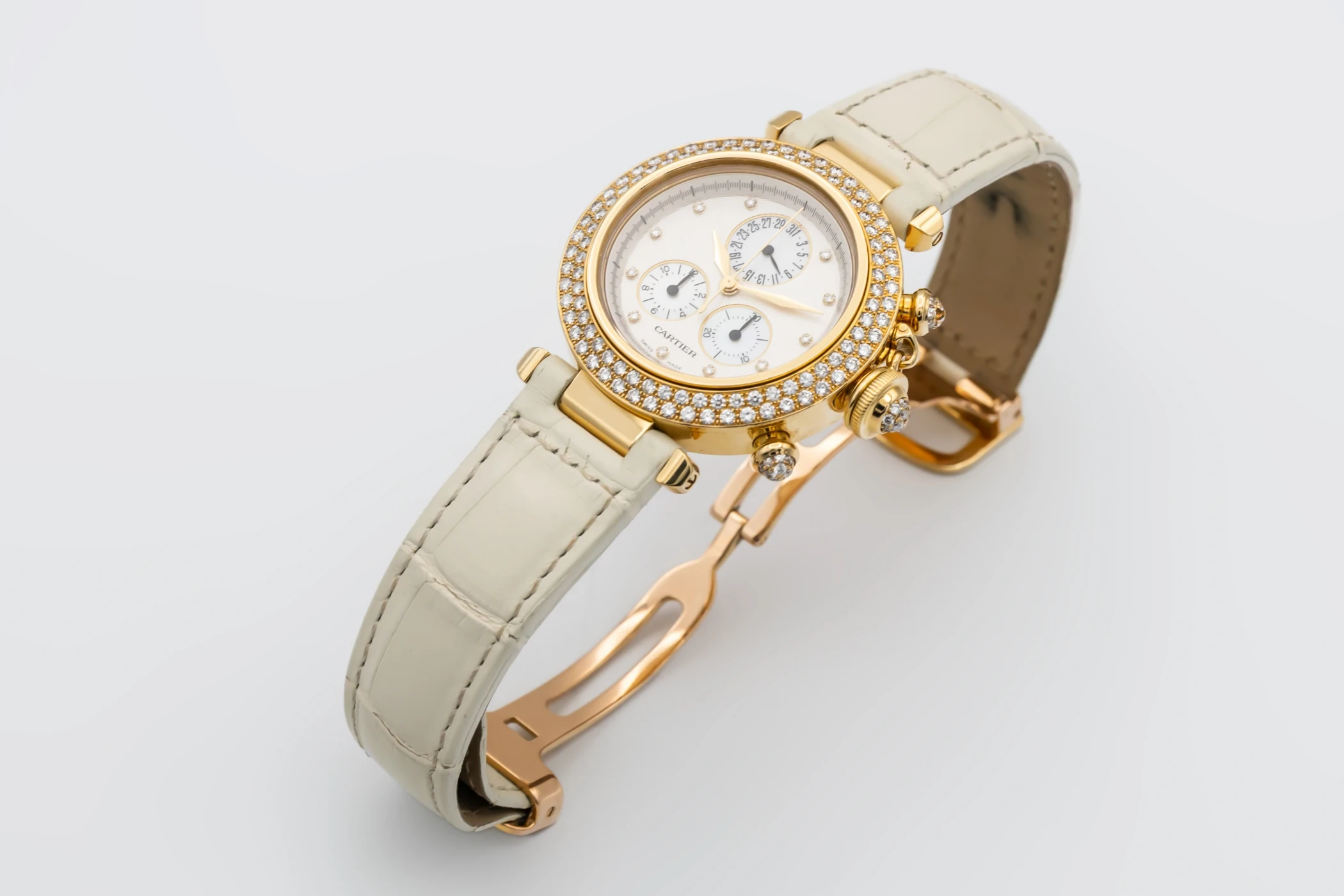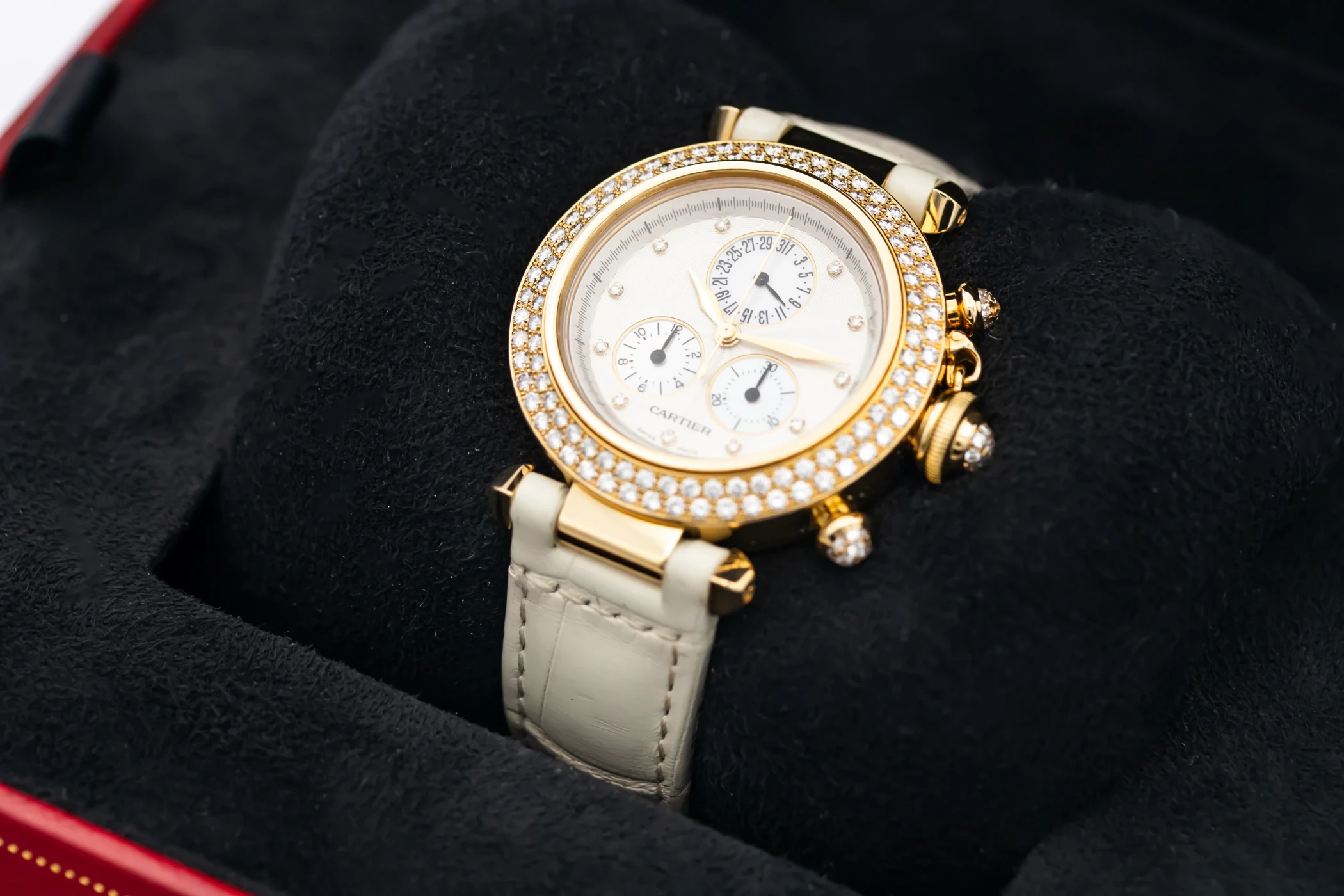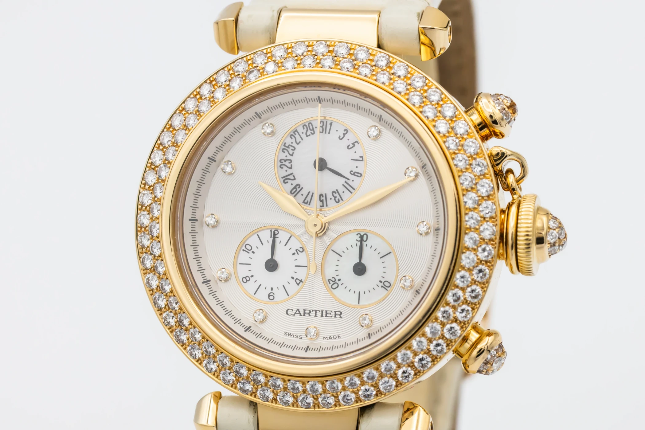 This circa 1990s Cartier Pasha Chrono 35mm features a silver diamond dial, 18ct yellow gold sword hands and three recessed chronograph sub-dials, creating a harmonious balance of functionality and refinement. Paired with a white leather strap and a diamond bezel to add a modern, feminine touch.