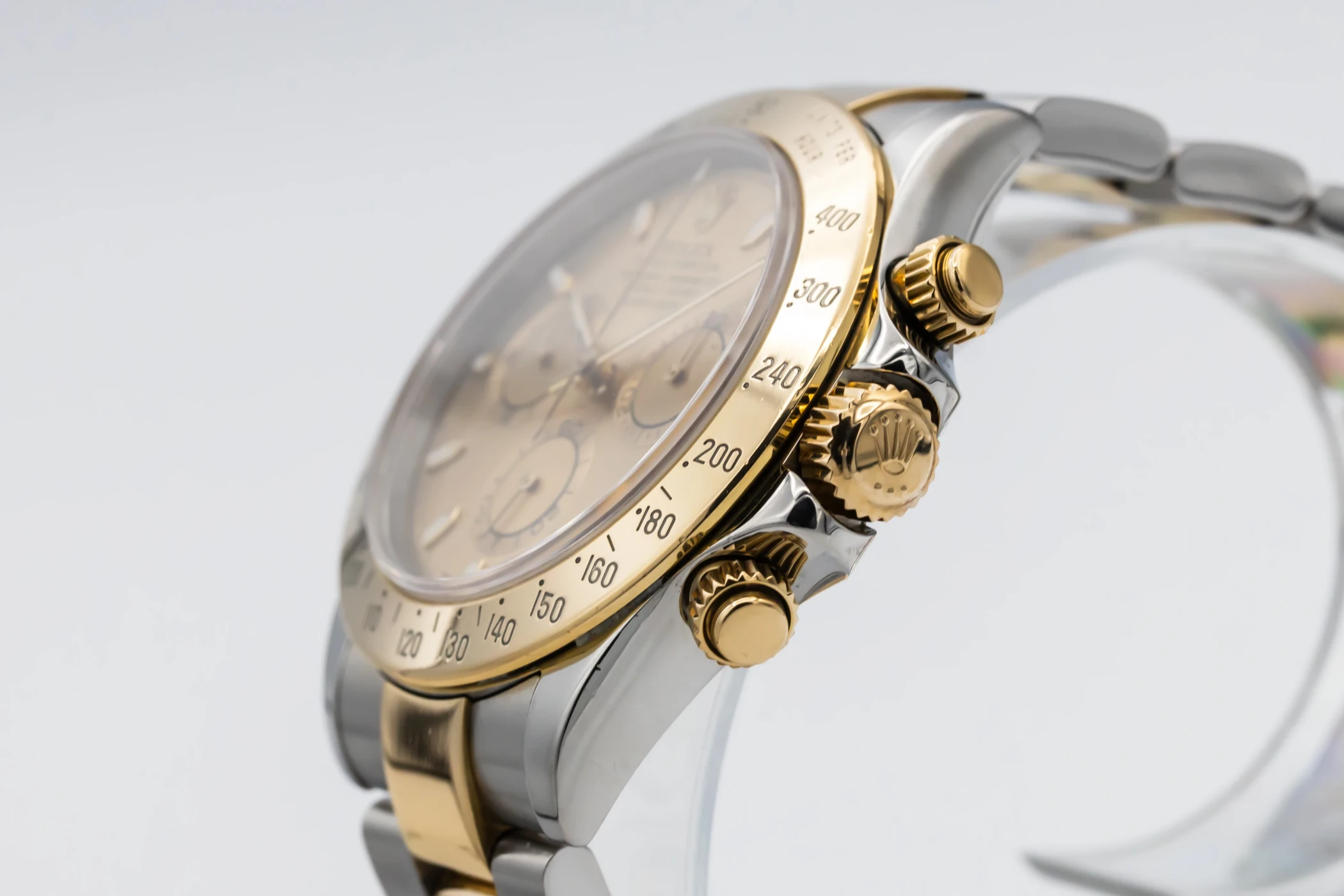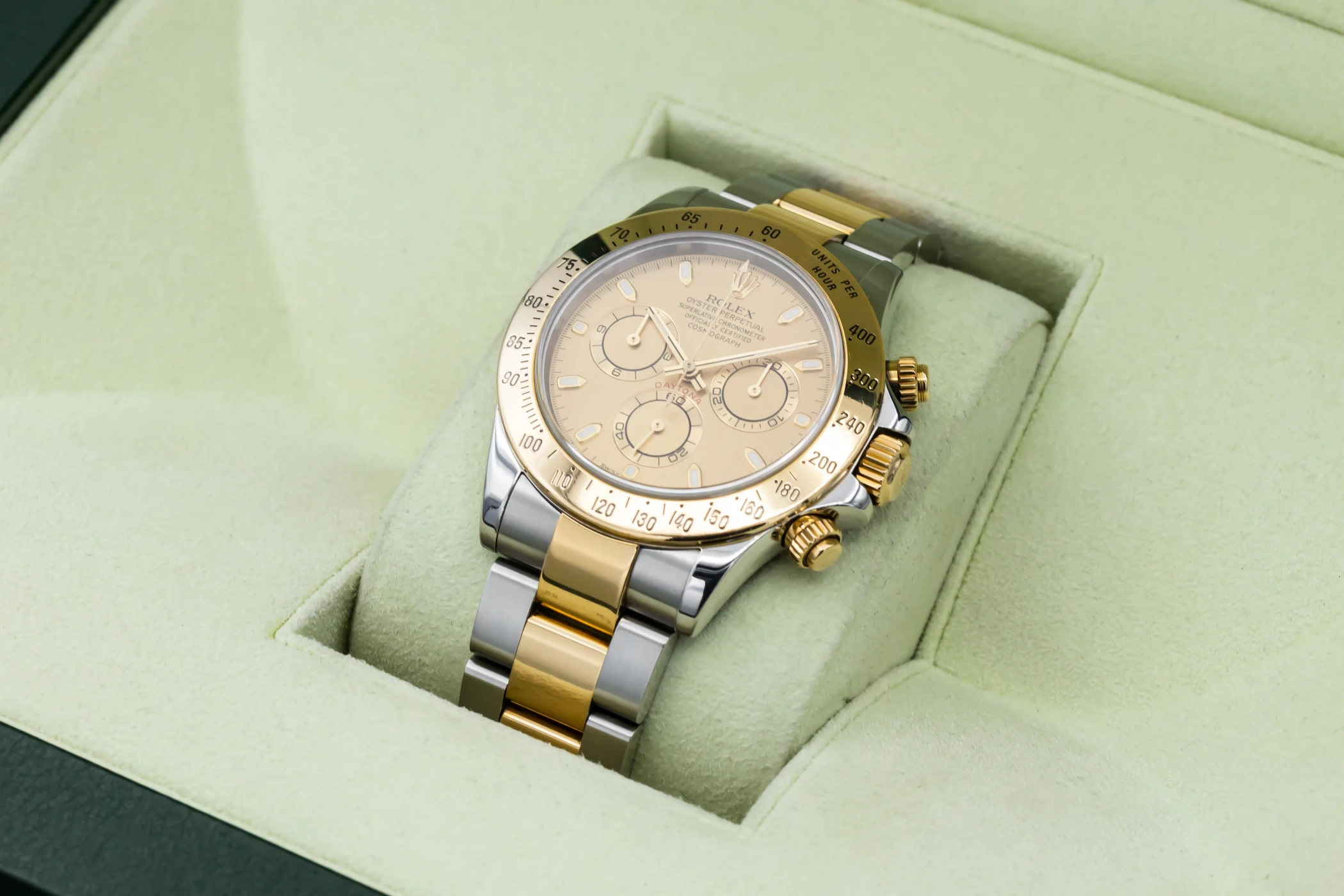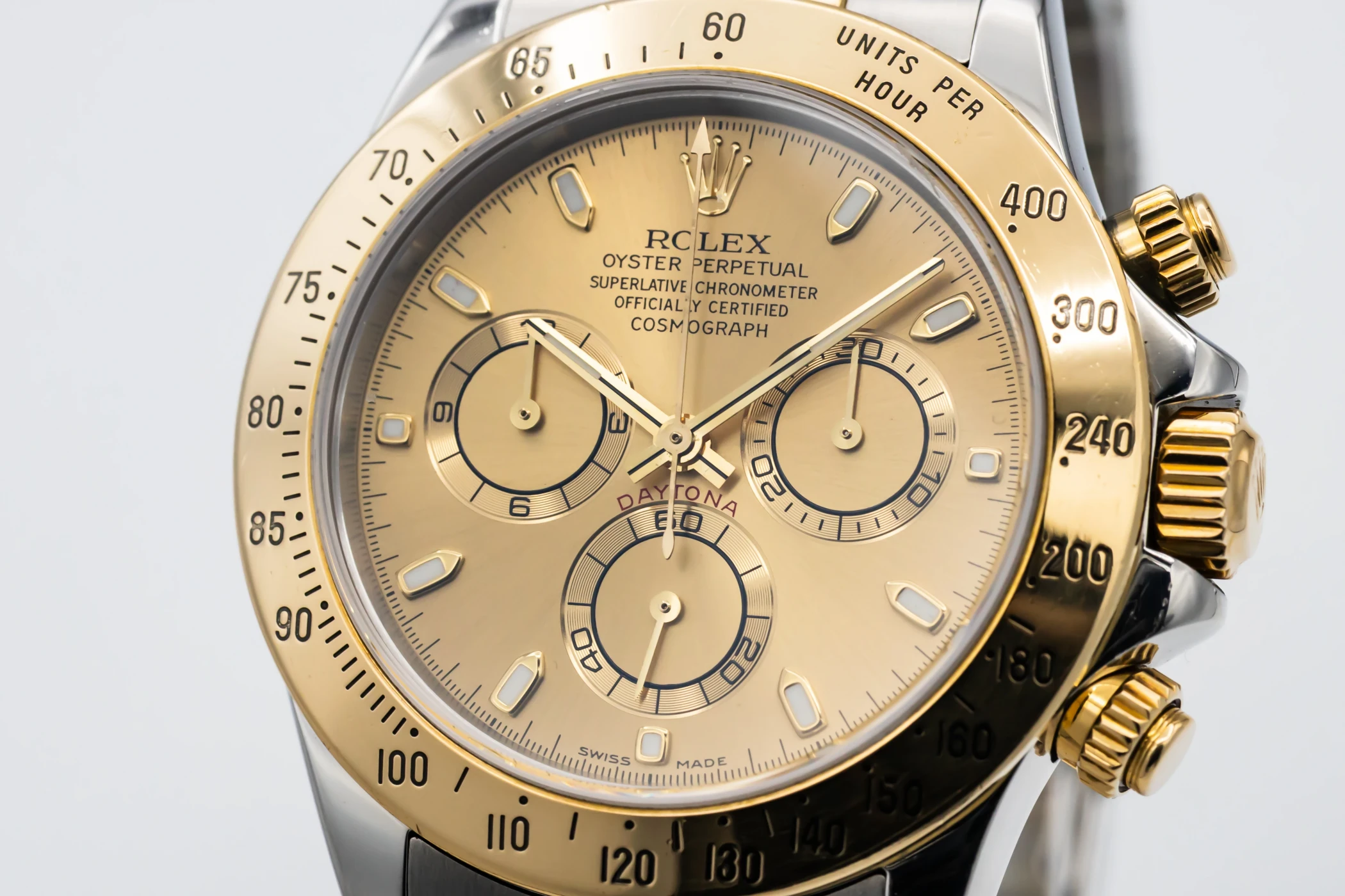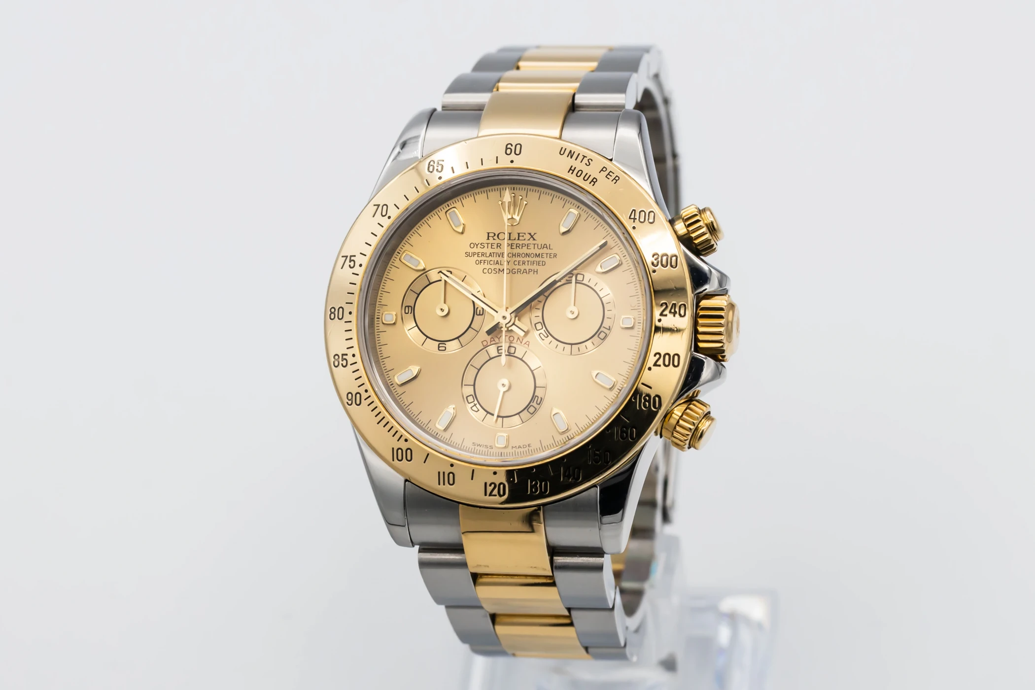 This 2001 Rolex Cosmograph Daytona 40mm features a champagne dial with contrasting gold sub-dials, luminous hour markers, and the signature tachymeter scale engraved on the polished yellow gold bezel. Paired with a two-tone Oyster bracelet that completes the design with a balance of robustness and refined elegance.