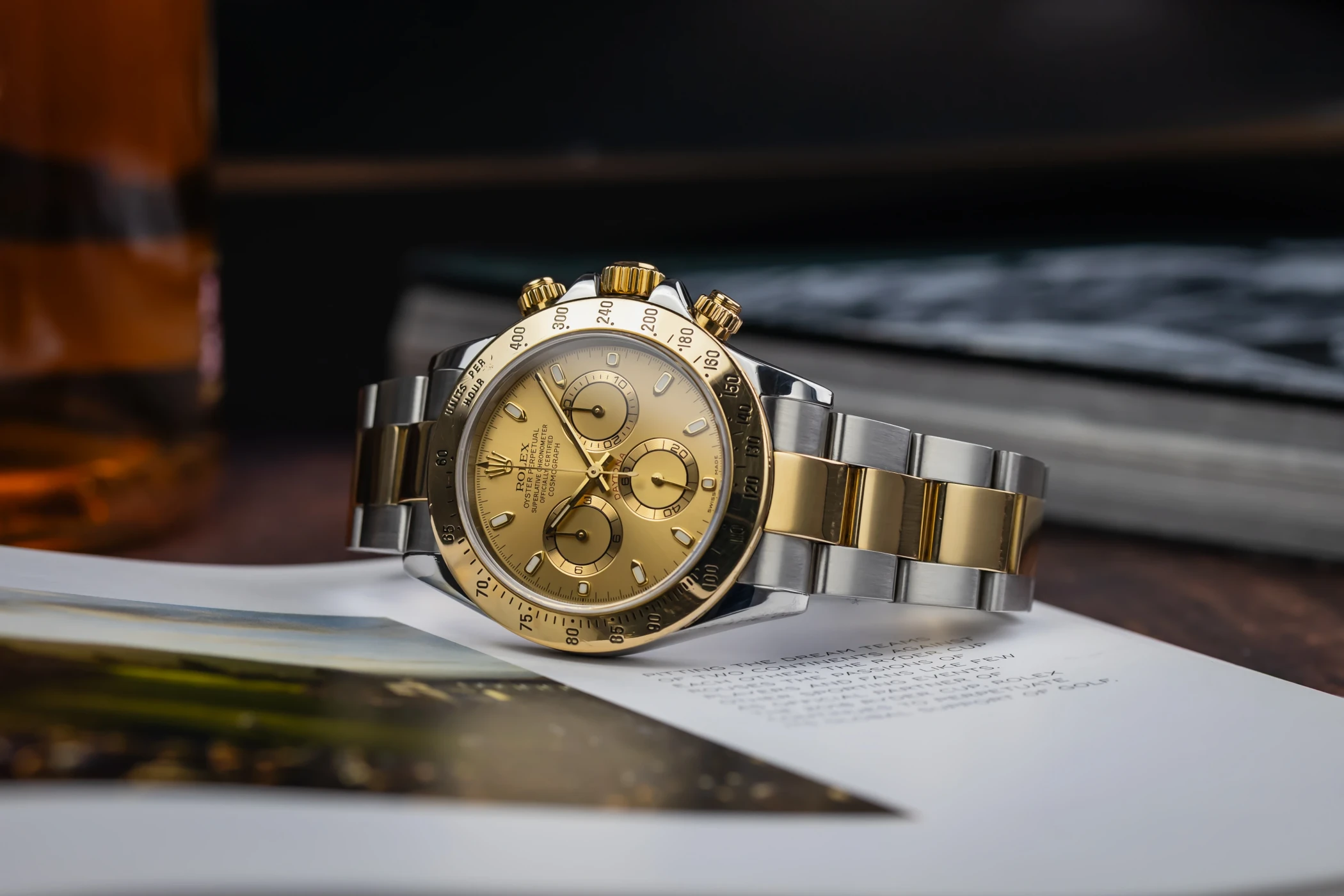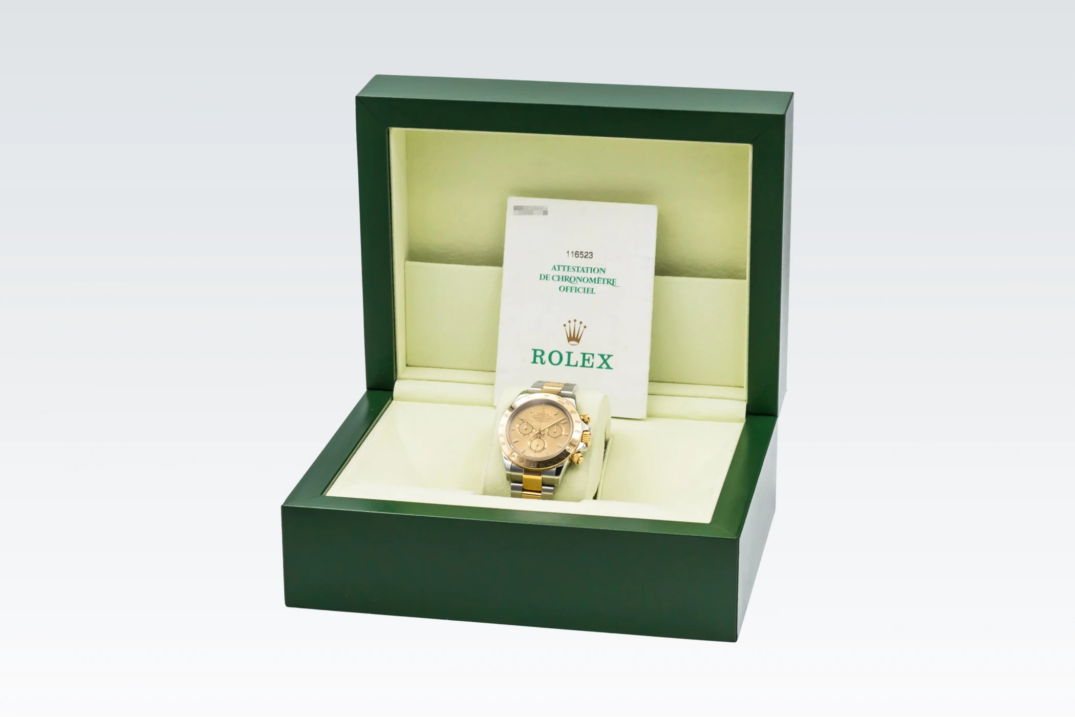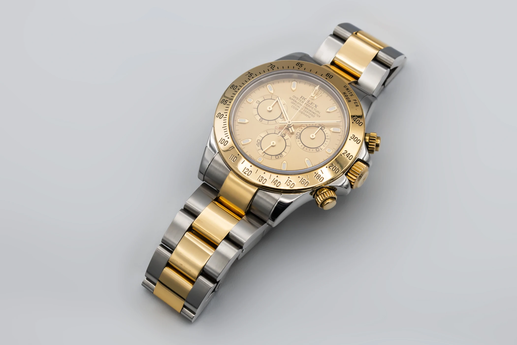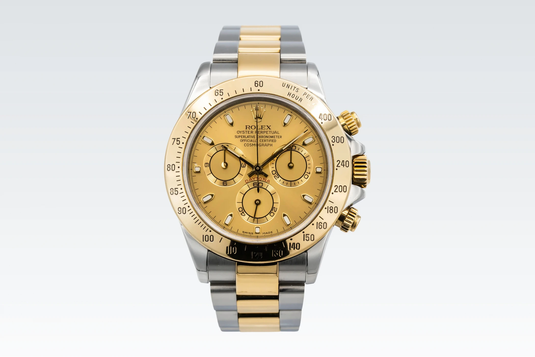 This 2001 Rolex Cosmograph Daytona 40mm features a champagne dial with contrasting gold sub-dials, luminous hour markers, and the signature tachymeter scale engraved on the polished yellow gold bezel. Paired with a two-tone Oyster bracelet that completes the design with a balance of robustness and refined elegance.