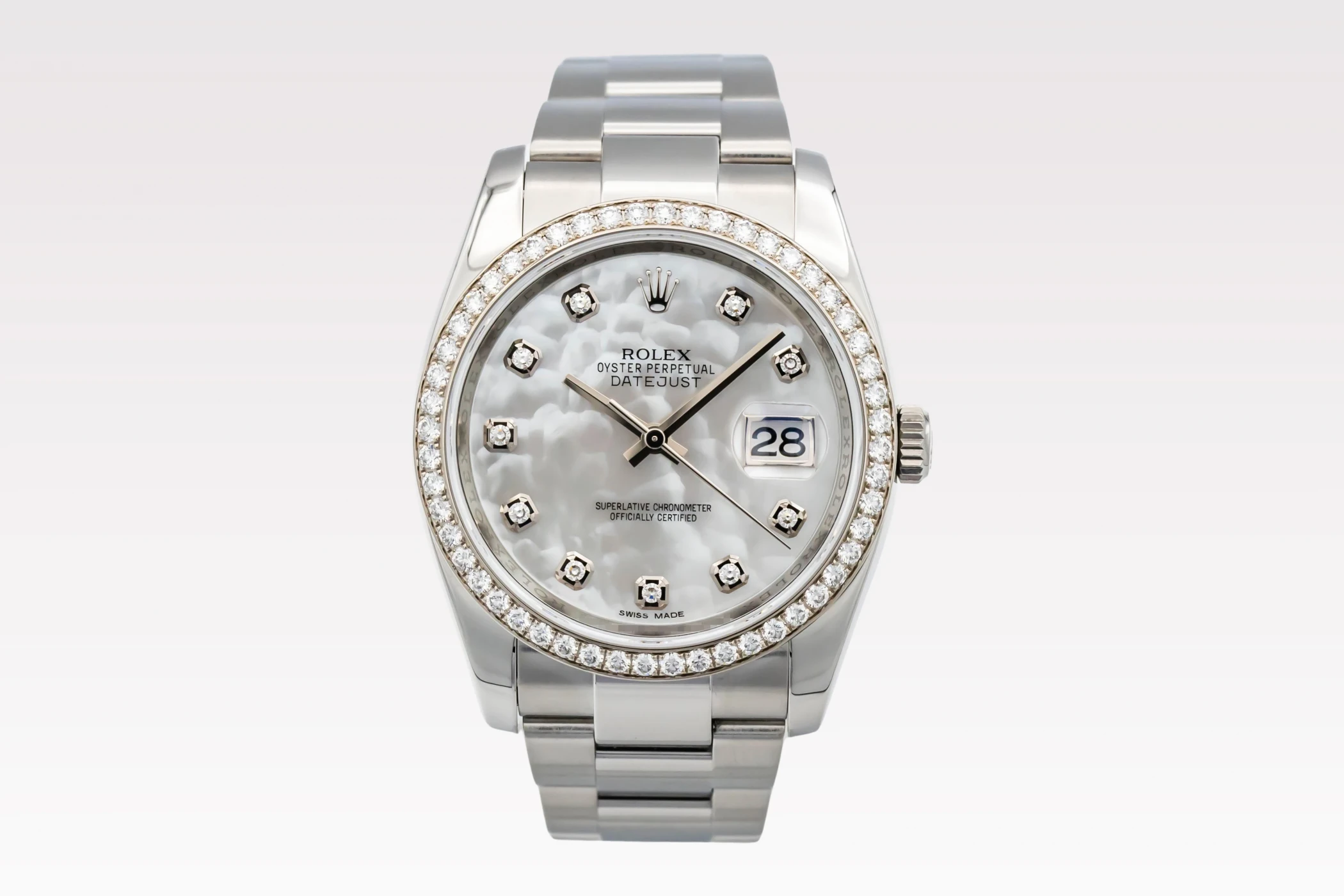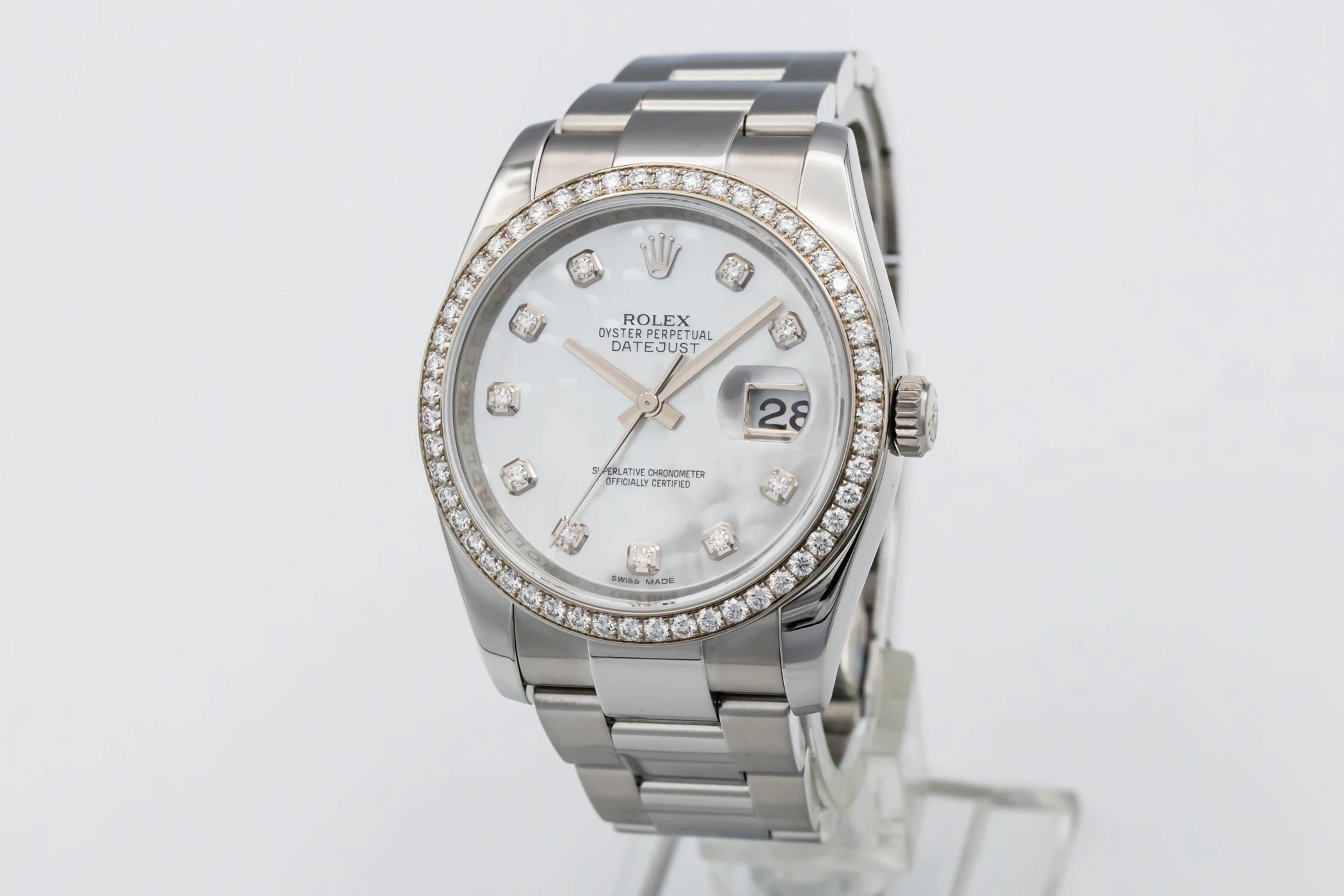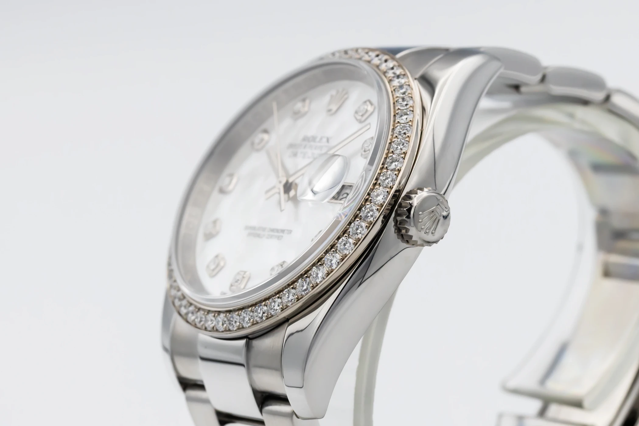 This 2015 stunning Rolex Datejust 36mm features a robust stainless steel Oyster case paired with a brilliant factory-set diamond bezel, offering a perfect balance of durability and elegance. The mother of pearl dial is complemented by diamond markers and a Cyclops date window at 3 o’clock, all protected beneath a scratch-resistant sapphire crystal.