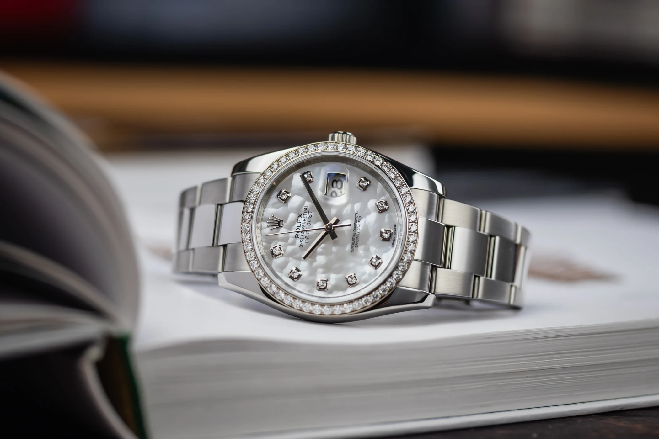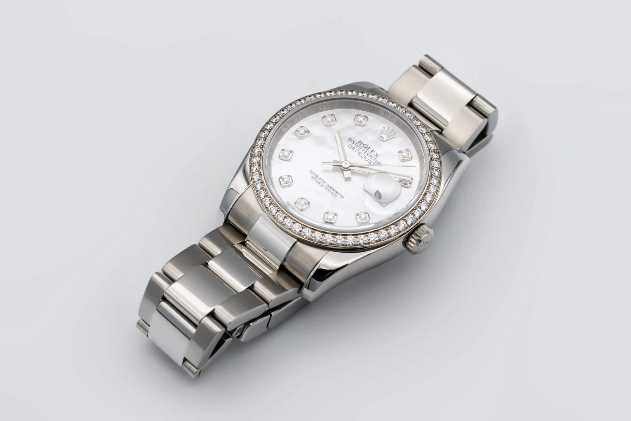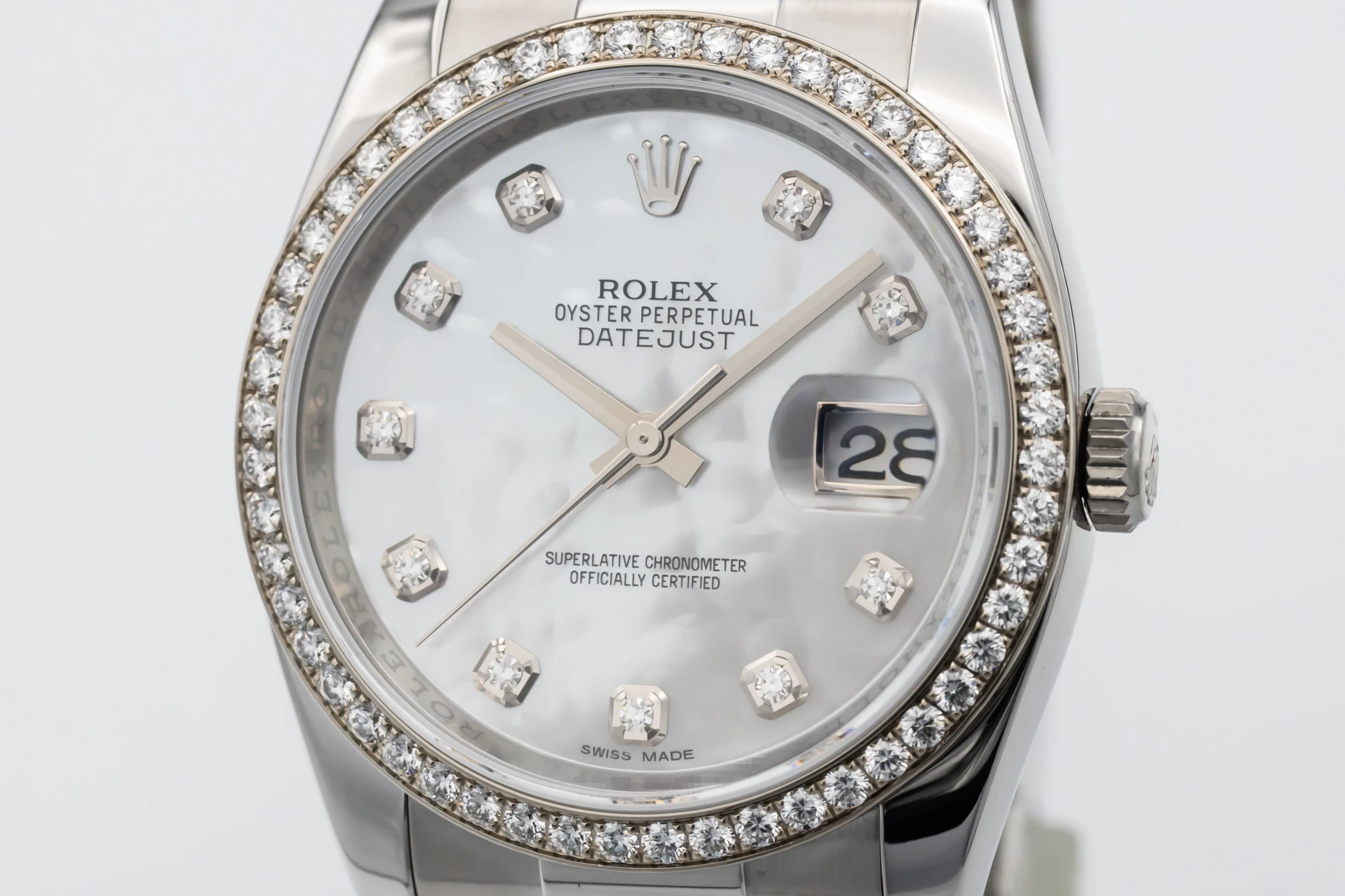 This 2015 stunning Rolex Datejust 36mm features a robust stainless steel Oyster case paired with a brilliant factory-set diamond bezel, offering a perfect balance of durability and elegance. The mother of pearl dial is complemented by diamond markers and a Cyclops date window at 3 o’clock, all protected beneath a scratch-resistant sapphire crystal.