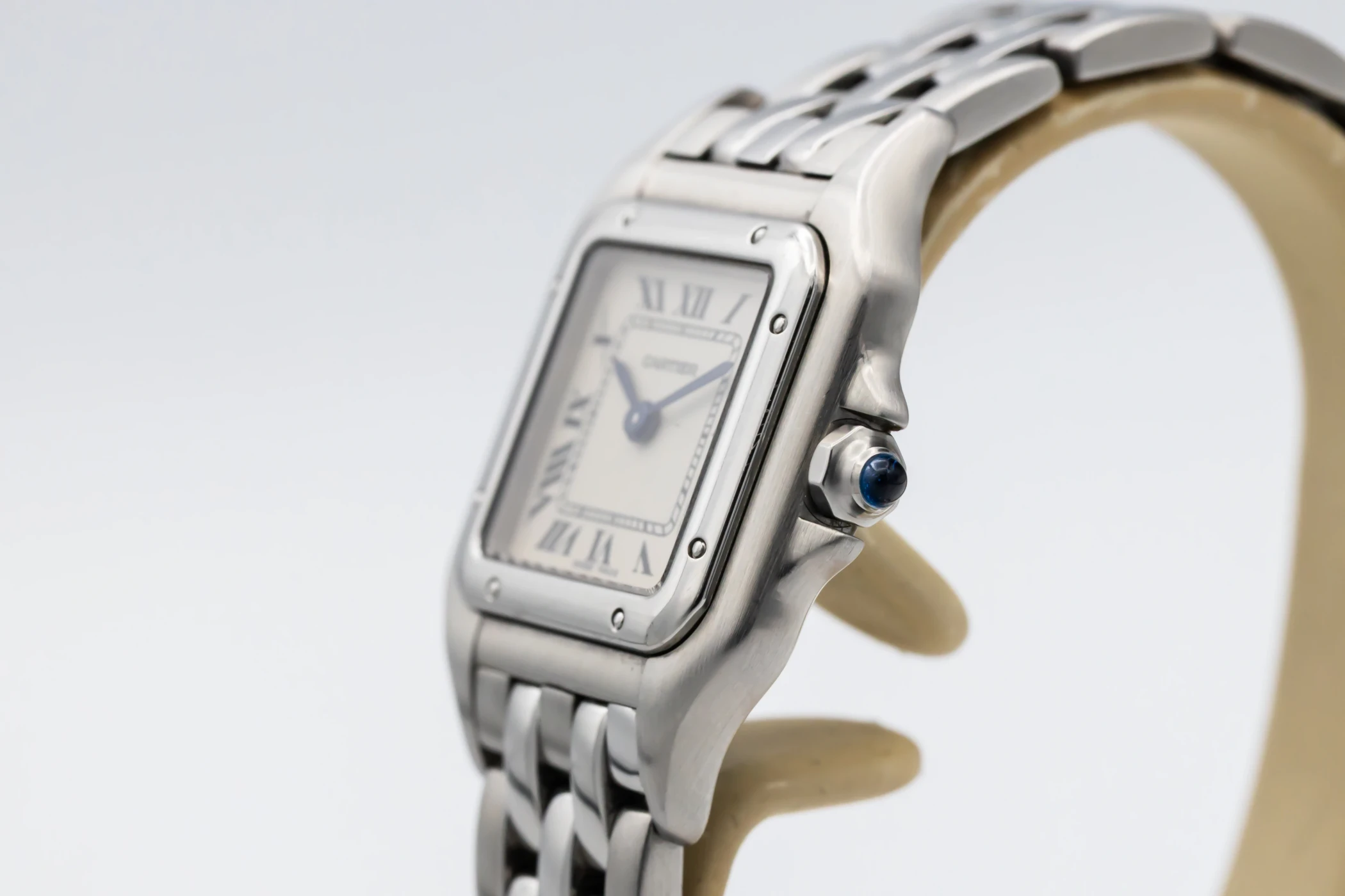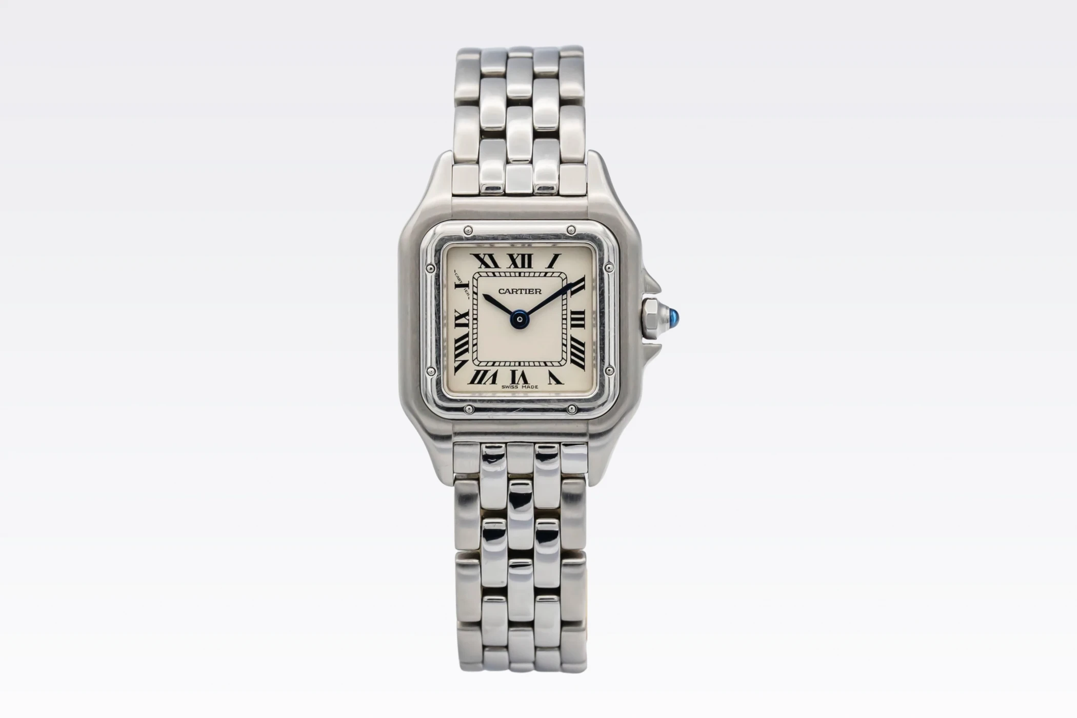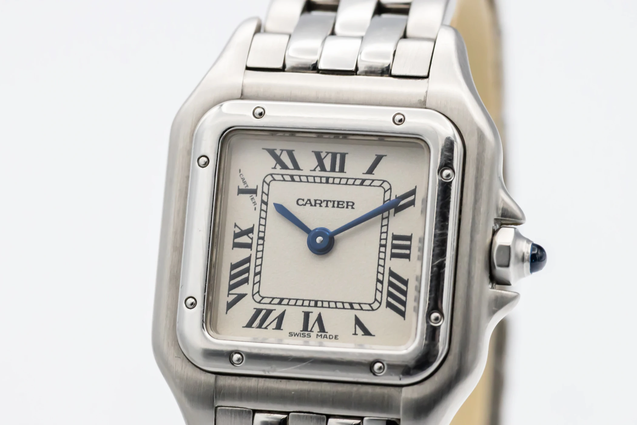 This circa 2000s Cartier Panthere 22mm is crafted in polished stainless steel, featuring a square-cushion case with subtly rounded edges and Cartier’s signature crowned octagonal winding crown set with a blue synthetic spinel. The silvered grained dial displays bold black Roman numeral hour markers, blued-steel sword hands and the discreet “Cartier” signature within the X numeral.