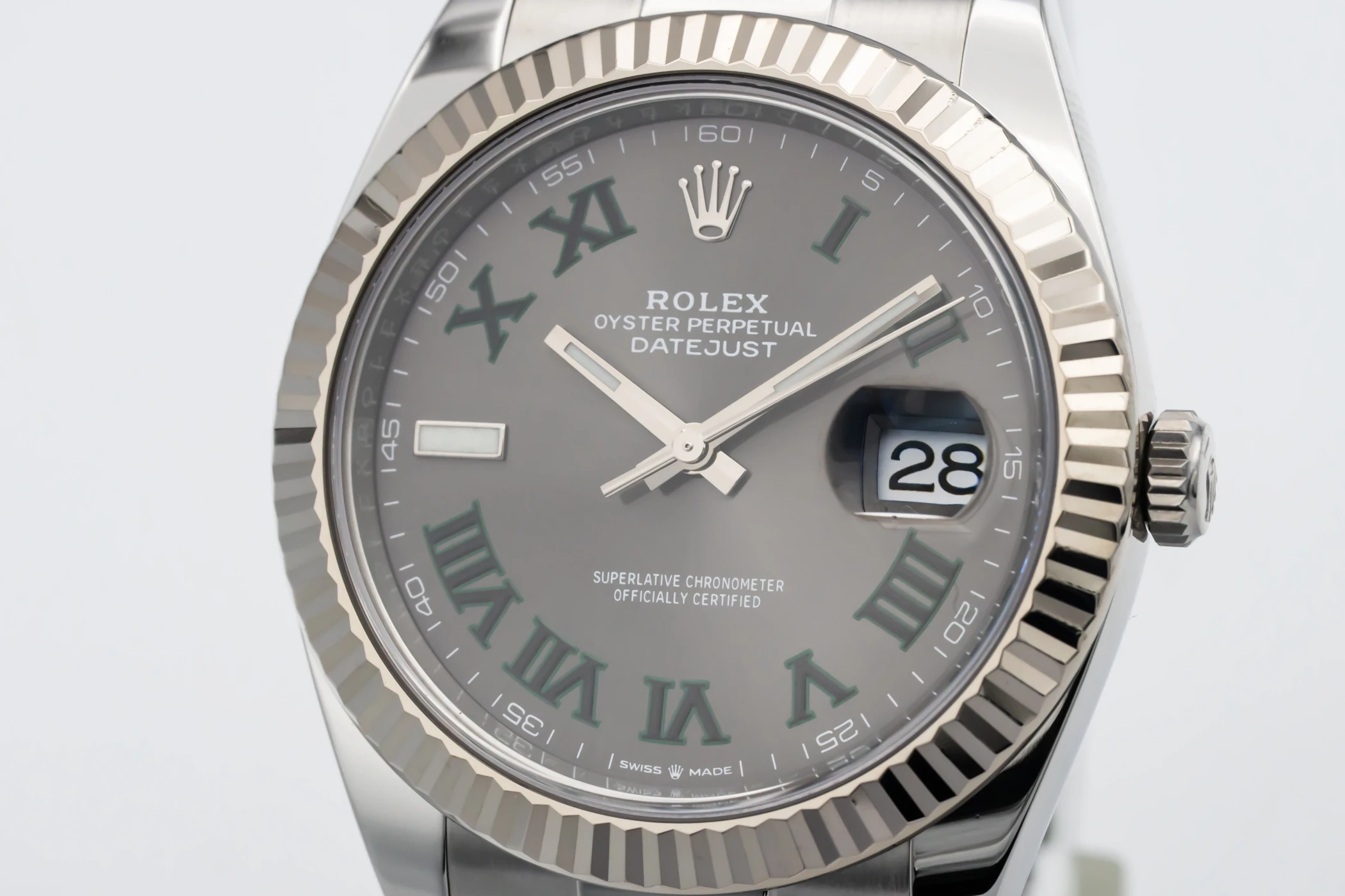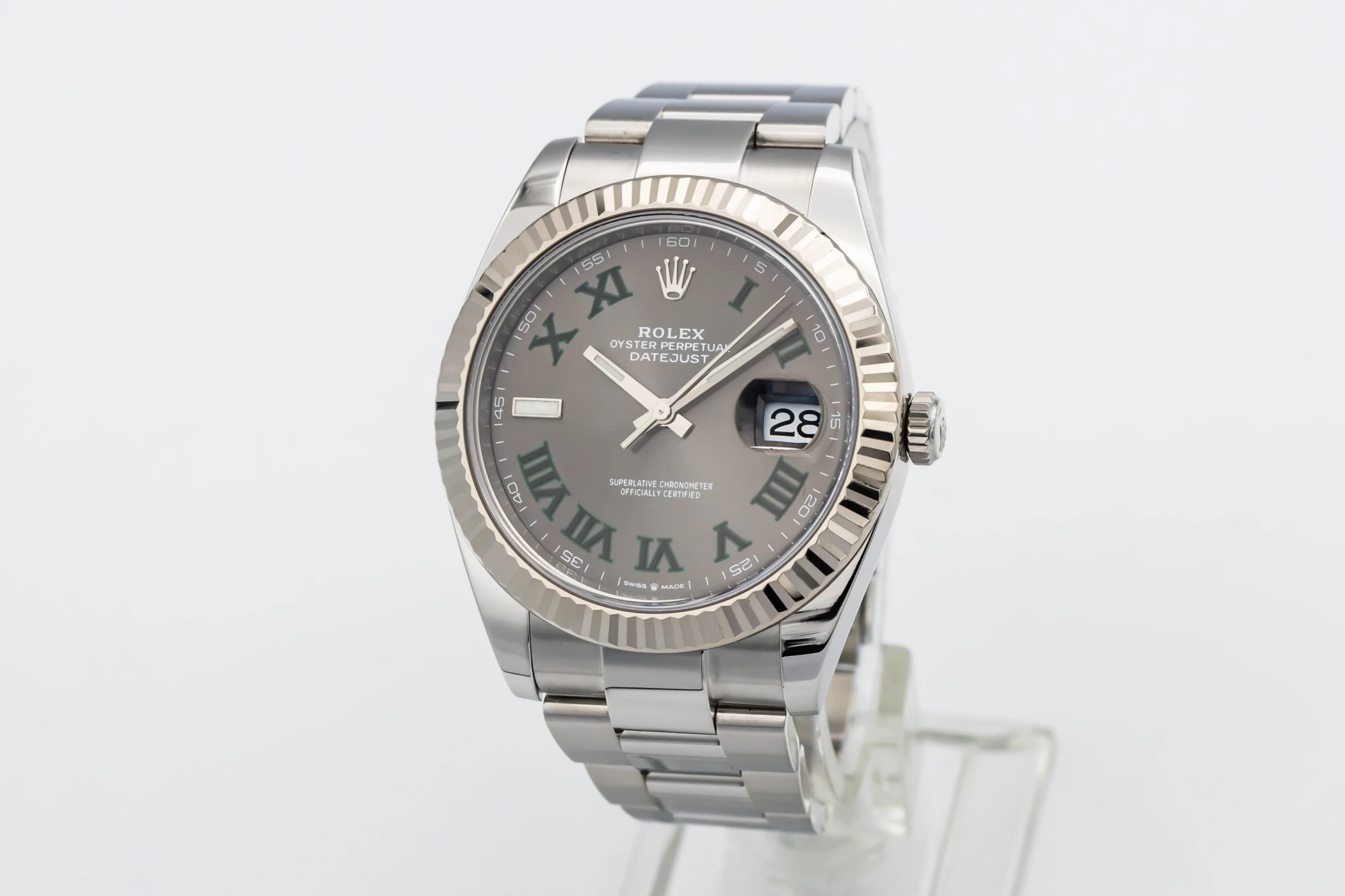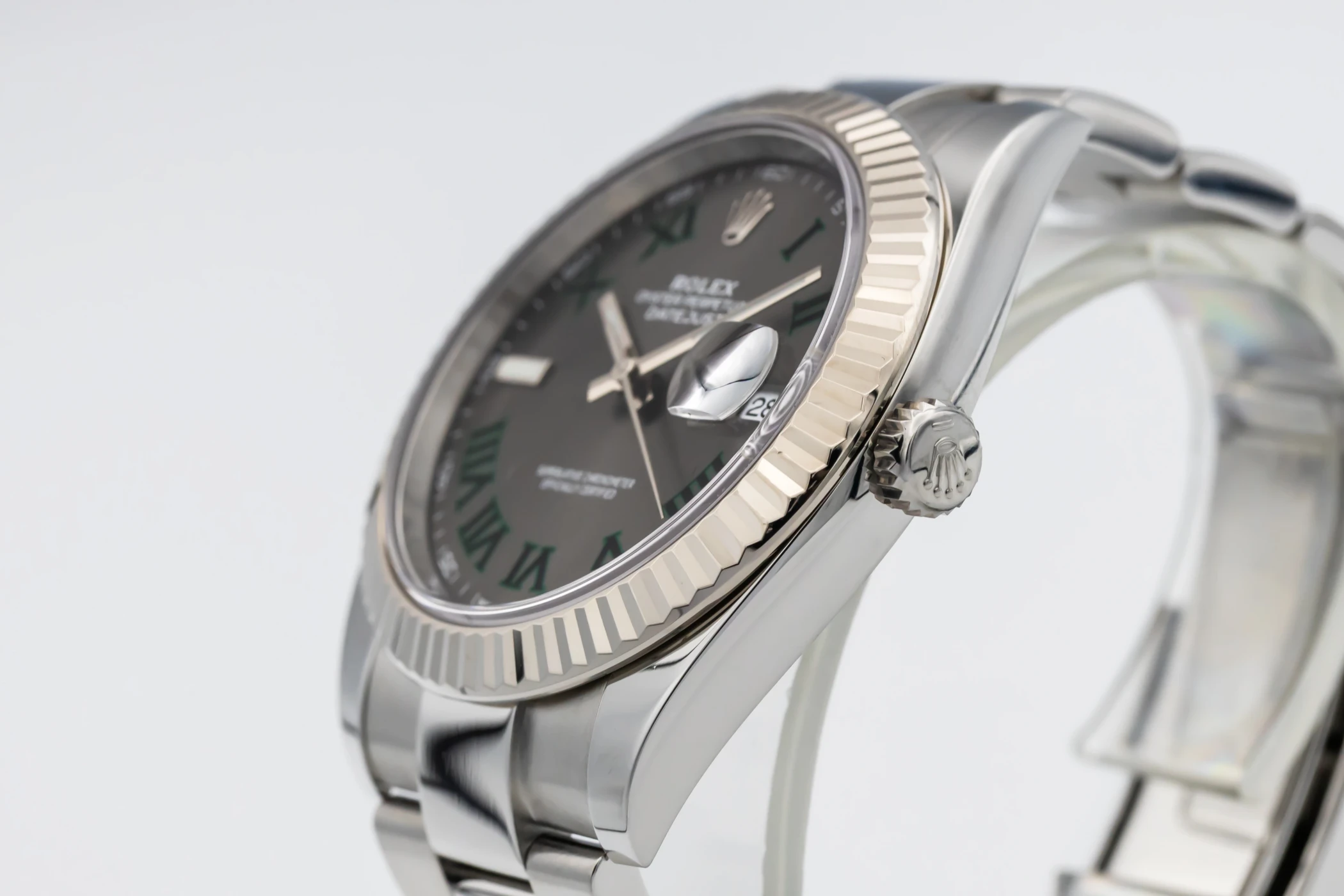 This 2020 Rolex DateJust 41mm 'Wimbledon' features a slate gray dial with roman numerals and a stainless steel oyster bracelet. It is also fitted with a 18ct white gold fluted bezel.