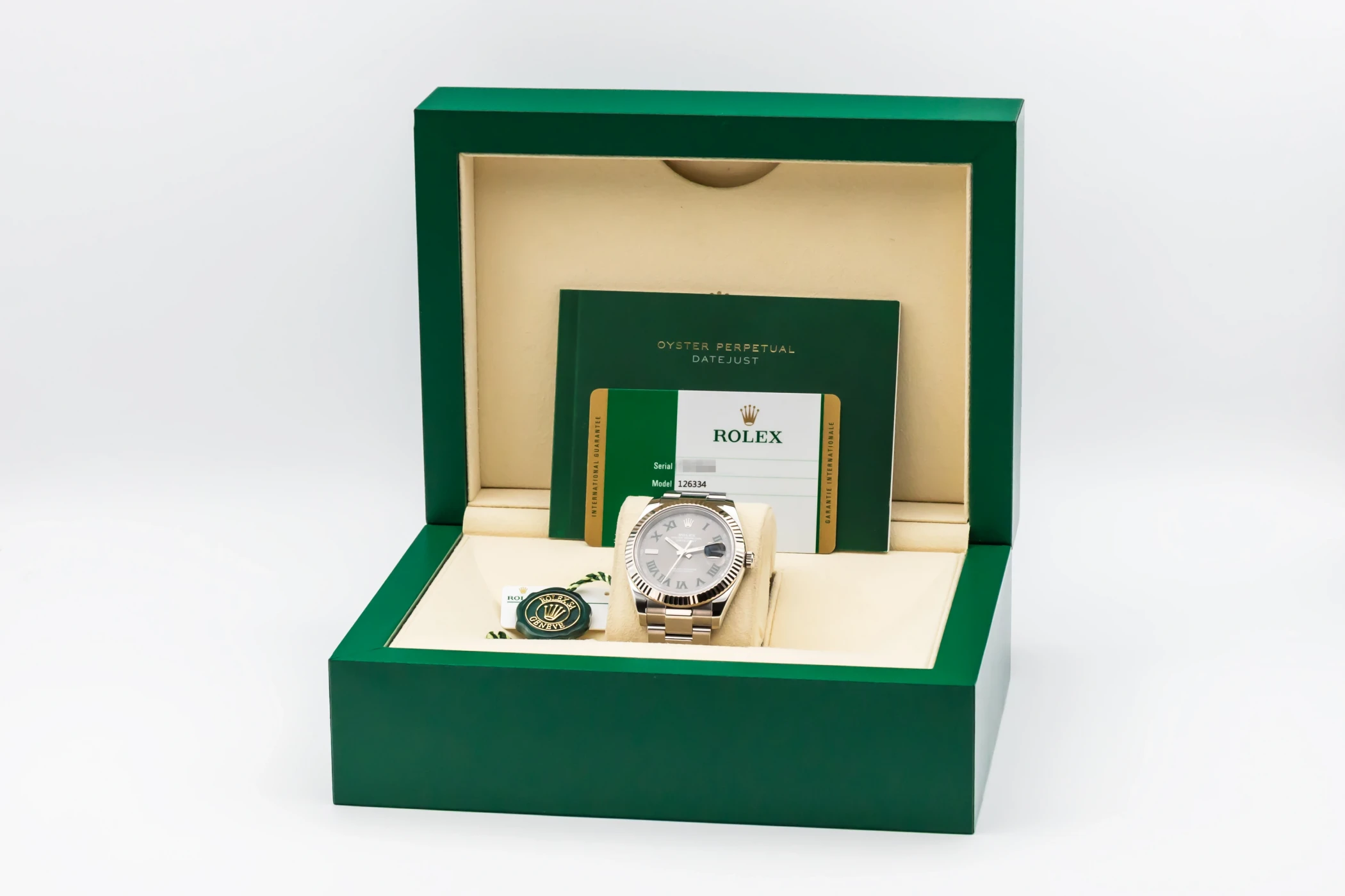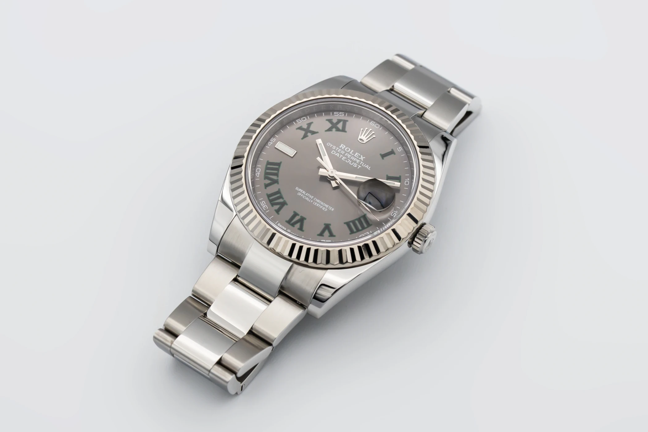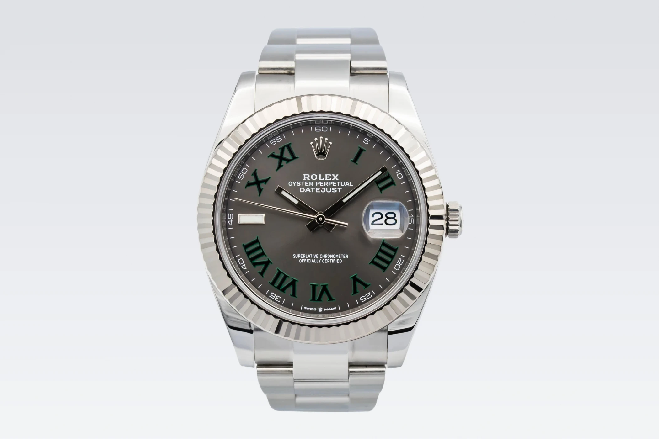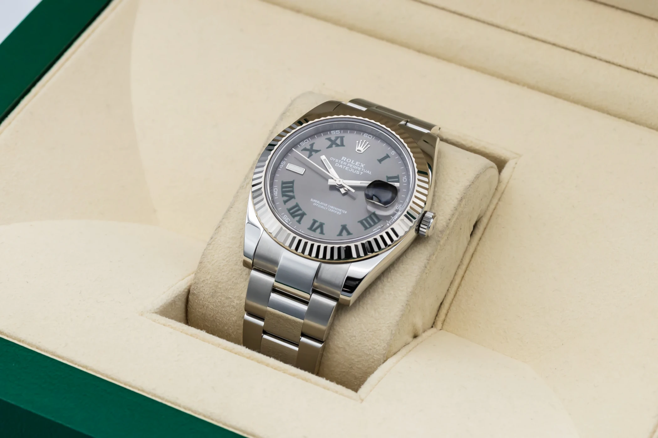This 2020 Rolex DateJust 41mm 'Wimbledon' features a slate gray dial with roman numerals and a stainless steel oyster bracelet. It is also fitted with a 18ct white gold fluted bezel.