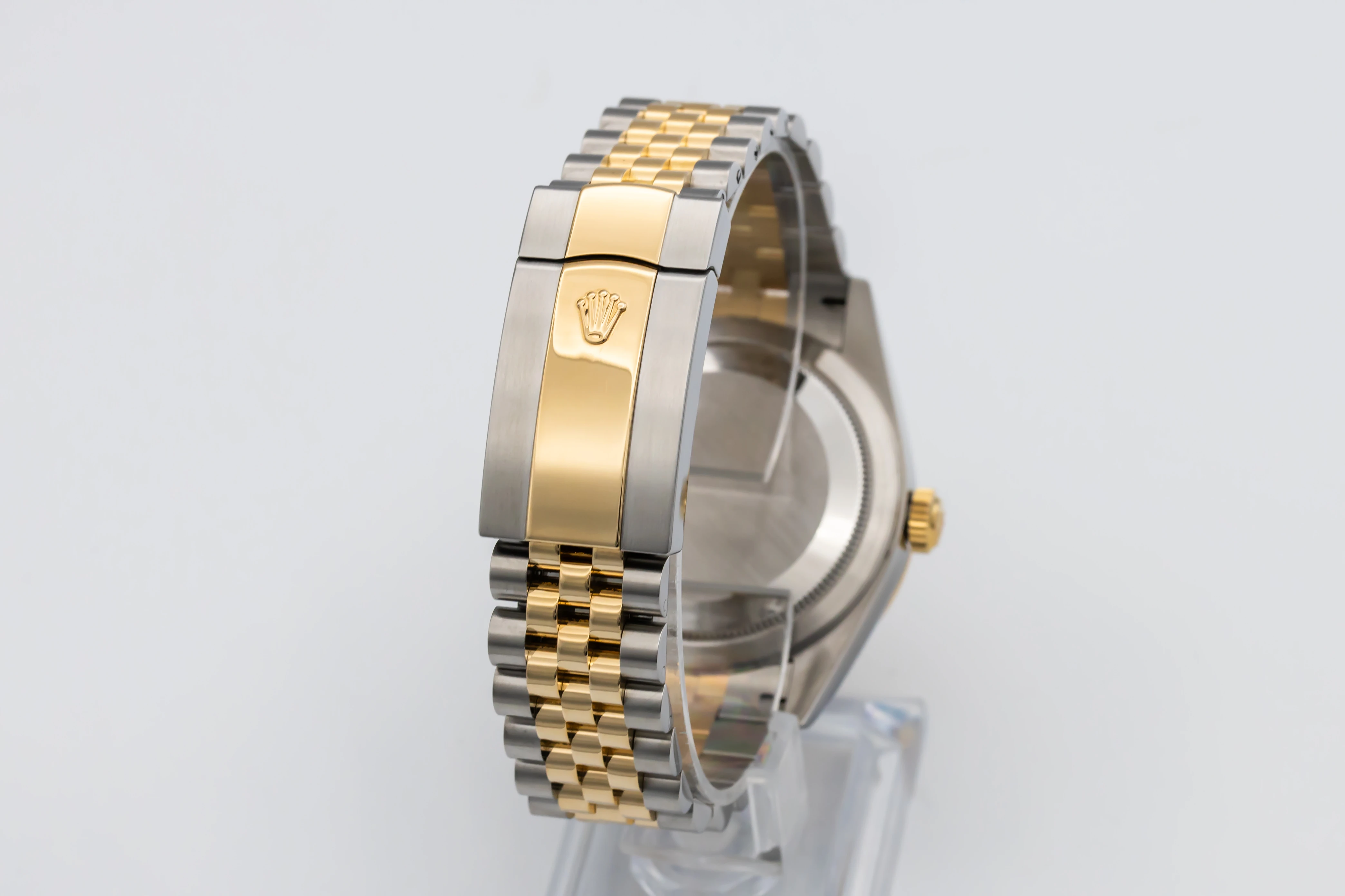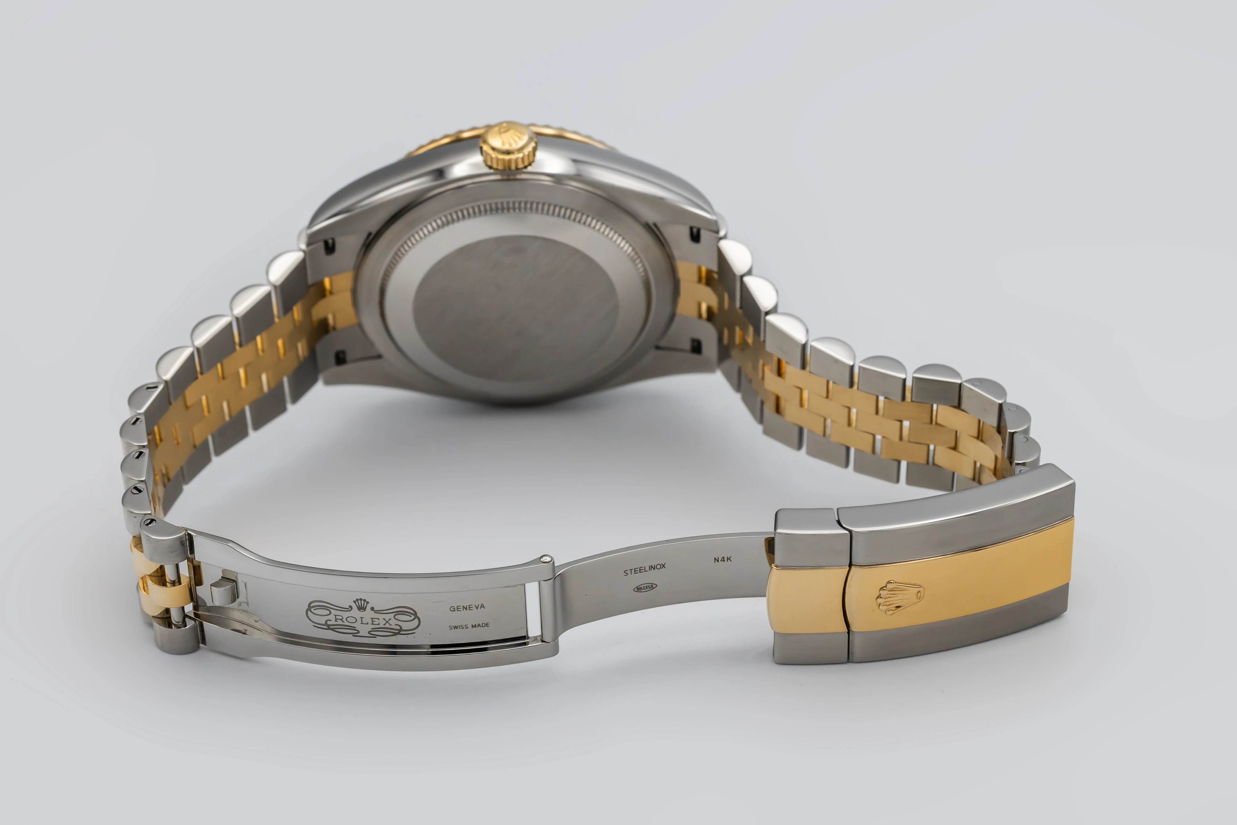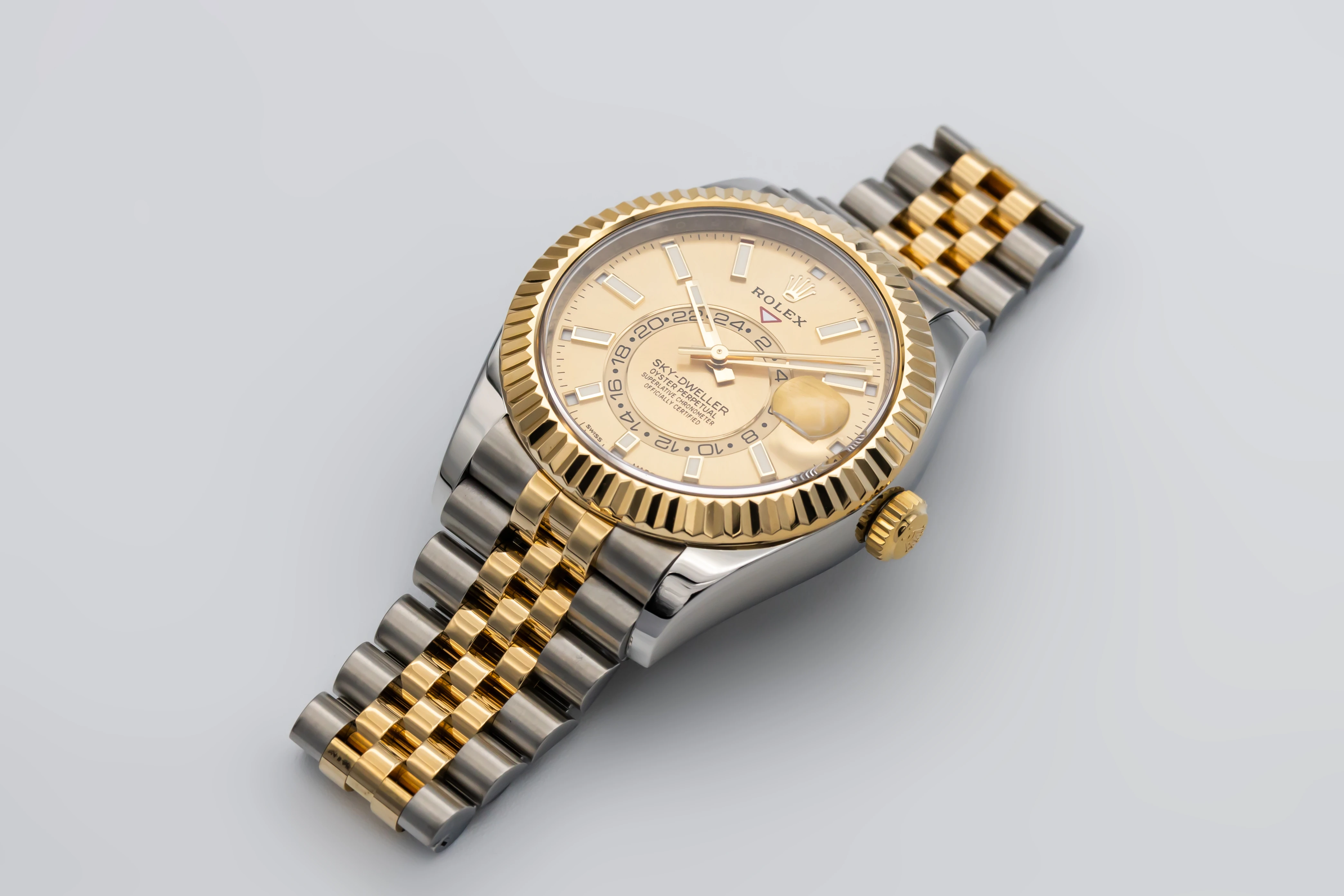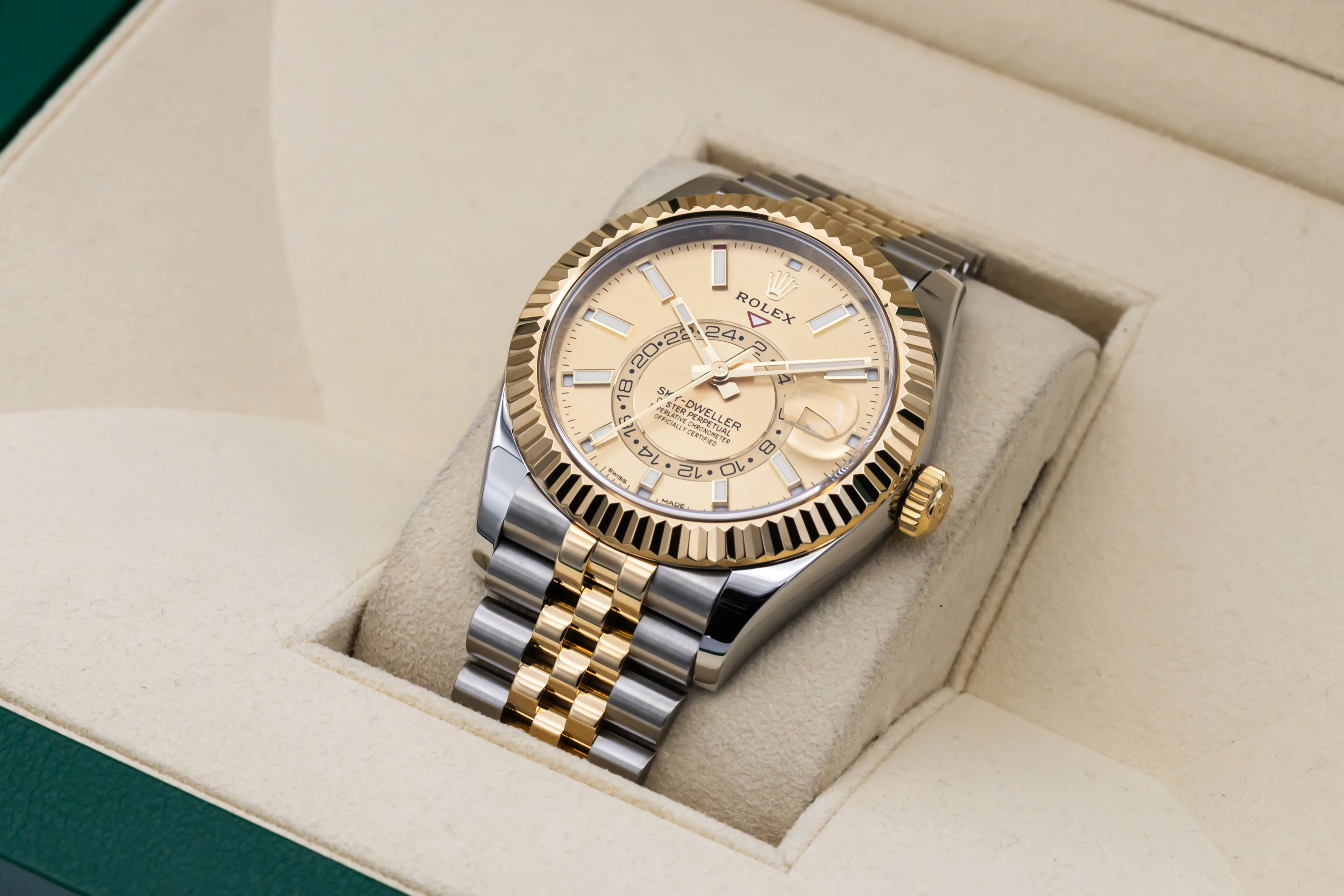 This 2021 Rolex Sky-Dweller 42mm features a champagne dial with luminous baton hour markers, an off-centre 24-hour disc for dual time zones, and an elegant framed date window beneath the iconic Cyclops lens. Paired with the distinguished Jubilee bracelet—crafted in steel and yellow gold and fitted with a concealed Crownclasp—this Sky-Dweller balances powerful presence with graceful refinement, ideal for world travellers and connoisseurs alike.