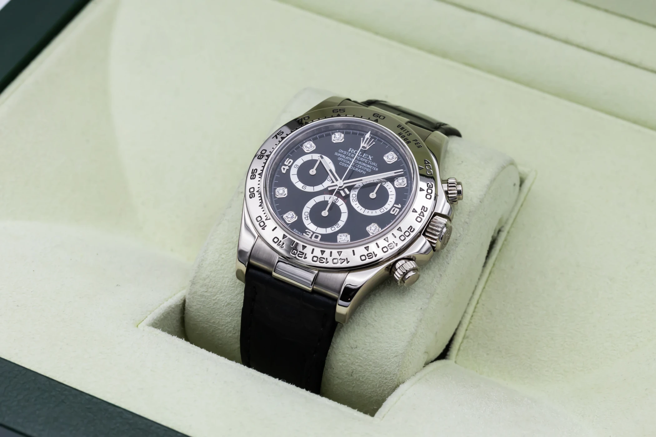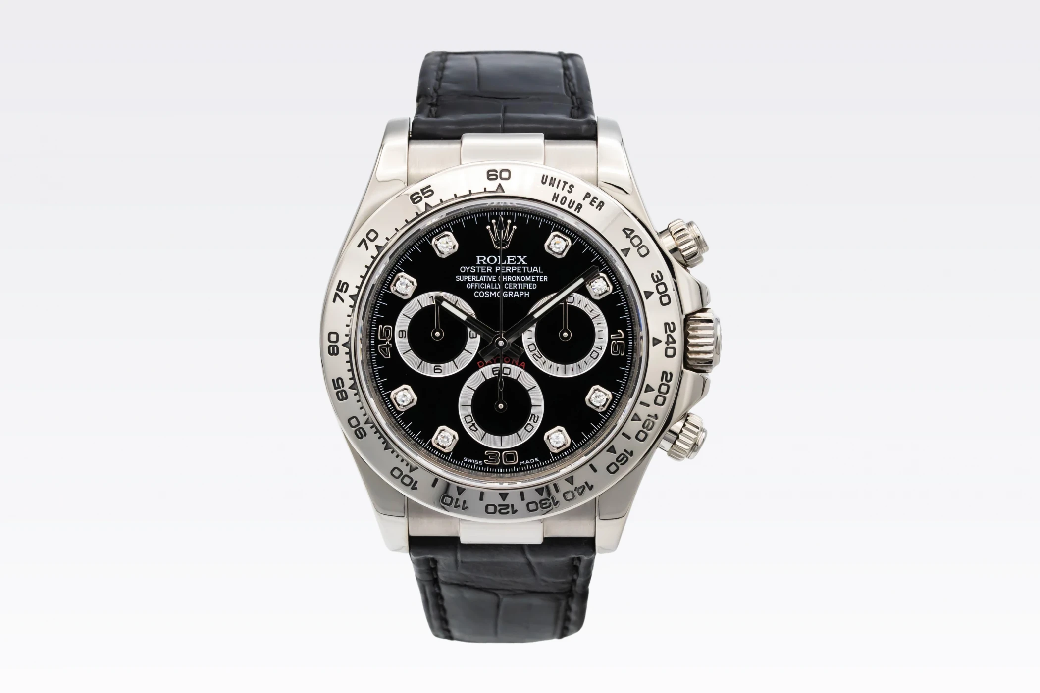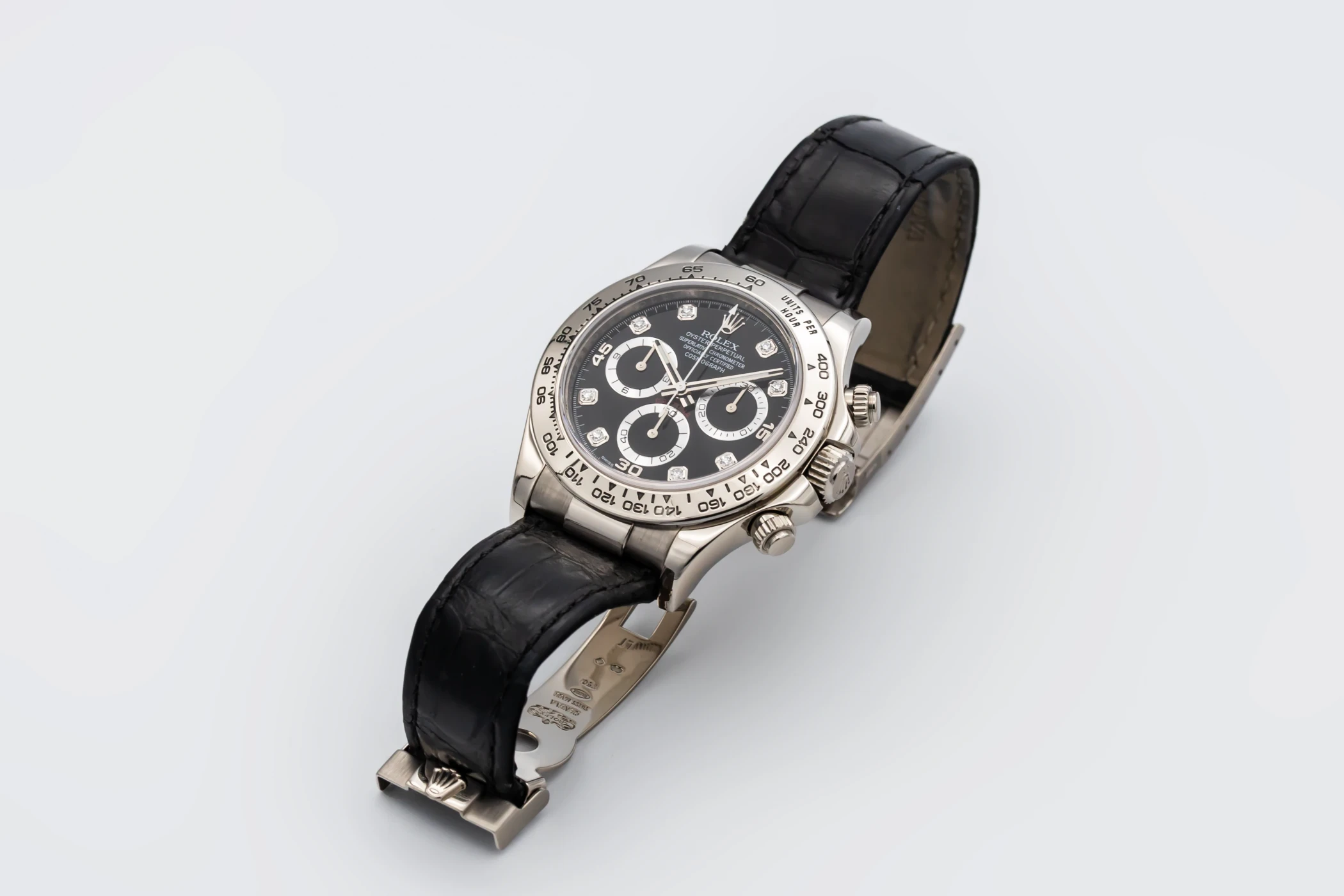 This 2013 Rolex Cosmograph Daytona 40mm is a sophisticated blend of racing heritage and luxury craftsmanship. Its striking black diamond dial is detailed with contrasting black sub-dials, luminous hour markers, and sleek hands, creating an elegant yet sporty aesthetic. The watch is paired with a premium black Rolex leather strap and matching 18ct white gold folding clasp.