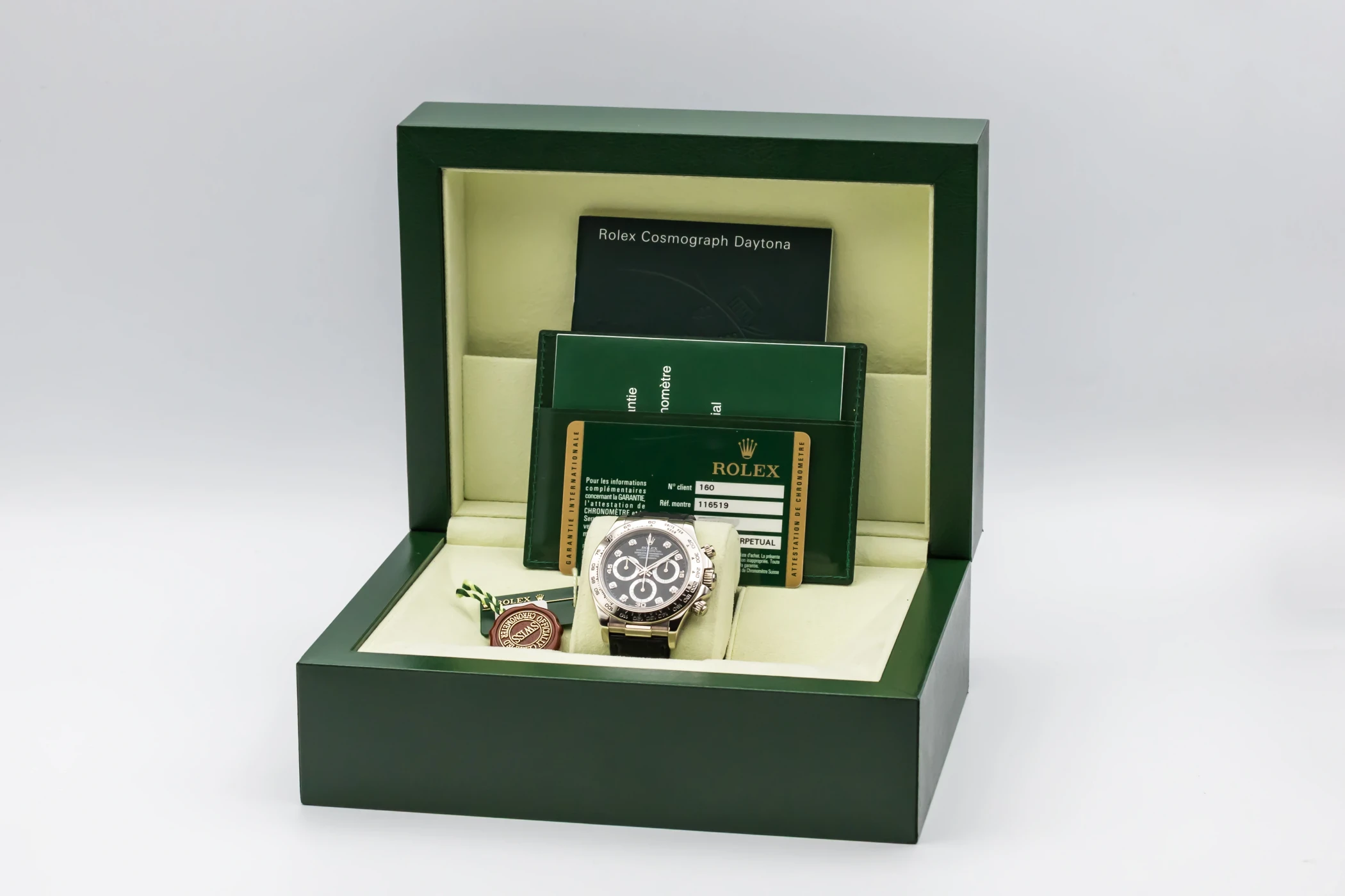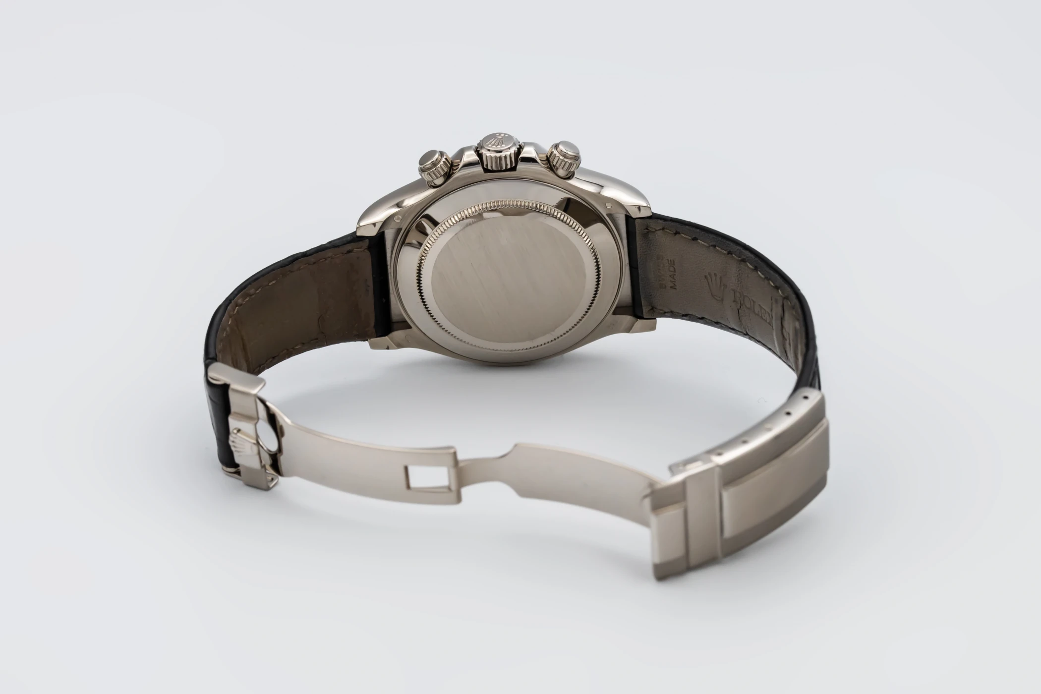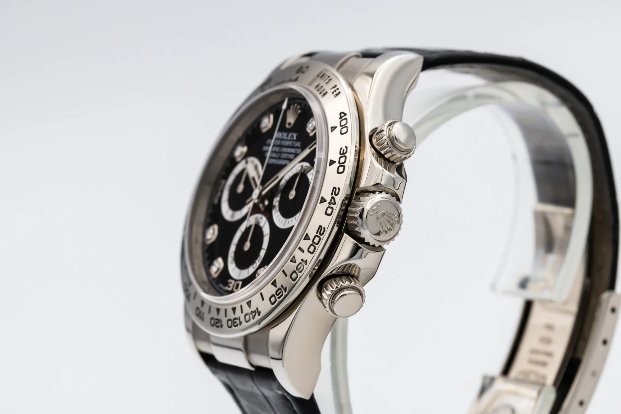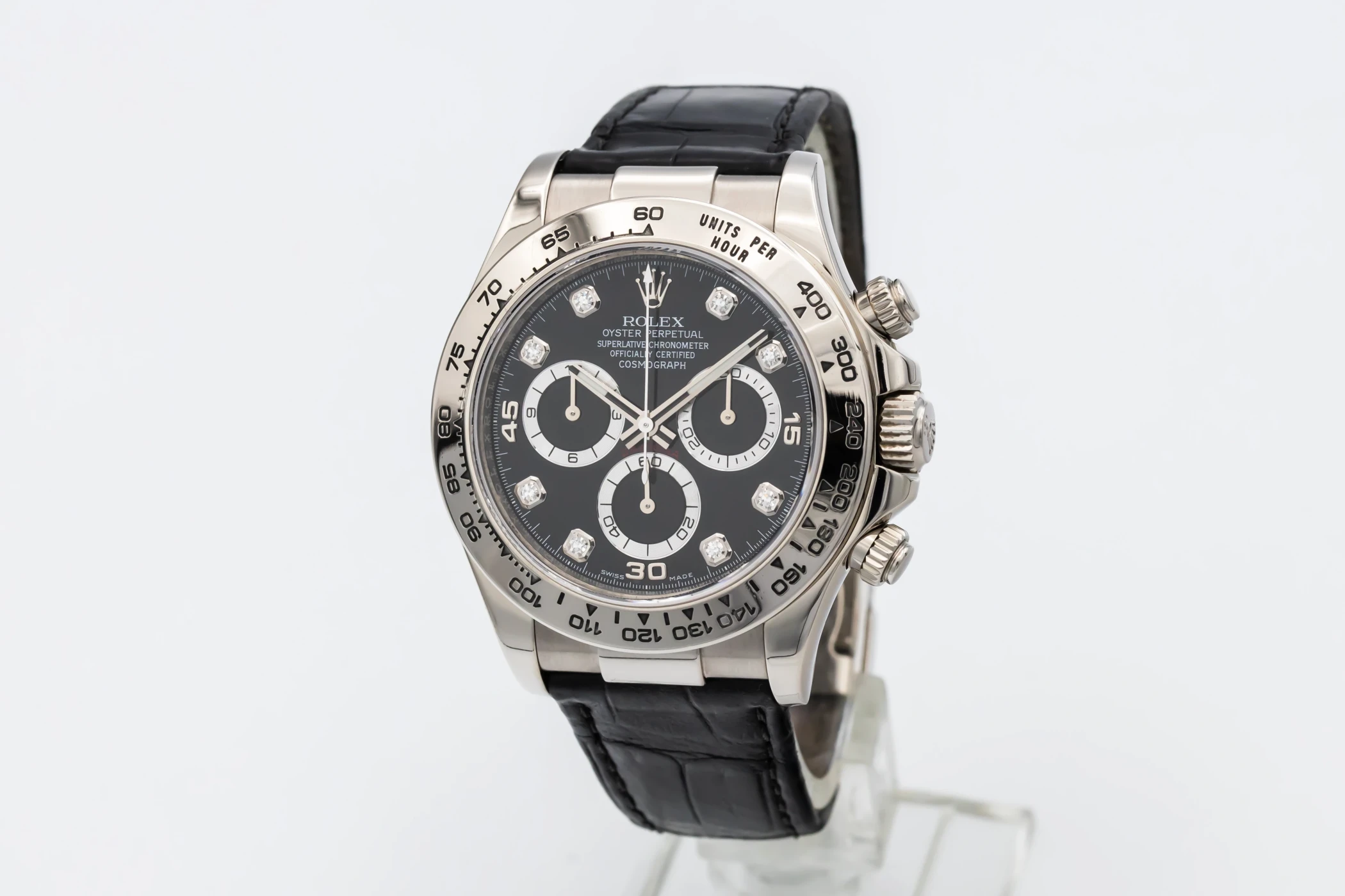 This 2013 Rolex Cosmograph Daytona 40mm is a sophisticated blend of racing heritage and luxury craftsmanship. Its striking black diamond dial is detailed with contrasting black sub-dials, luminous hour markers, and sleek hands, creating an elegant yet sporty aesthetic. The watch is paired with a premium black Rolex leather strap and matching 18ct white gold folding clasp.