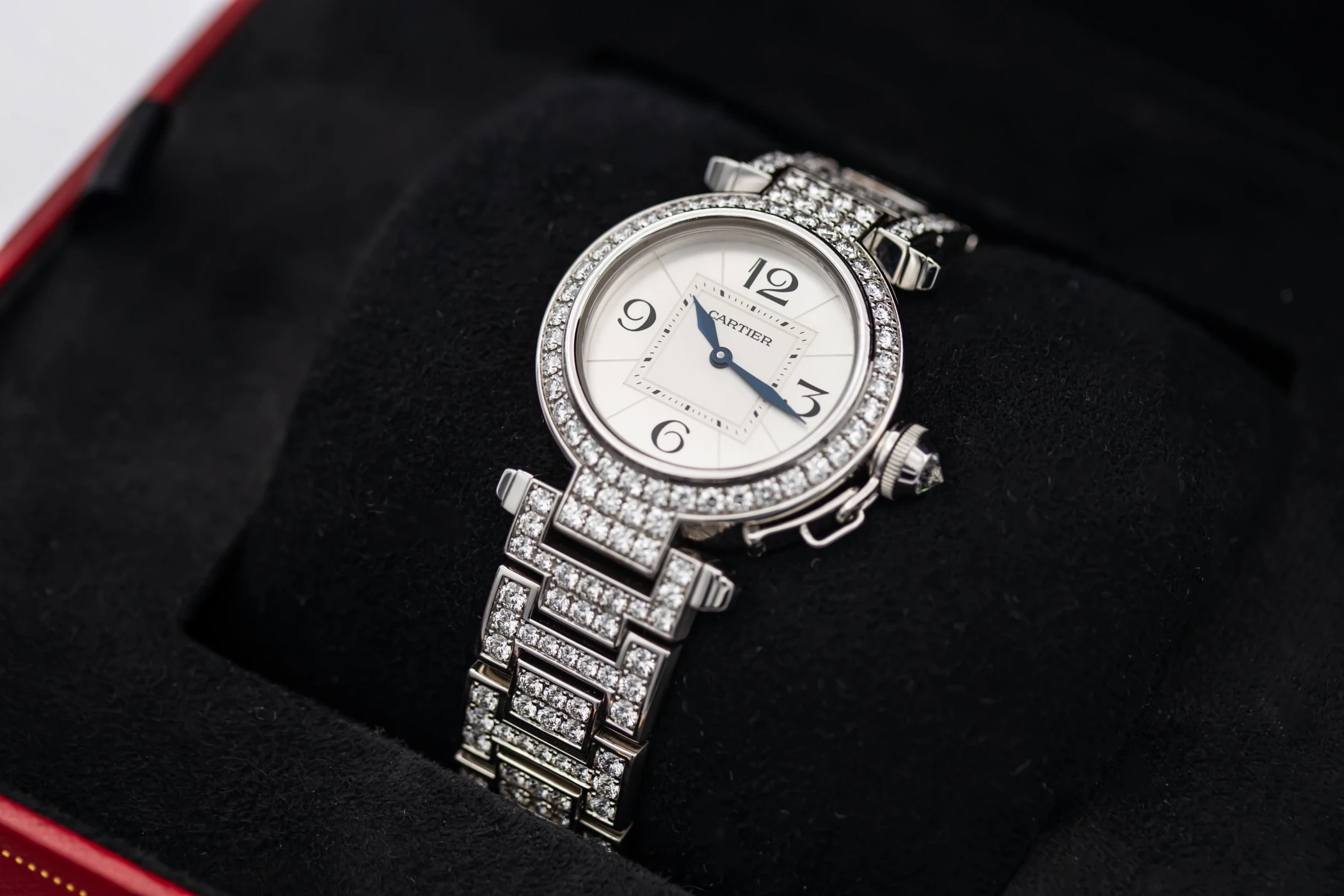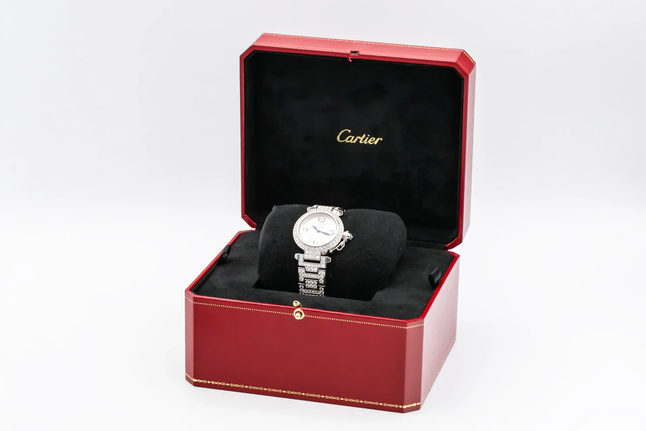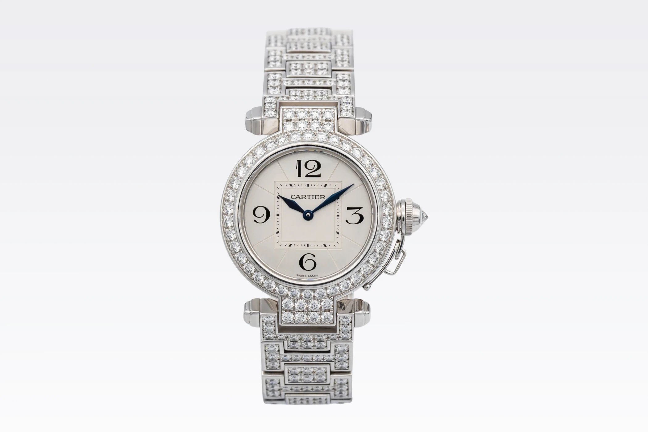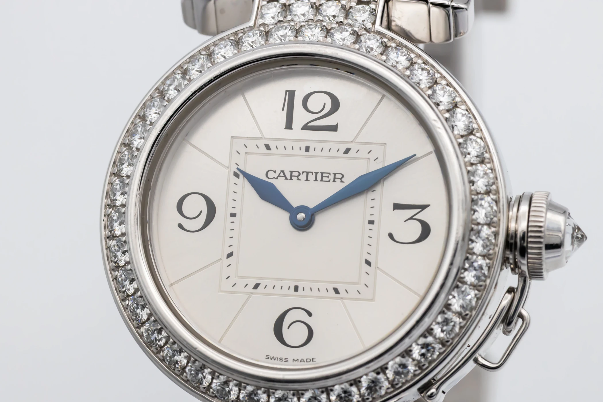 This circa 2000s Cartier Pasha 32mm features a silver opaline dial with bold black Arabic numerals at the cardinal points, elegant sword-shaped blued-steel hands, and a refined minute track along the perimeter. Complemented by a luxurious white gold bracelet and diamond encrusted bezel, This Pasha radiates sophistication and femininity, balancing a bold architectural design with delicate Parisian charm.