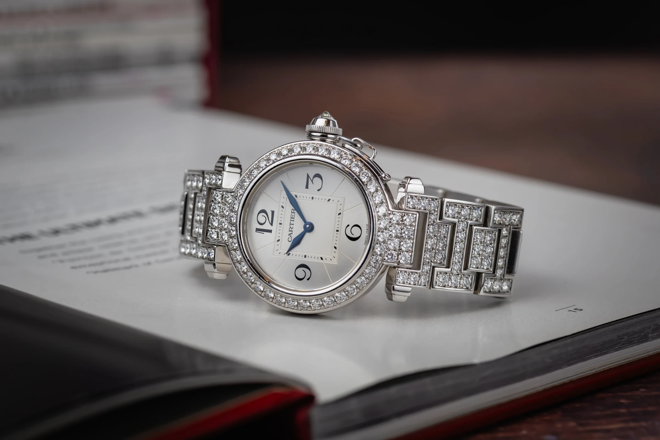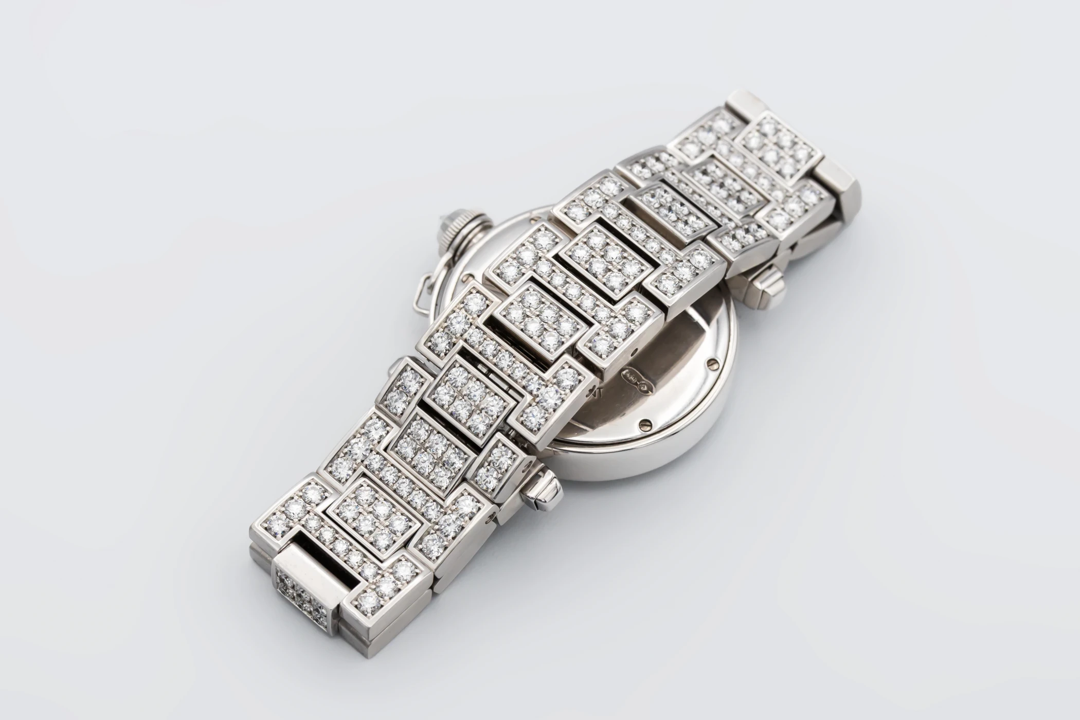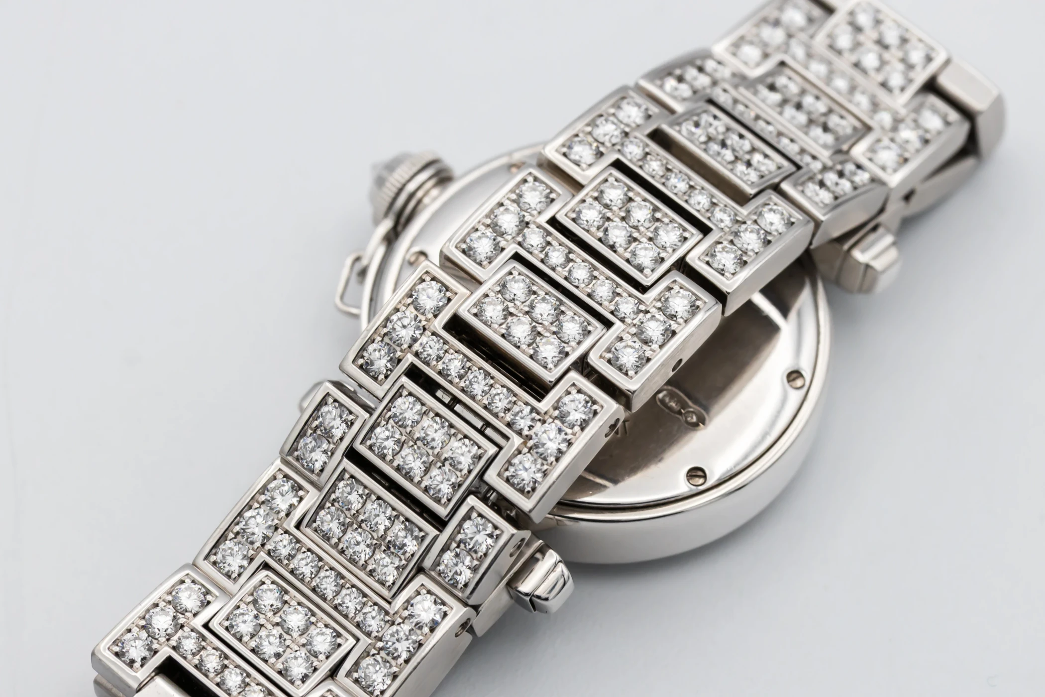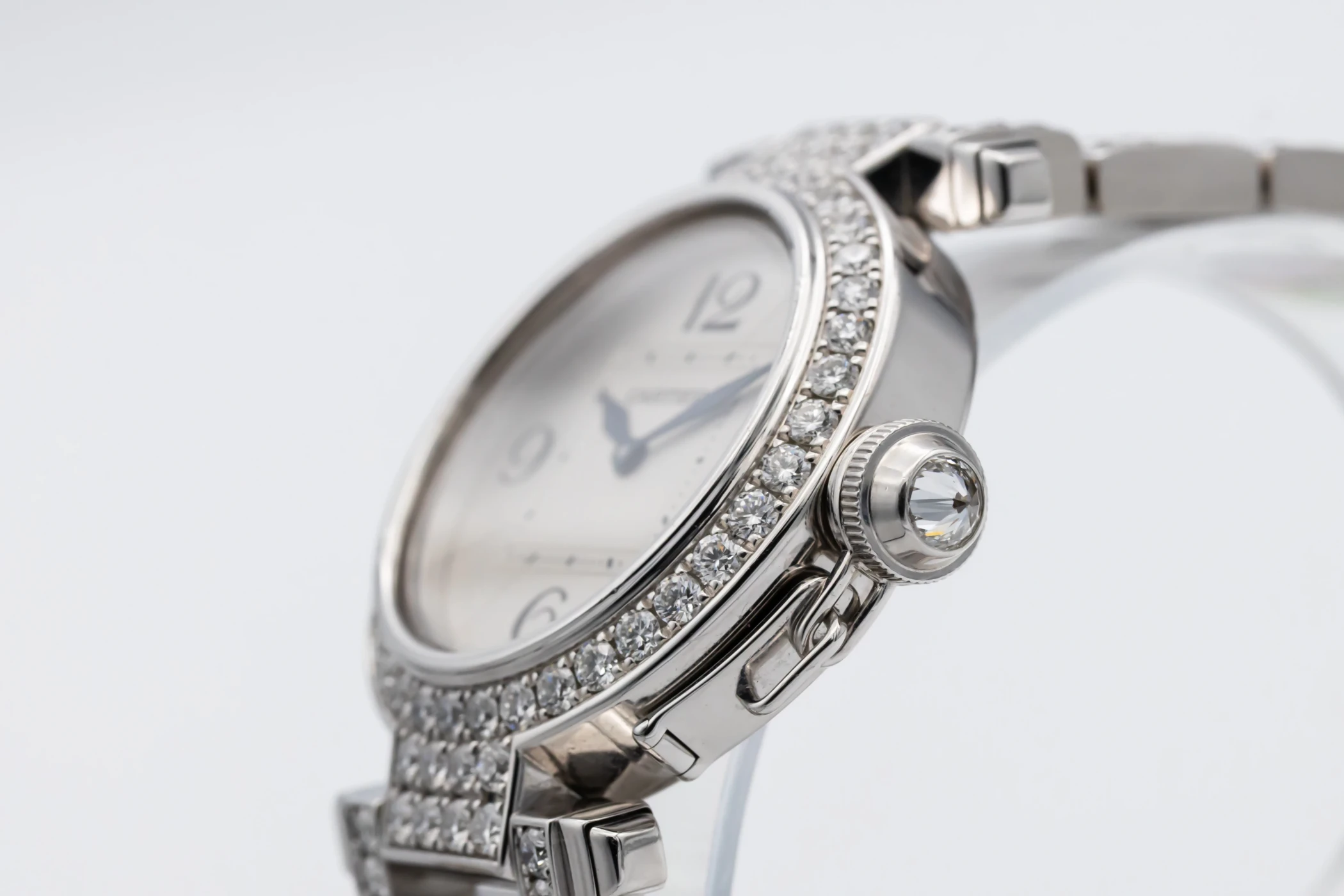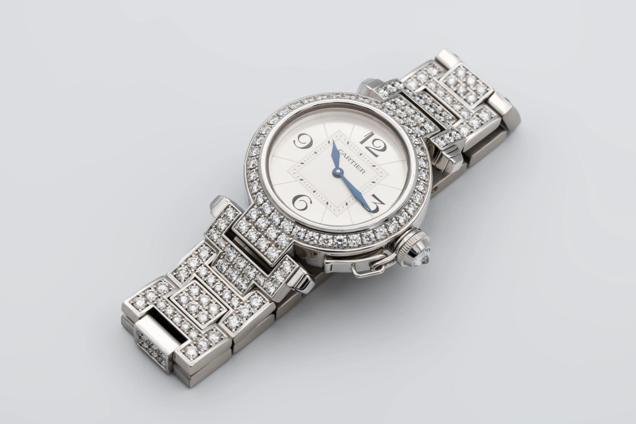 This circa 2000s Cartier Pasha 32mm features a silver opaline dial with bold black Arabic numerals at the cardinal points, elegant sword-shaped blued-steel hands, and a refined minute track along the perimeter. Complemented by a luxurious white gold bracelet and diamond encrusted bezel, This Pasha radiates sophistication and femininity, balancing a bold architectural design with delicate Parisian charm.