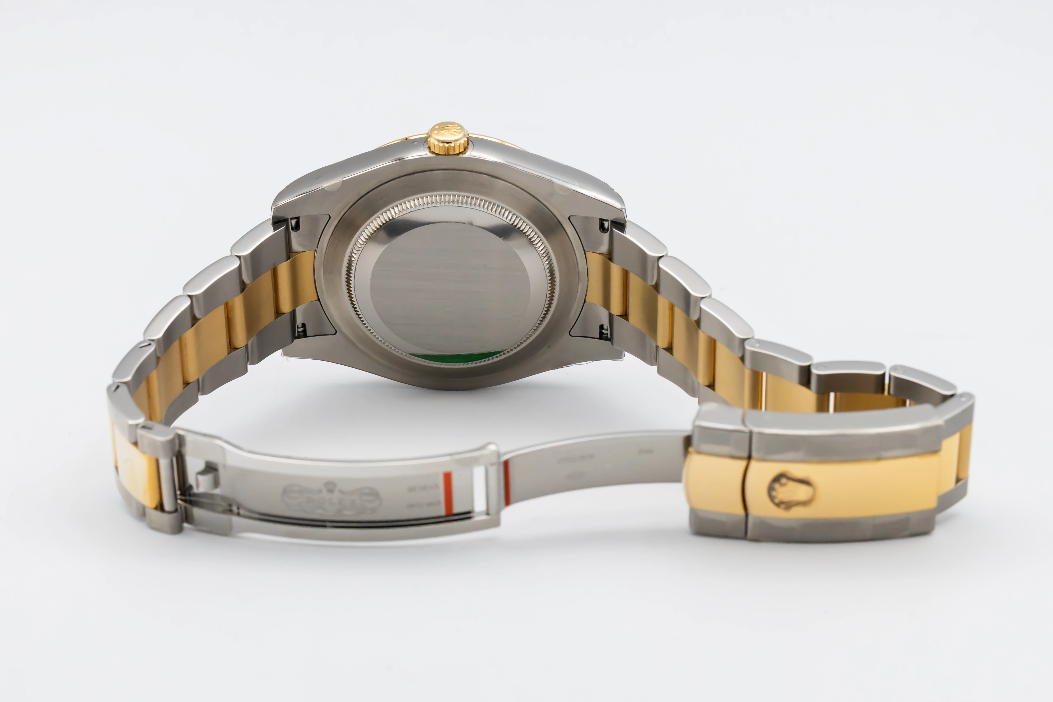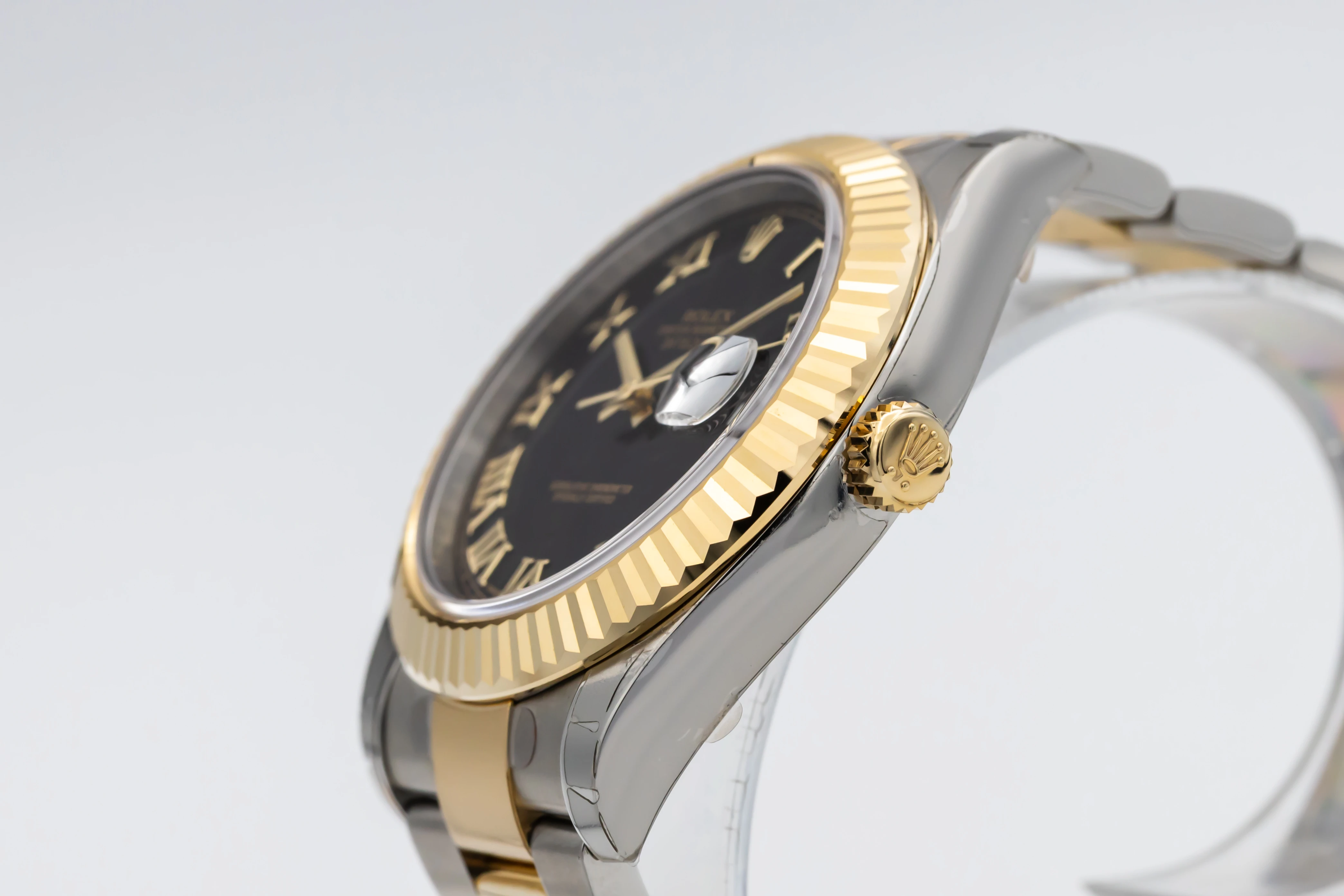 This unworn Rolex DateJust II 41mm features a black dial with baton numeral markers and matching gold hands, offering exceptional legibility and a warm, luxurious contrast. Fitted with the solid-link Oyster bracelet in steel and yellow gold, secured by an Oysterclasp with Easylink extension, this model blends sporty refinement with an unmistakable sense of prestige.