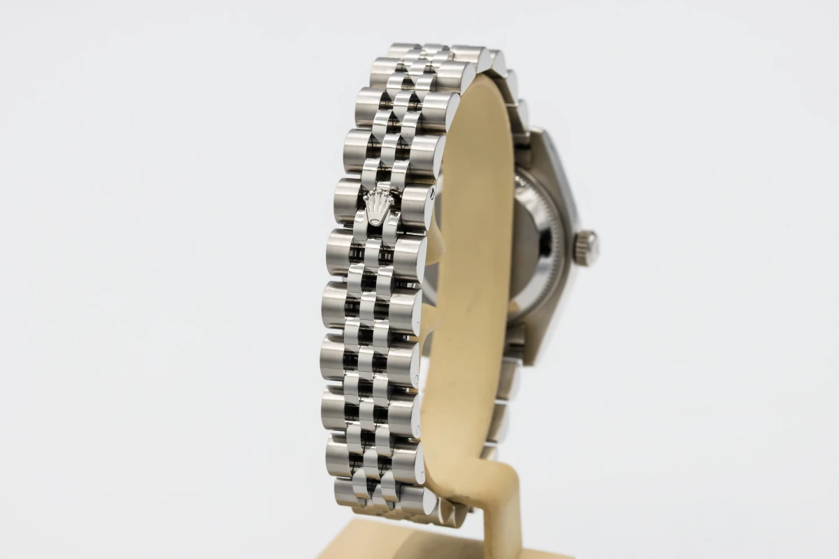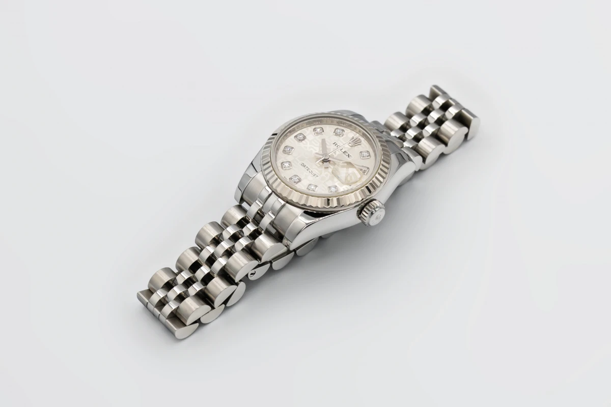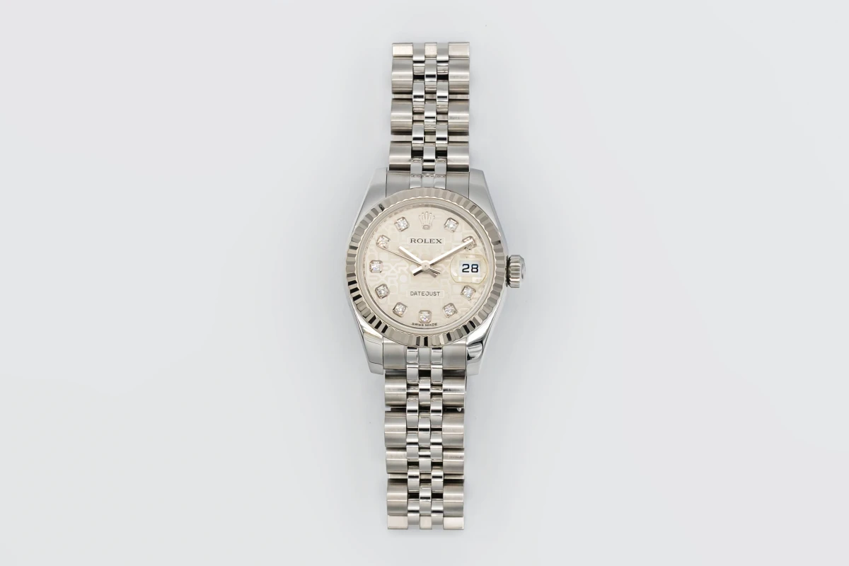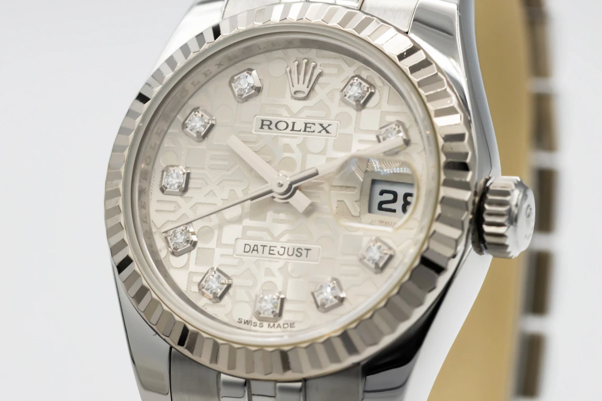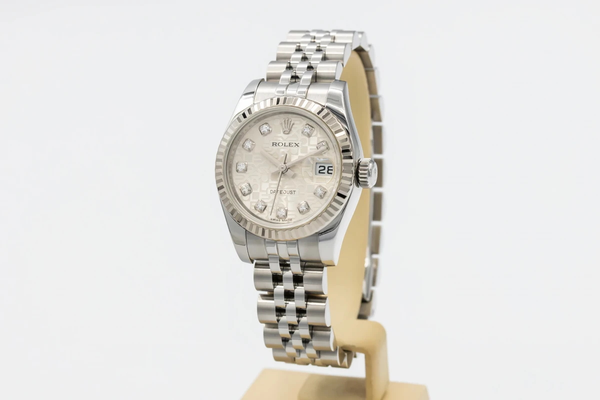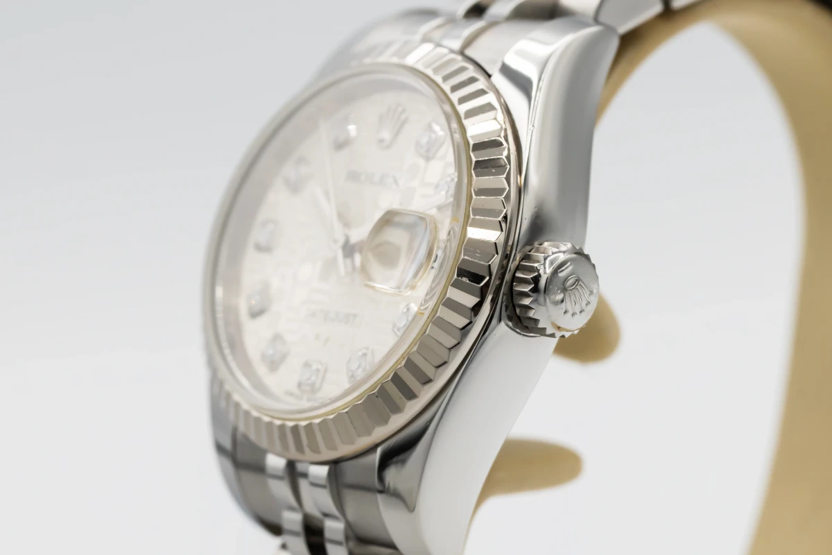 This 2012 Rolex Lady DateJust 26mm features a silver dial with factory diamond markers and a stainless steel jubilee bracelet. It is fitted with an 18ct white gold fluted bezel.
