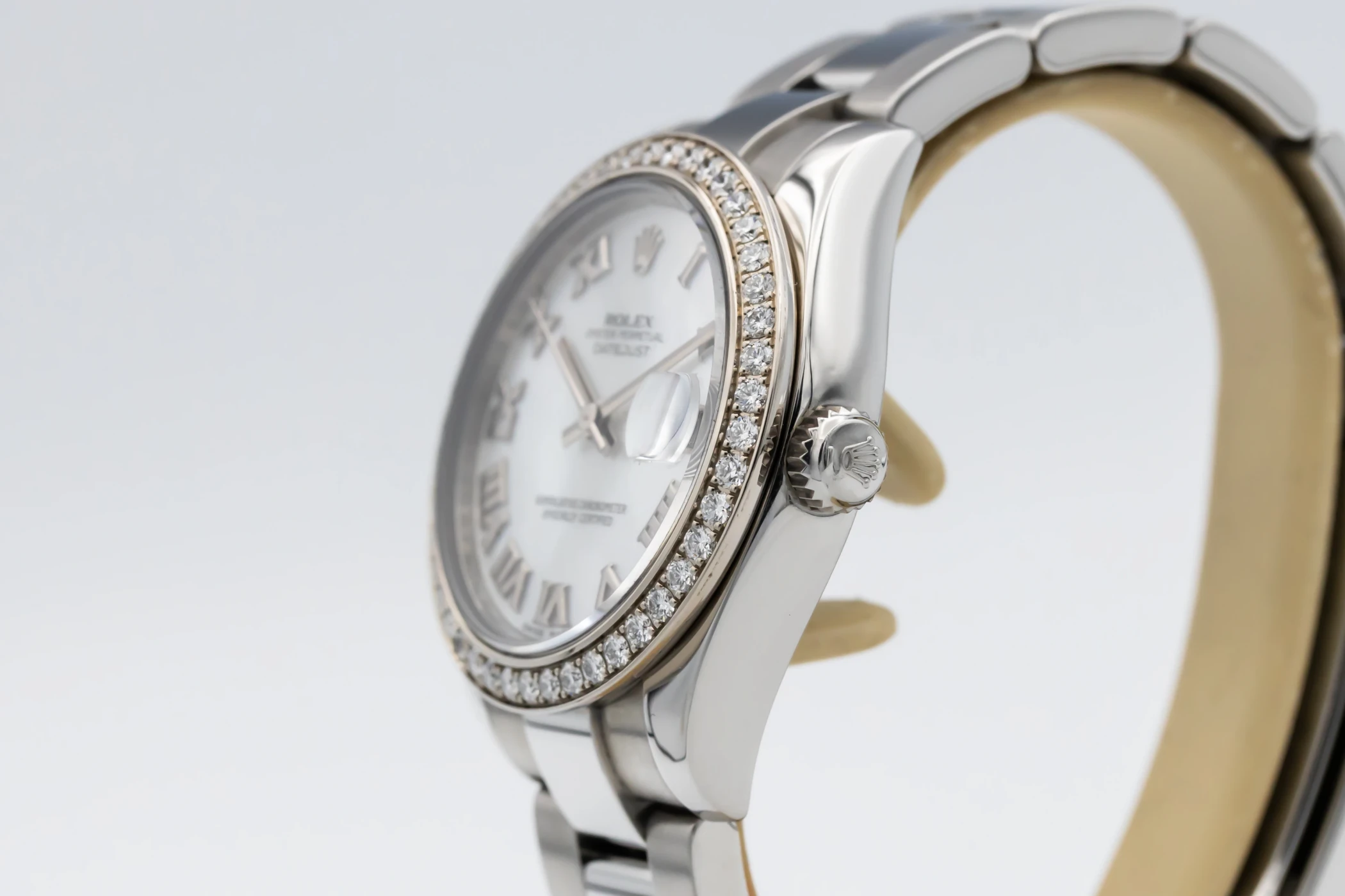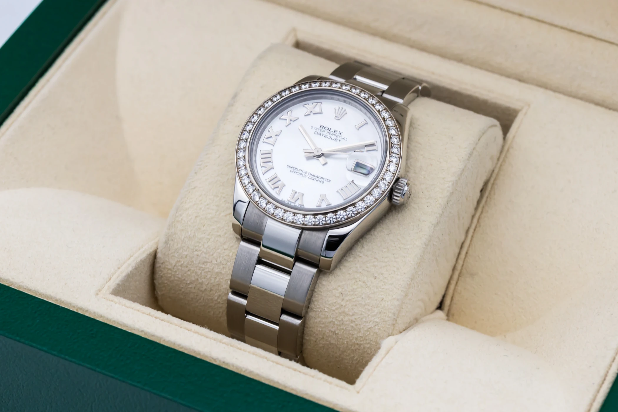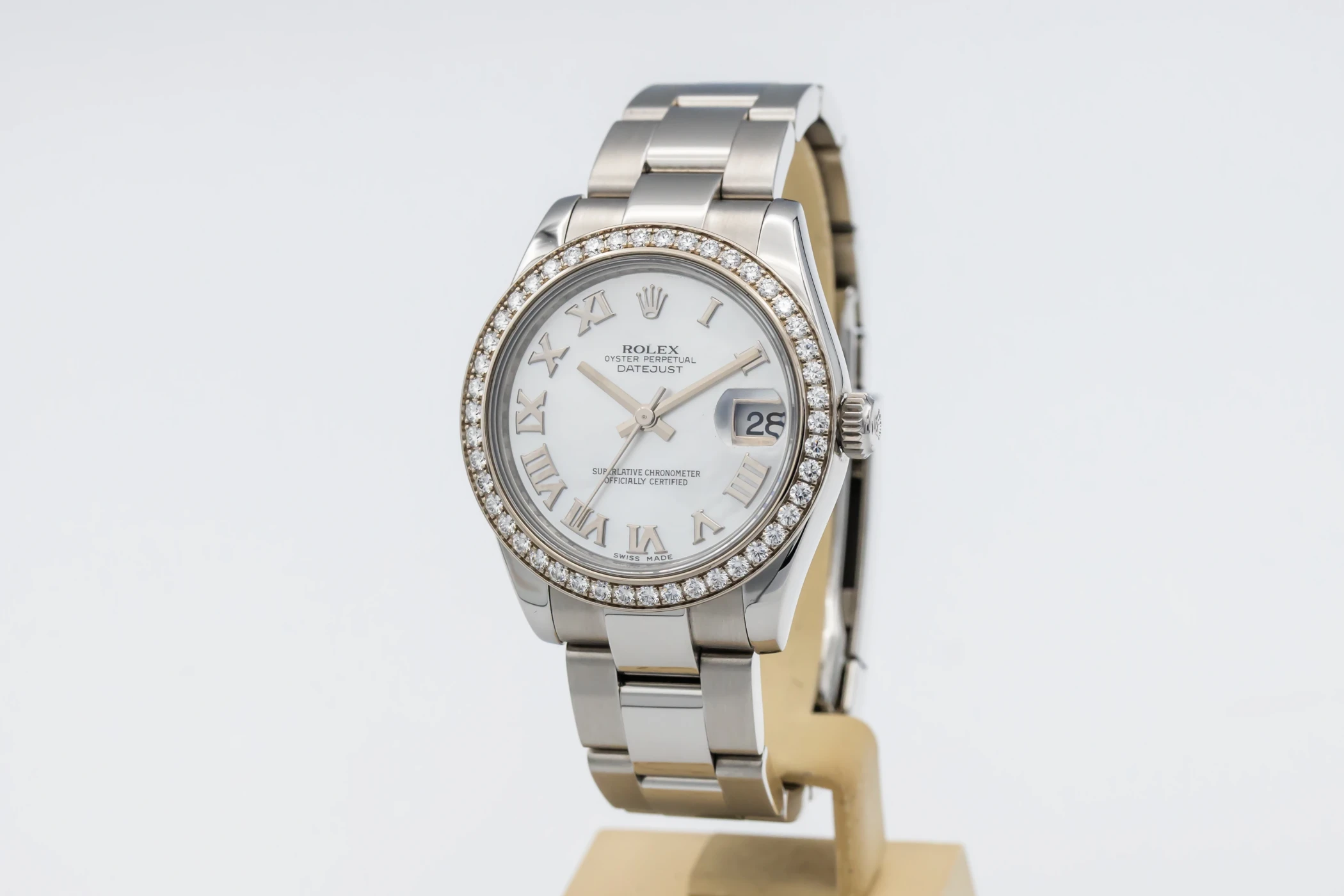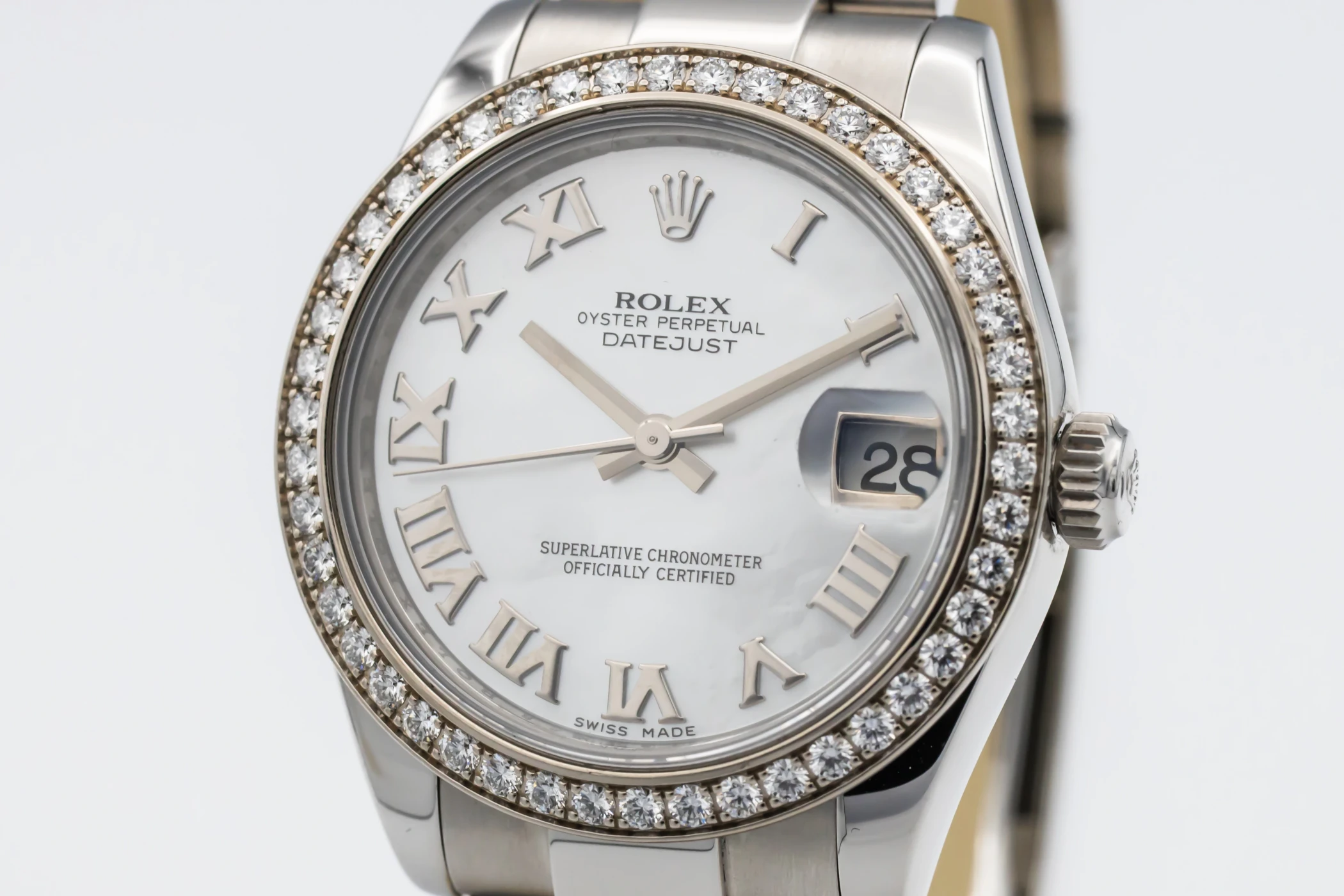 This 2017 Rolex DateJust 31mm combines robustness and refined style in the 31 mm Oyster case crafted from Oystersteel with an 18ct white gold diamond encrusted bezel. The dial is available in mother-of-pearl with factory diamond hour-markers.