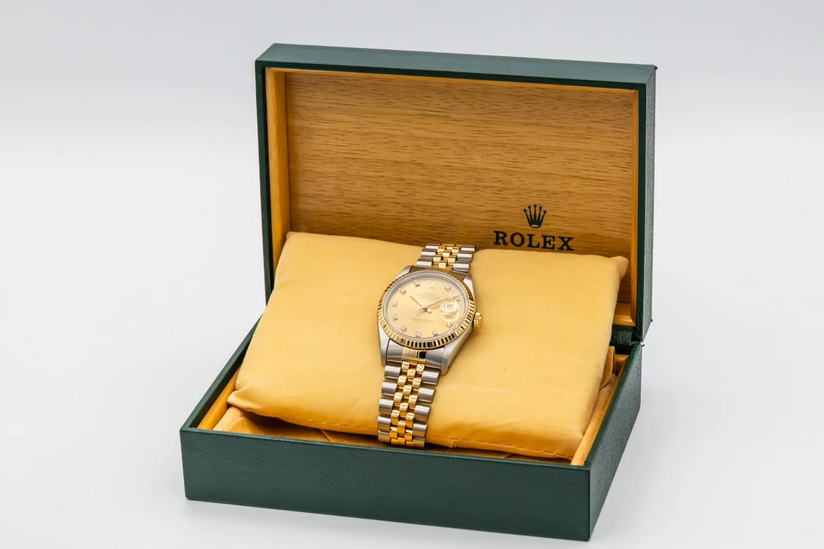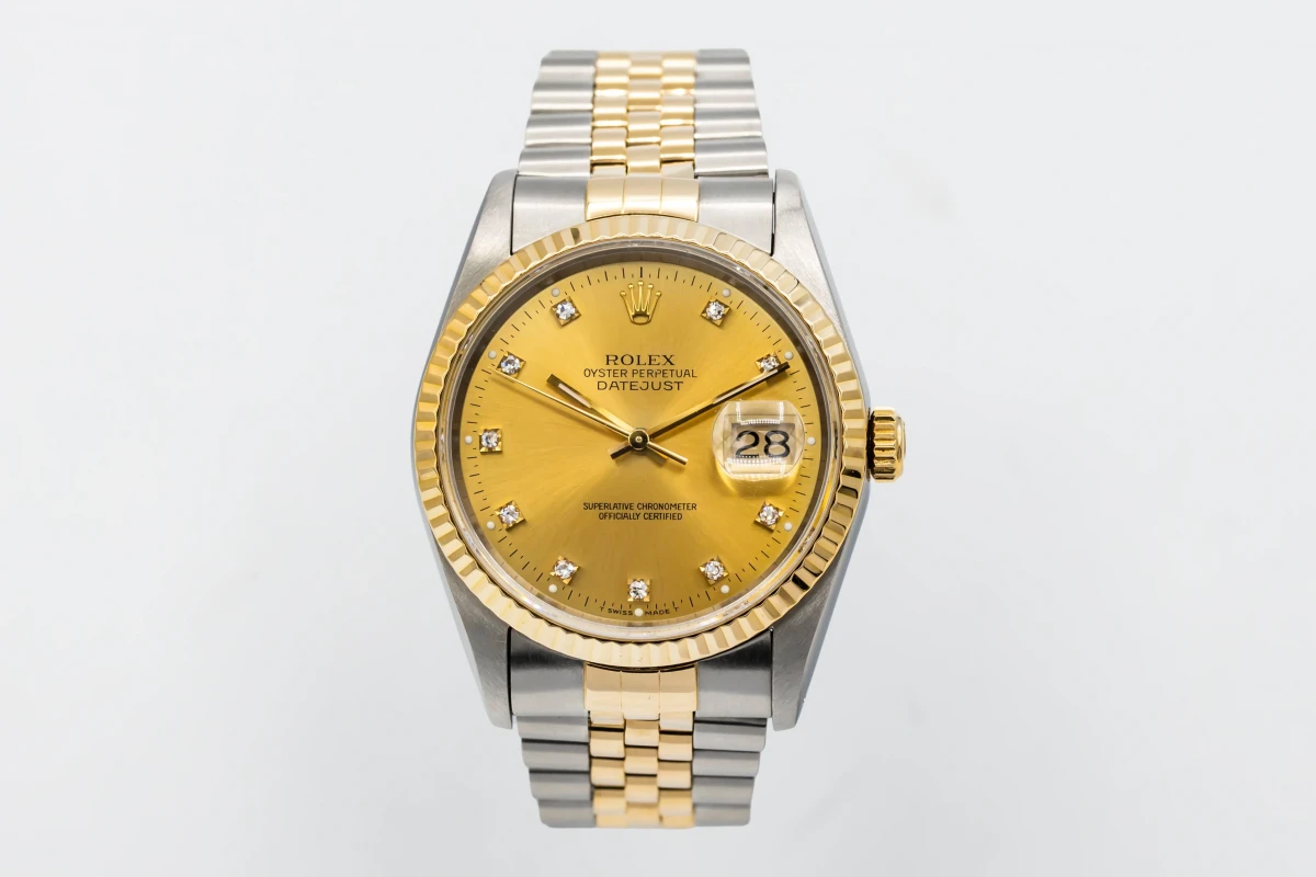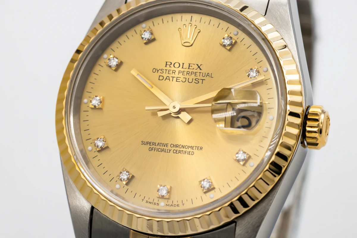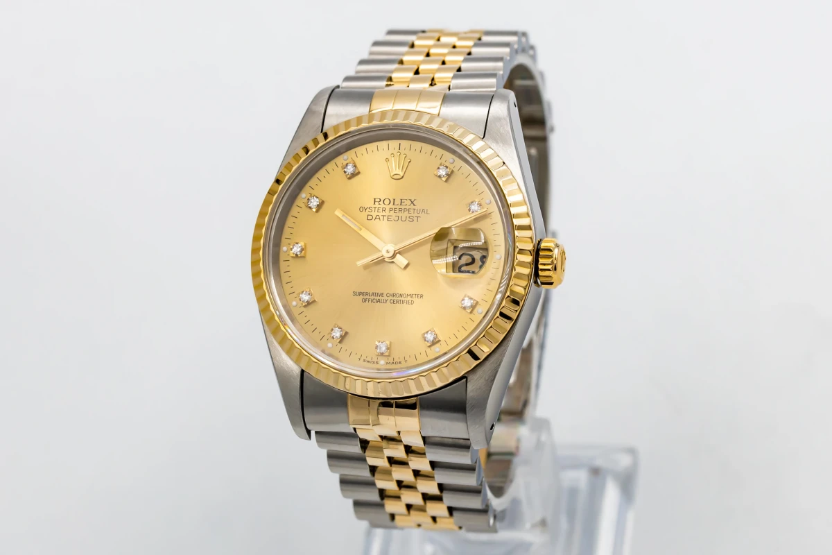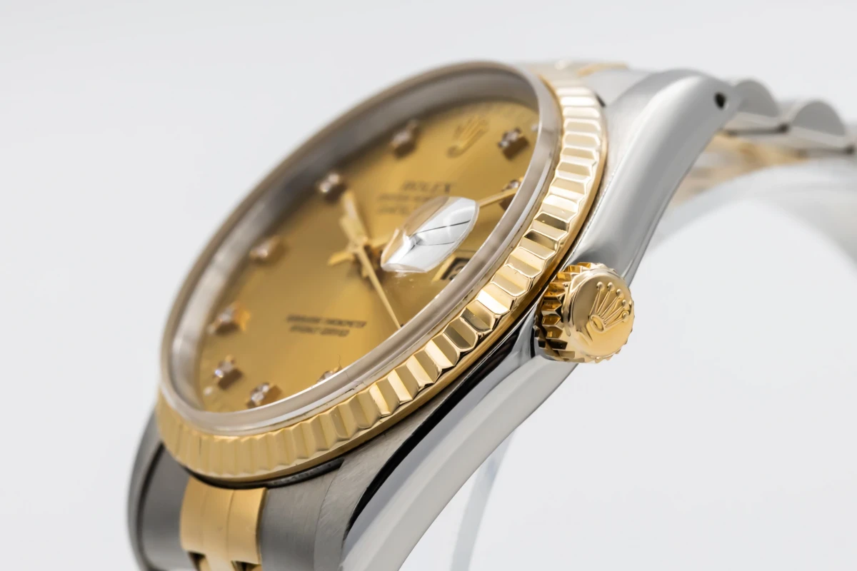 This 1993 Rolex DateJust 36mm features a champage dial with factory diamond markers and a stainless steel and 18ct yellow gold jubilee bracelet. It also features a 18ct yellow gold fluted bezel.