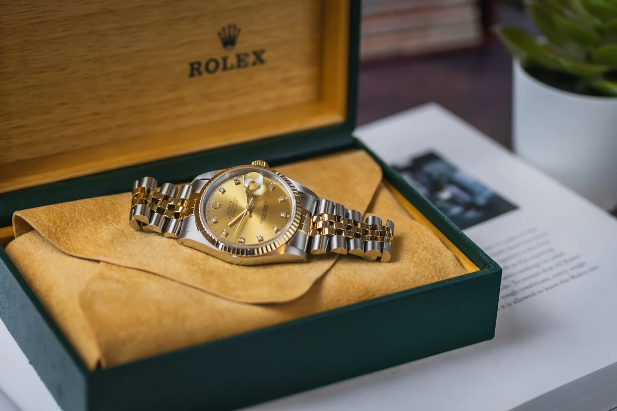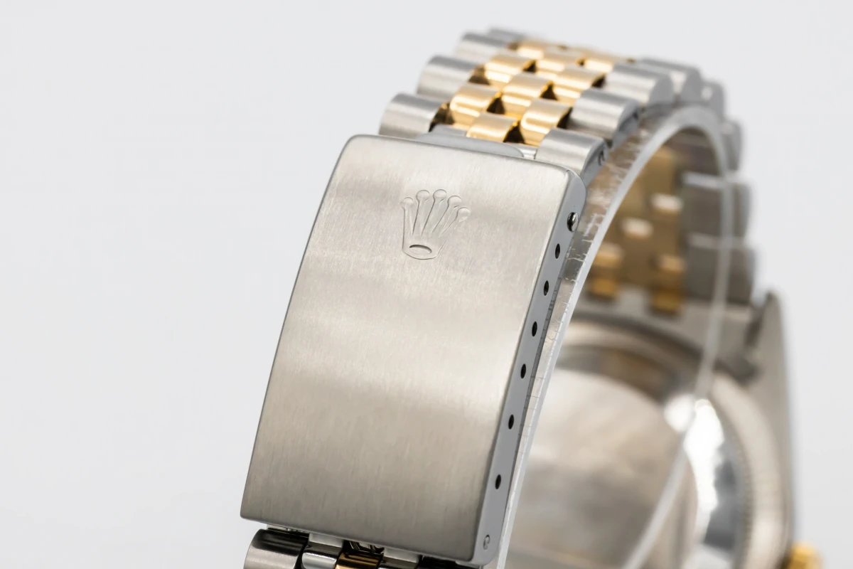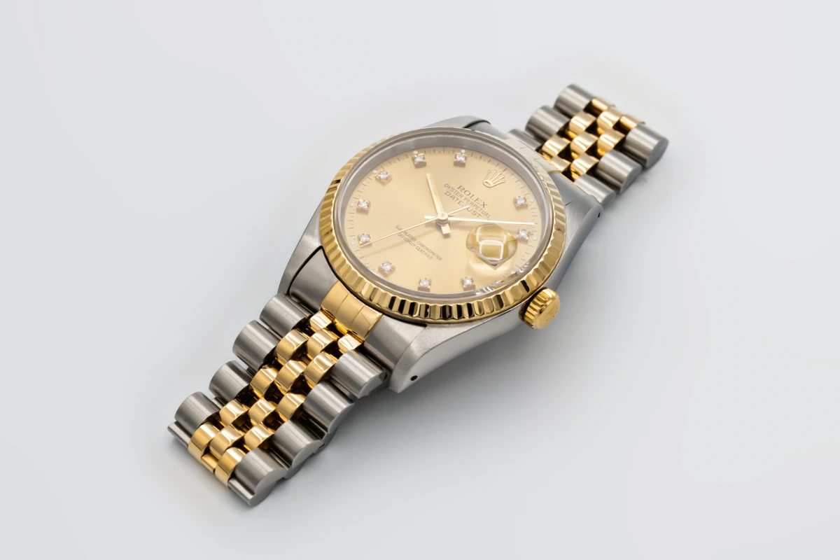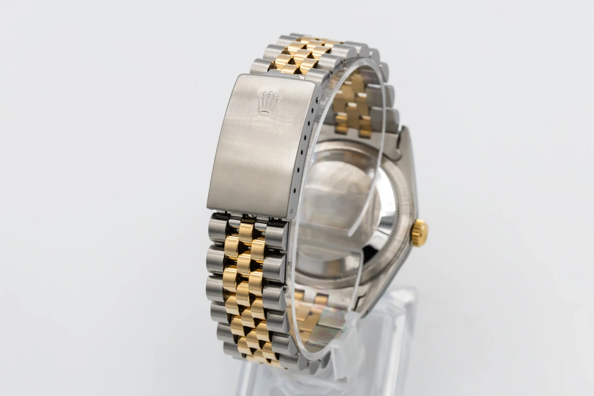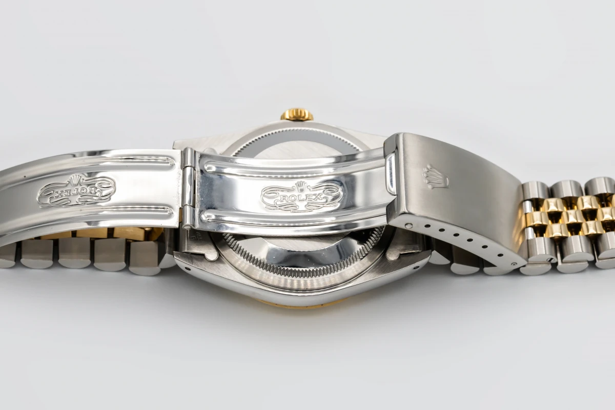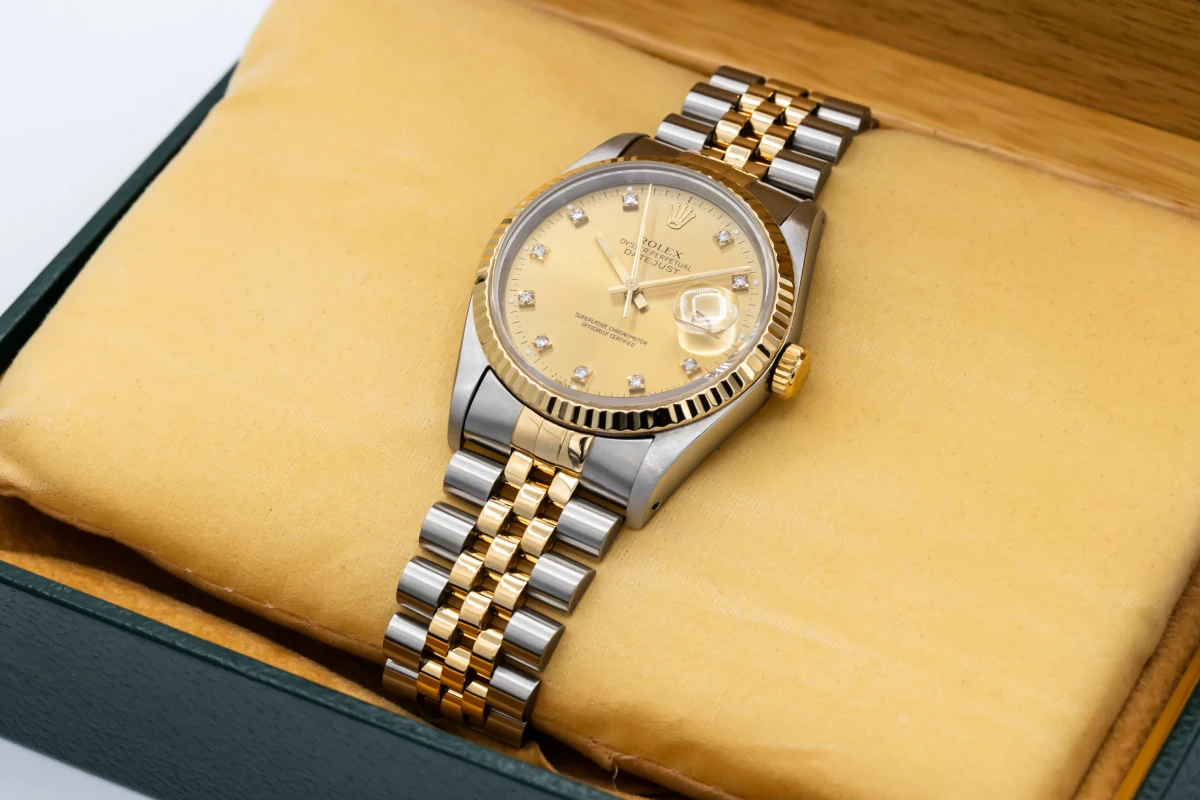 This 1993 Rolex DateJust 36mm features a champage dial with factory diamond markers and a stainless steel and 18ct yellow gold jubilee bracelet. It also features a 18ct yellow gold fluted bezel.