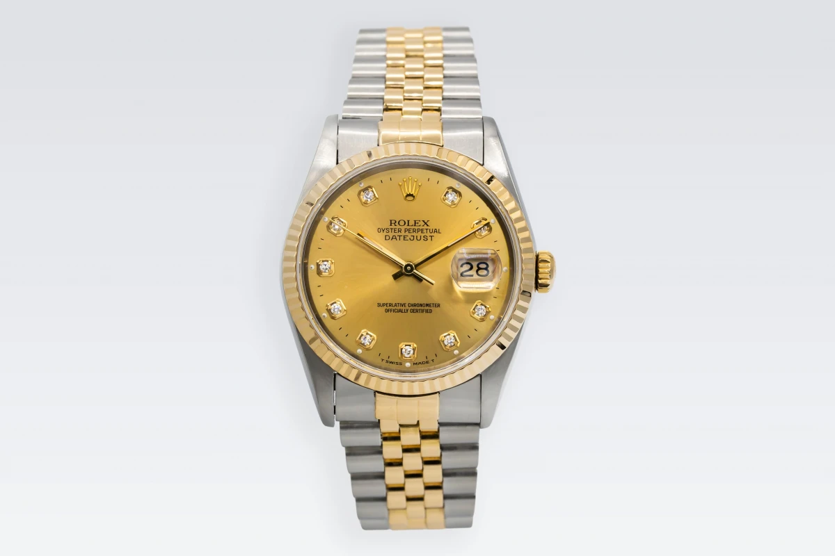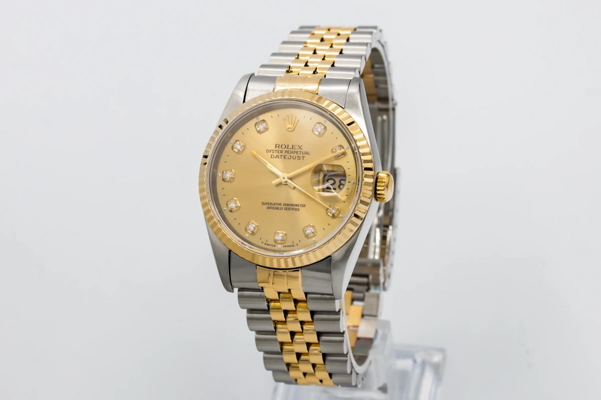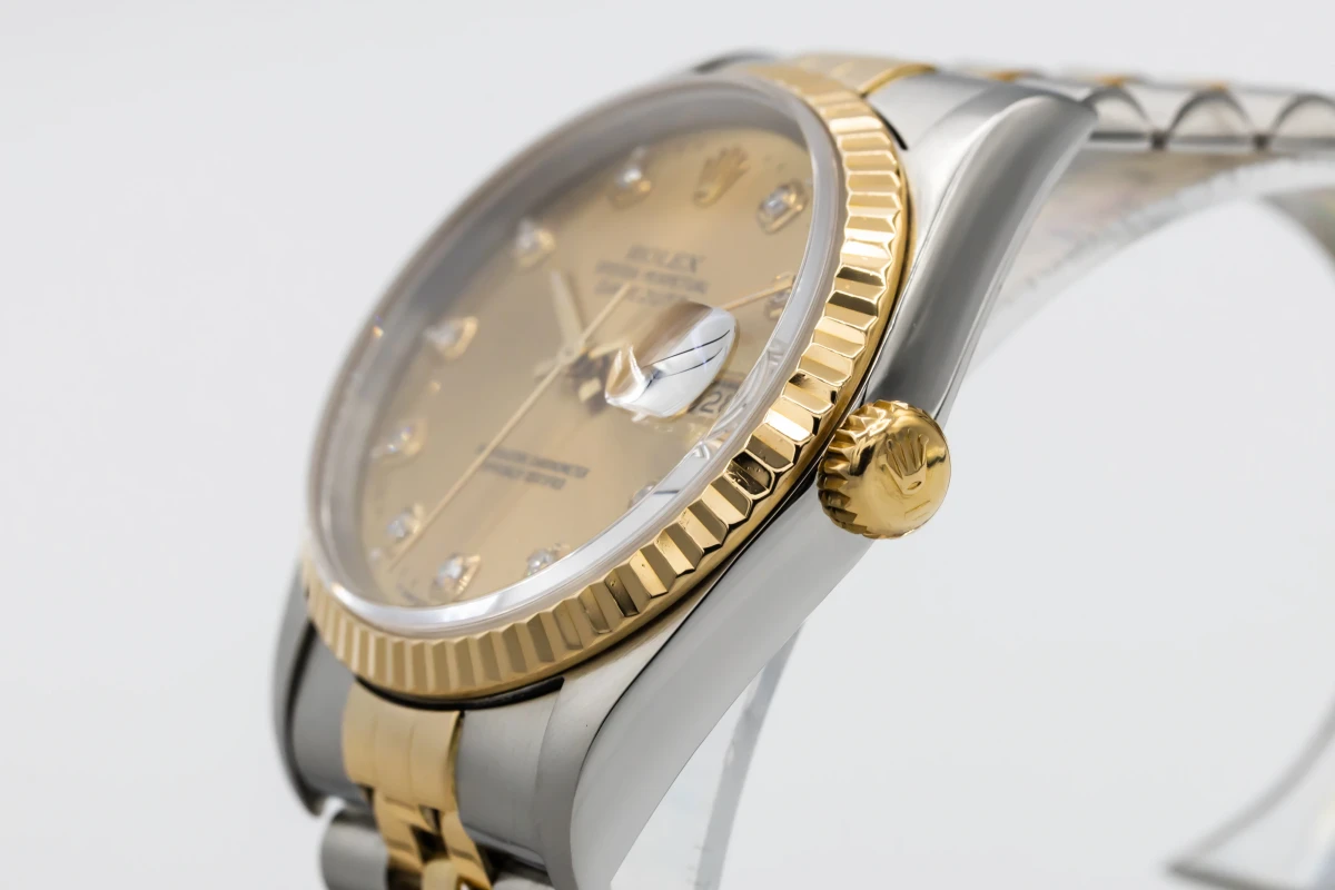 This 1995 Rolex DateJust 36mm features a champagne dial with factory diamond markers and a stainless steel and 18ct yellow gold jubilee bracelet. It also features a 18ct yellow gold fluted bezel.