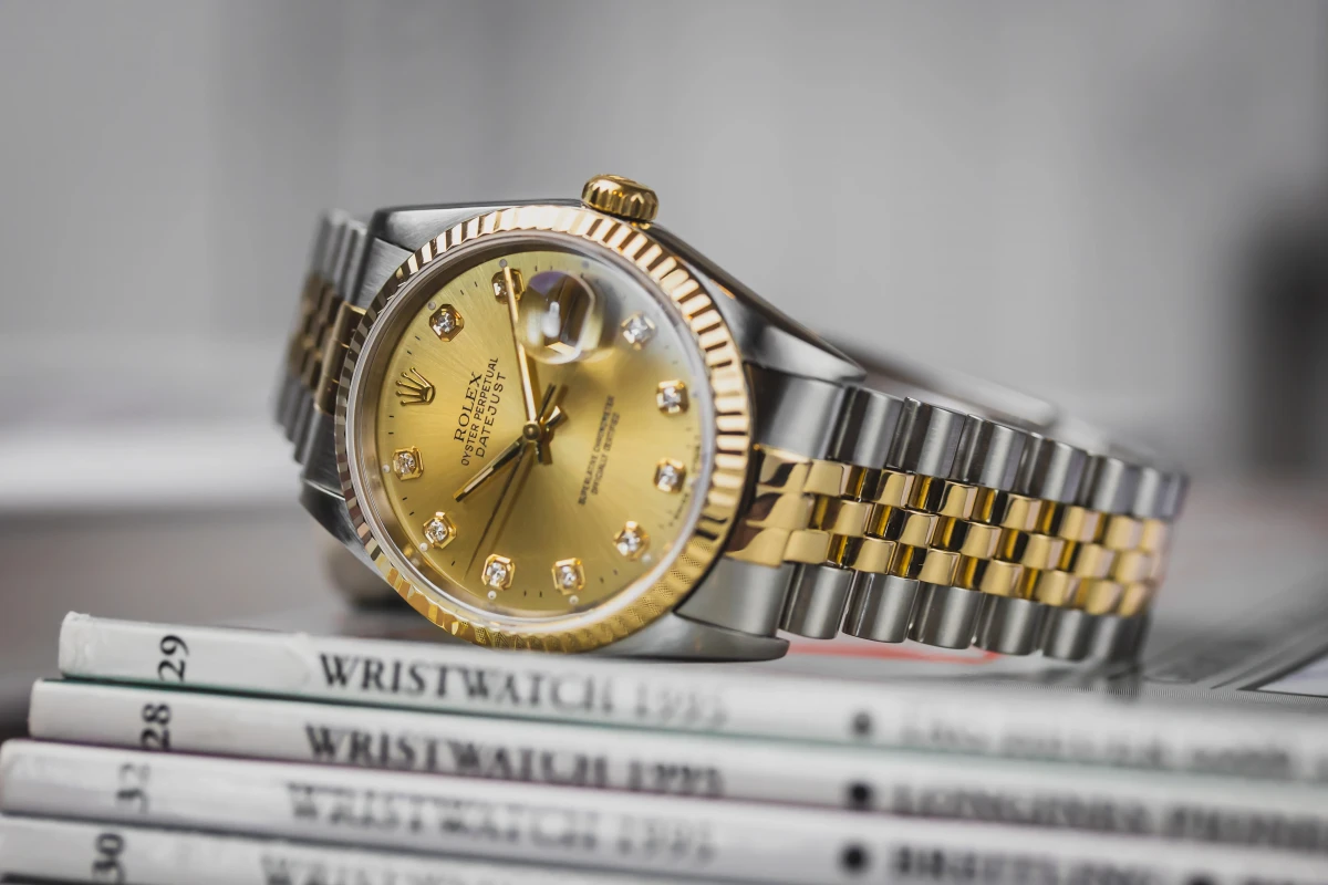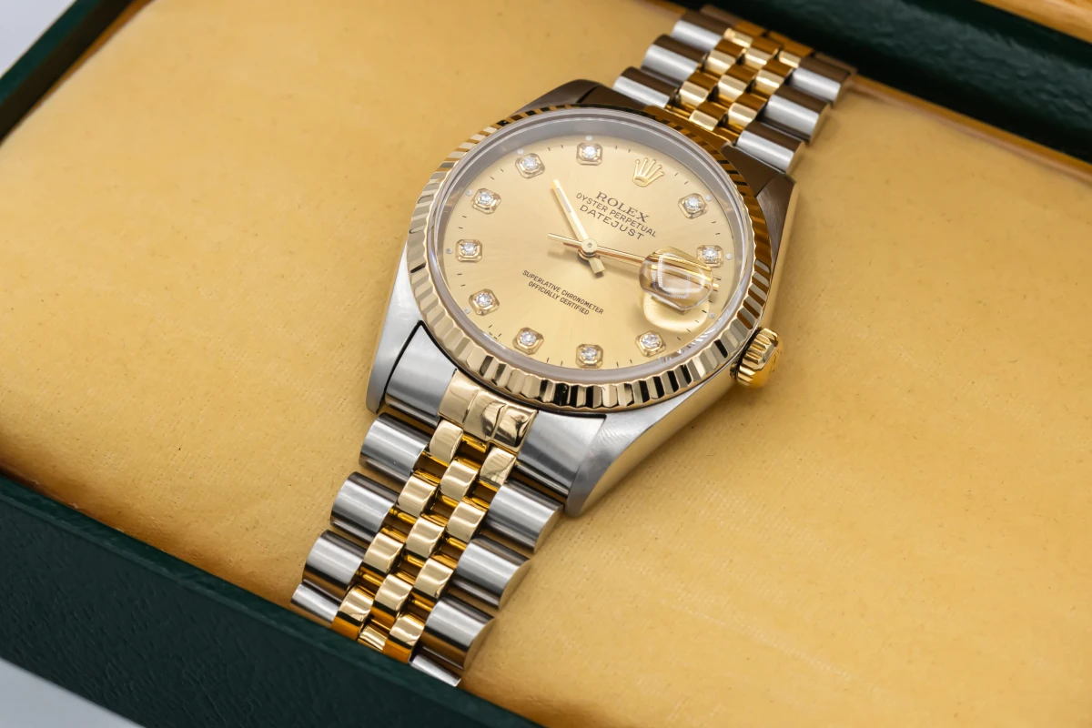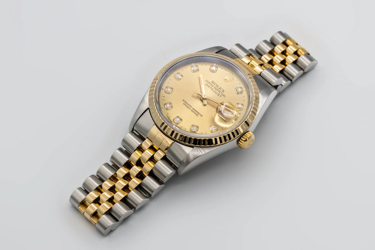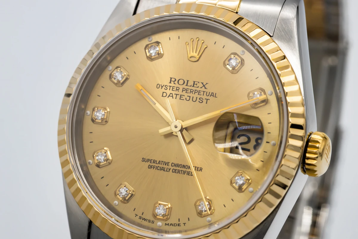 This 1995 Rolex DateJust 36mm features a champagne dial with factory diamond markers and a stainless steel and 18ct yellow gold jubilee bracelet. It also features a 18ct yellow gold fluted bezel.
